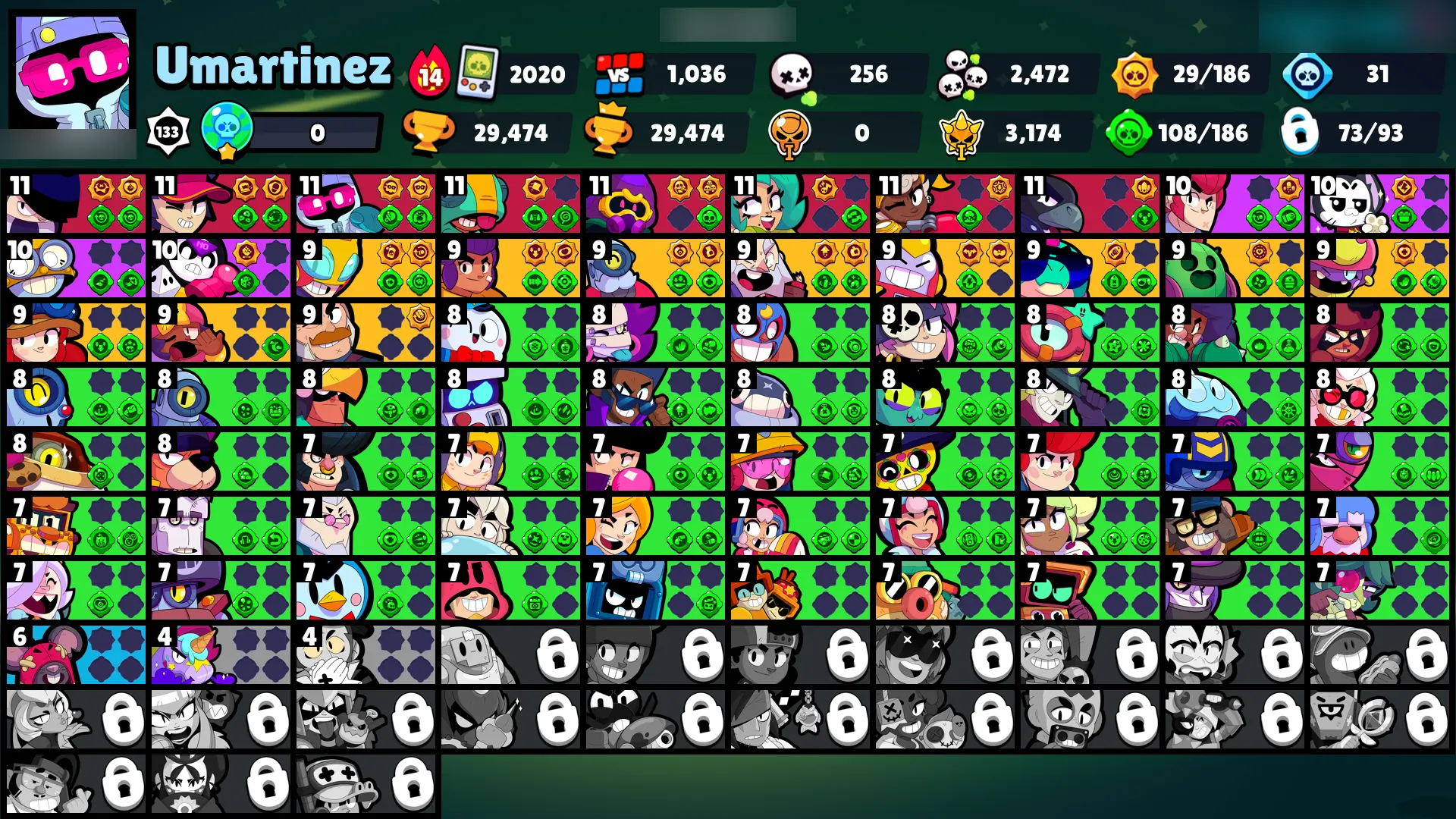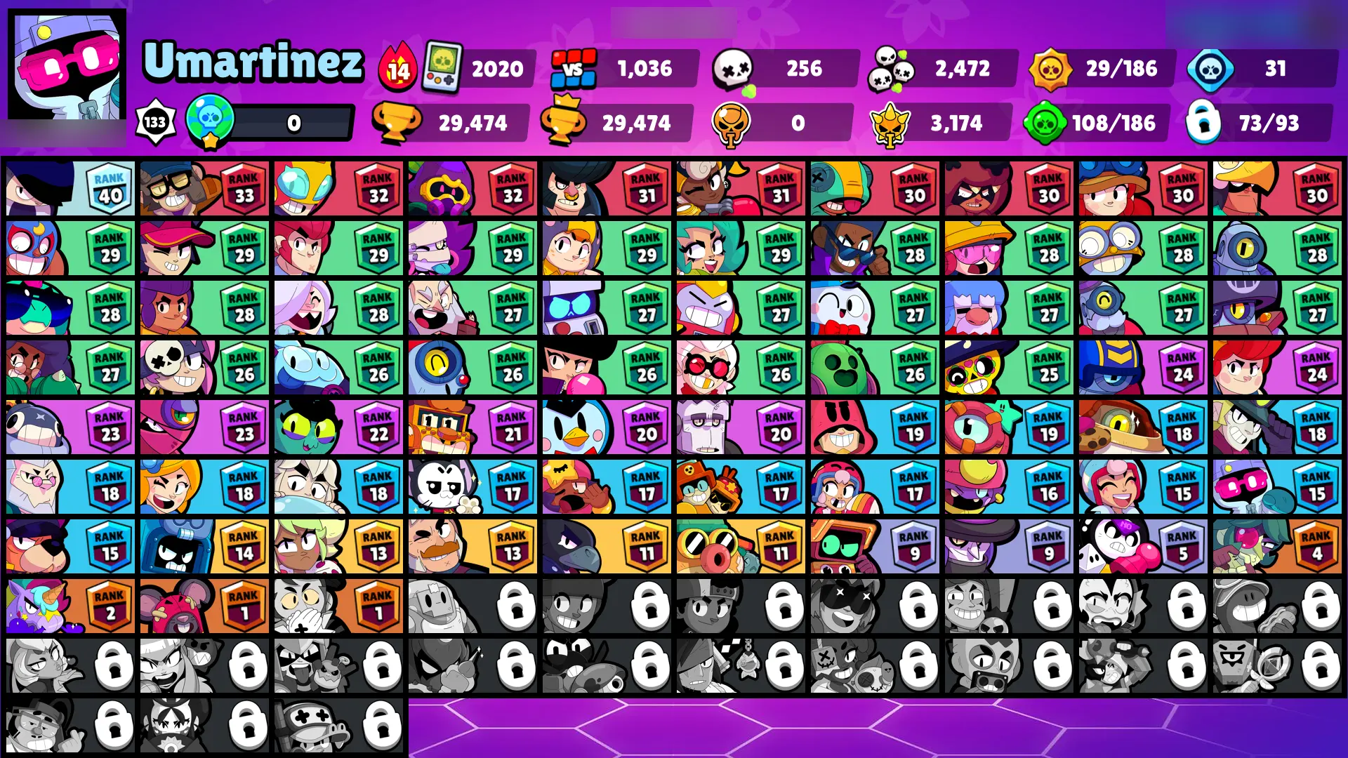 82 SKINS | 29474 TROPHIES | SURGE LIGHTYEAR | SHIBA NITA | WARRIOR BO | GALACTIC GALE | DARK CLOWN SAM | TECH MAISIE | DARK HORSE BERRY | GROUCH MICO | POISON CAP CORDELIUS | KITBOXER | SQUAD BUSTER SHELLY | DARK ANGEL COLT | VAMPRIMO | 73 BRAWLERS