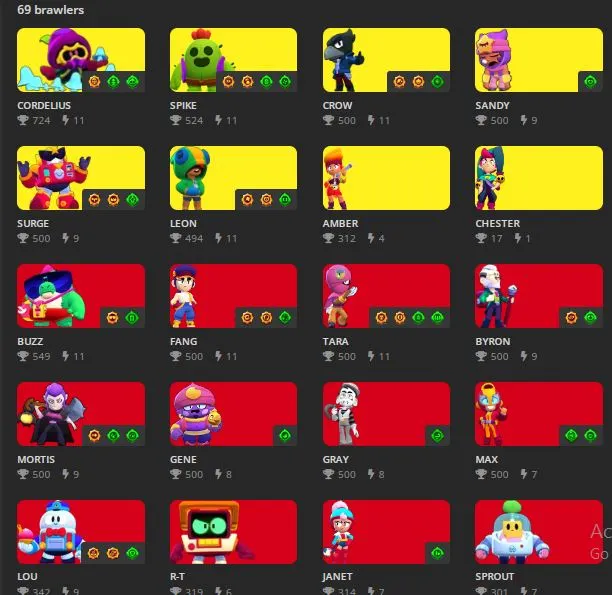 Brawl Stars : 69 Brawlers : 8 Legends : CORDELIUS ; SPIKE ; CROW ; SANDY ; SURGE ; LEON ; AMBER ; CHESTER