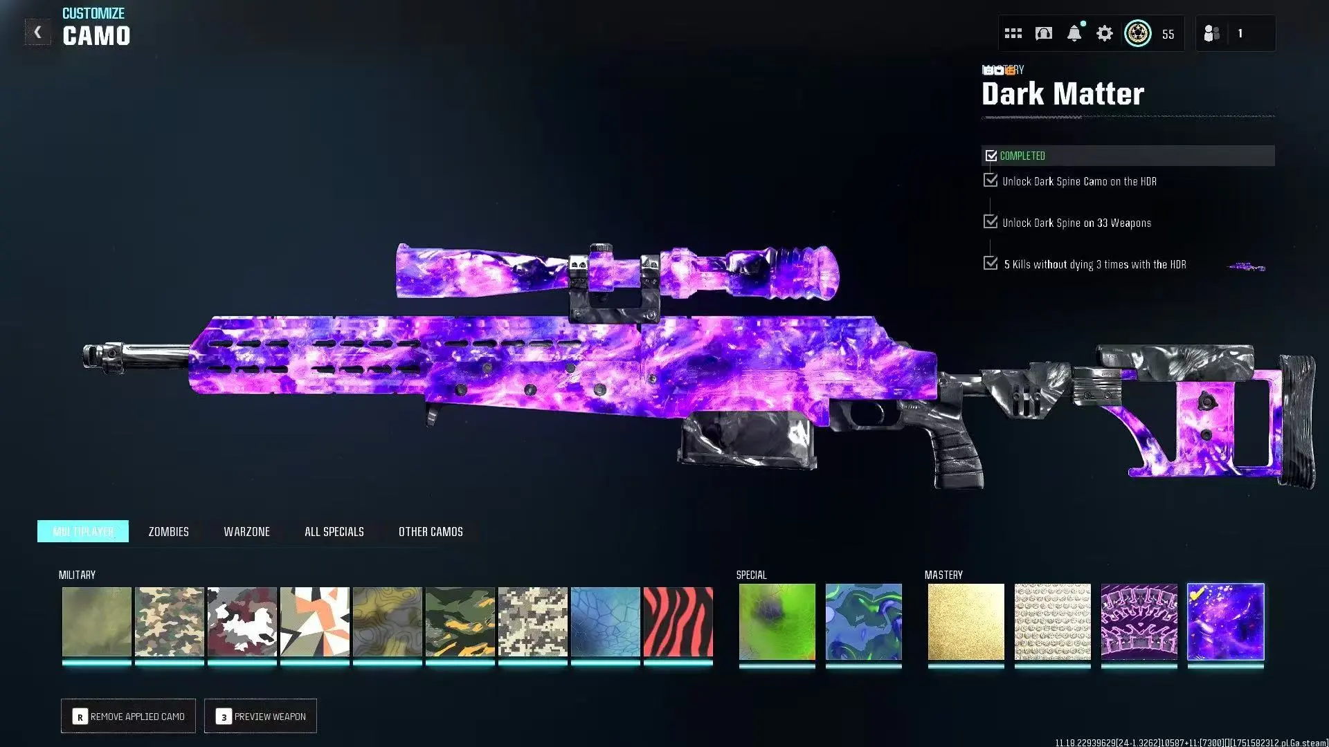 🎮 BO6【XBOX/PSN/STEAM】🌌 64 DARK MATTER CAMOS ✅ | 🖤 64 DARK SPINE CAMOS ✅ | 🔨 PURELY HANDMADE UNLOCK | 🥇 50 WINS | 🔫 SPECIAL WEAPONS INCLUDED | 🔓 FULL ACCE