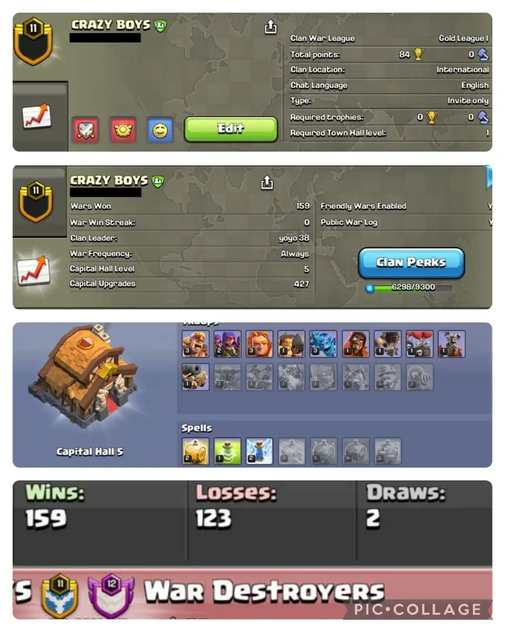🔥NAME- CRAZY BOYS | 💥LVL- 11 |☠️ WARLOG W-L-D: 159-123-2 | CWL LEAGUE : GOLD 1🏆 | CC: NEAR 6!!⚡⚡
