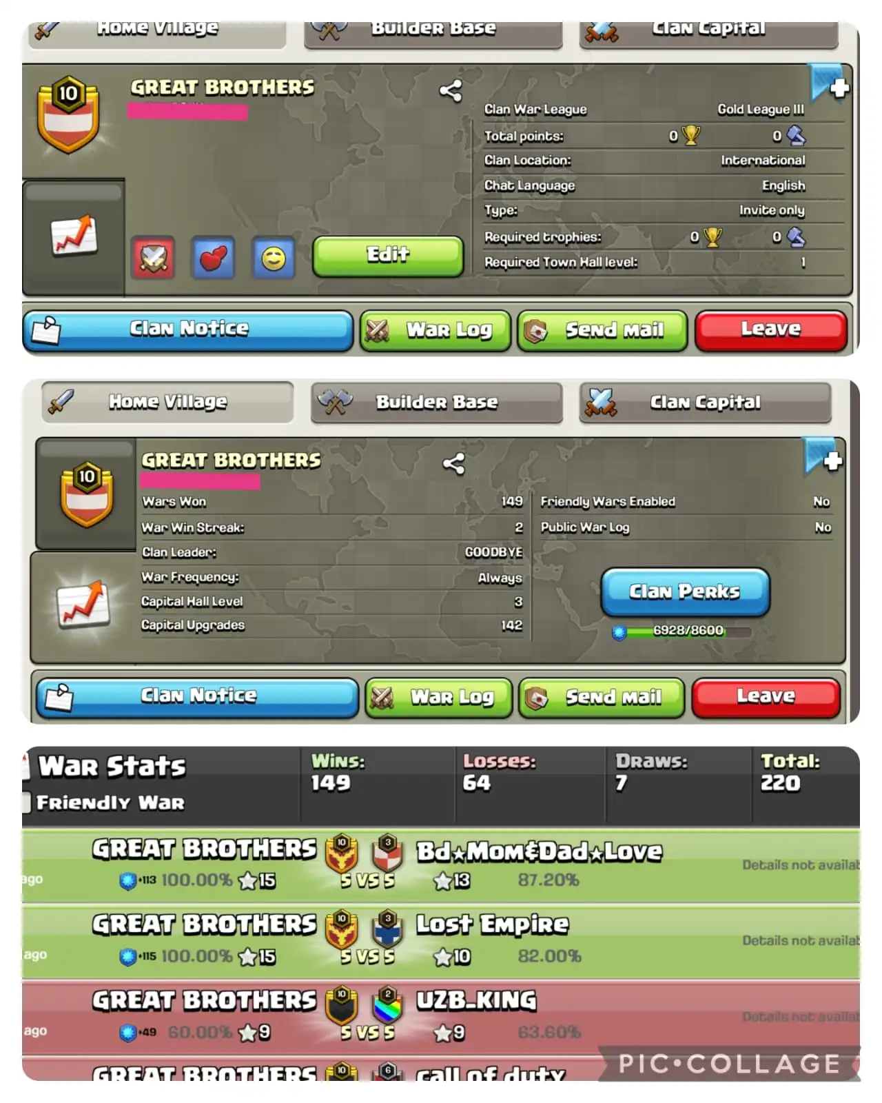 🏆NAME : GREAT BROTHERS🥶 LEVEL : 10.8 ⛈️ WARLOG W-L-D : 149-64-7 ⚡️