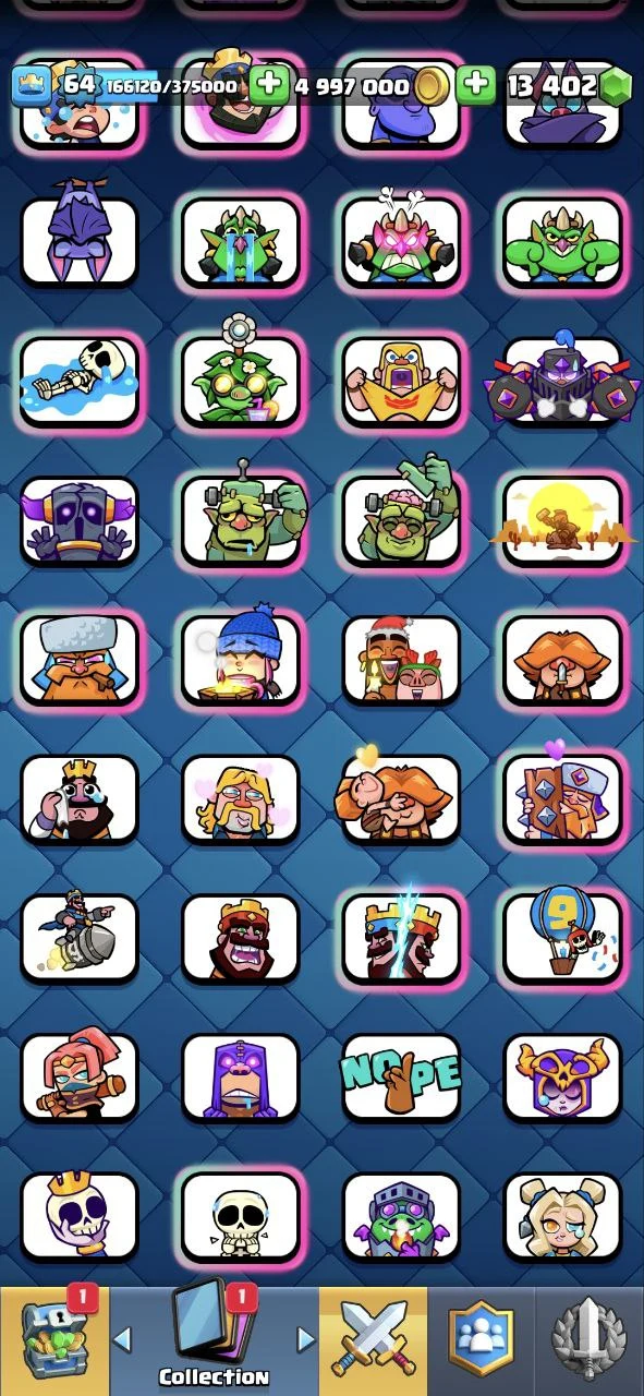 30% OFF ✨ RARE EMOTES ✨ KT 15 🔱 LVL 64 🏆 CUPS [10900] ✨ MAX CARDS [111] ✨ ELITE [42] ✨ EVO [18] ✨ LVL 14 [69] ✨ GEMS [13000] ✨ELITE WILD CARDS[3.6Lakh] ✨ EMOTES [138] ✨ SKINS [17] 🔱 CARDS [121] ✨ 10000% SAFE