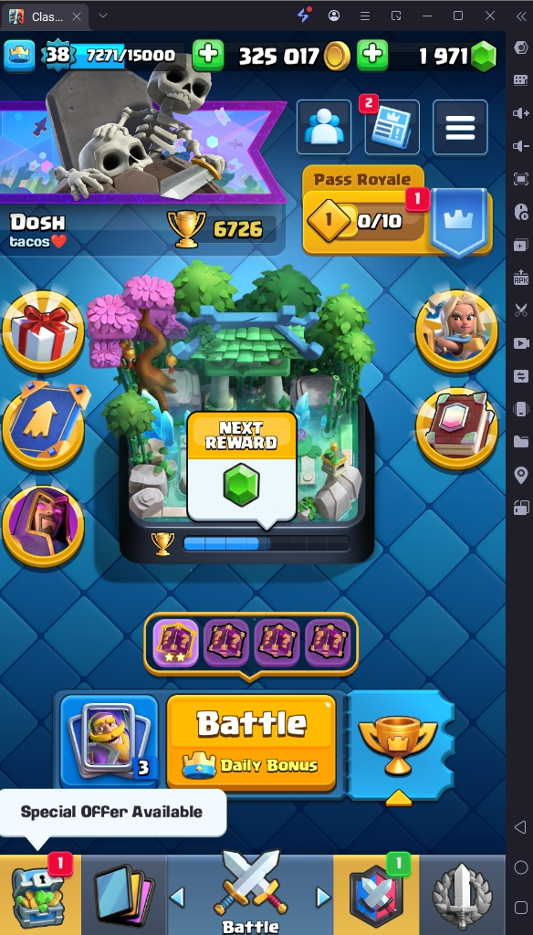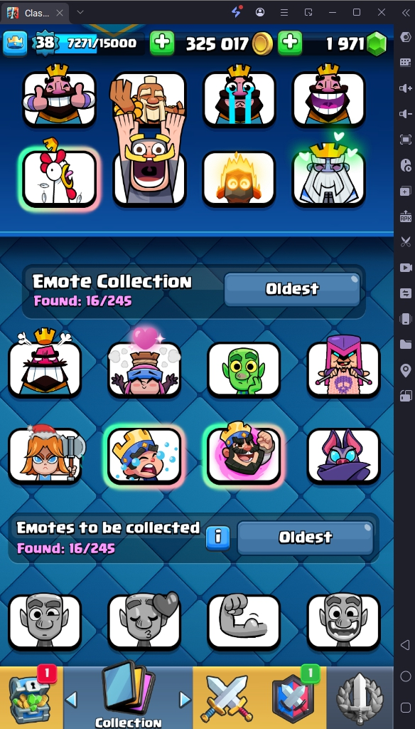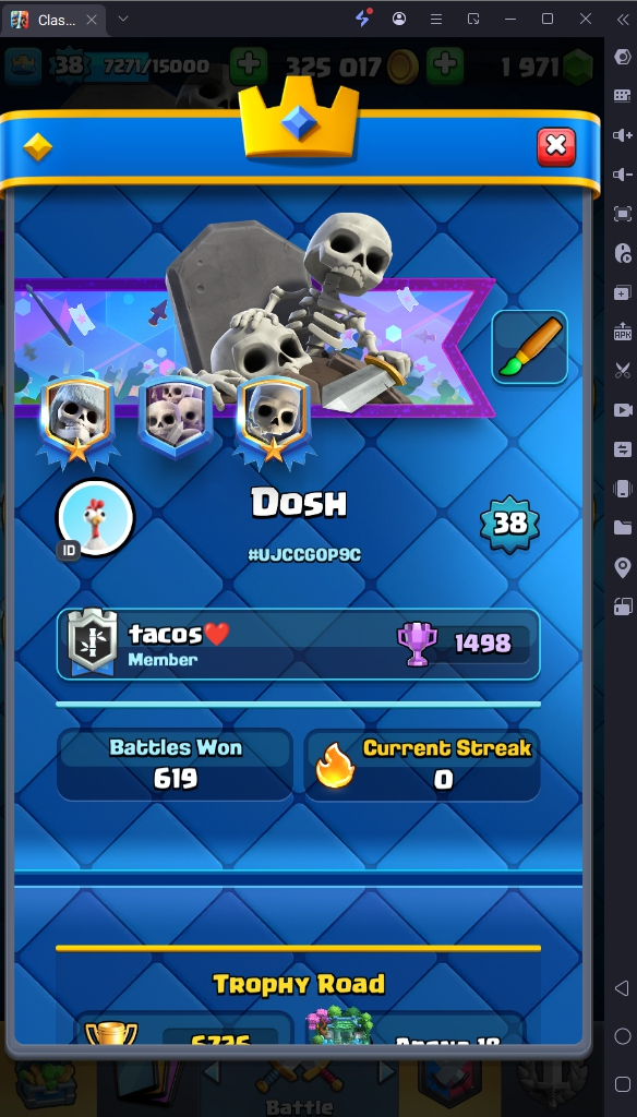 6726 TROPHY 🏆 38 LVL 💯 KT 13 👑 114 CARDS ♦️ 0 MAX CARDS 👑 1 ELITE CARDS 🔮 2 EVO 💯 EMOTE 16 🎭 #UJCCG0P9C ⸱ TAG ACCOUNT ♥️