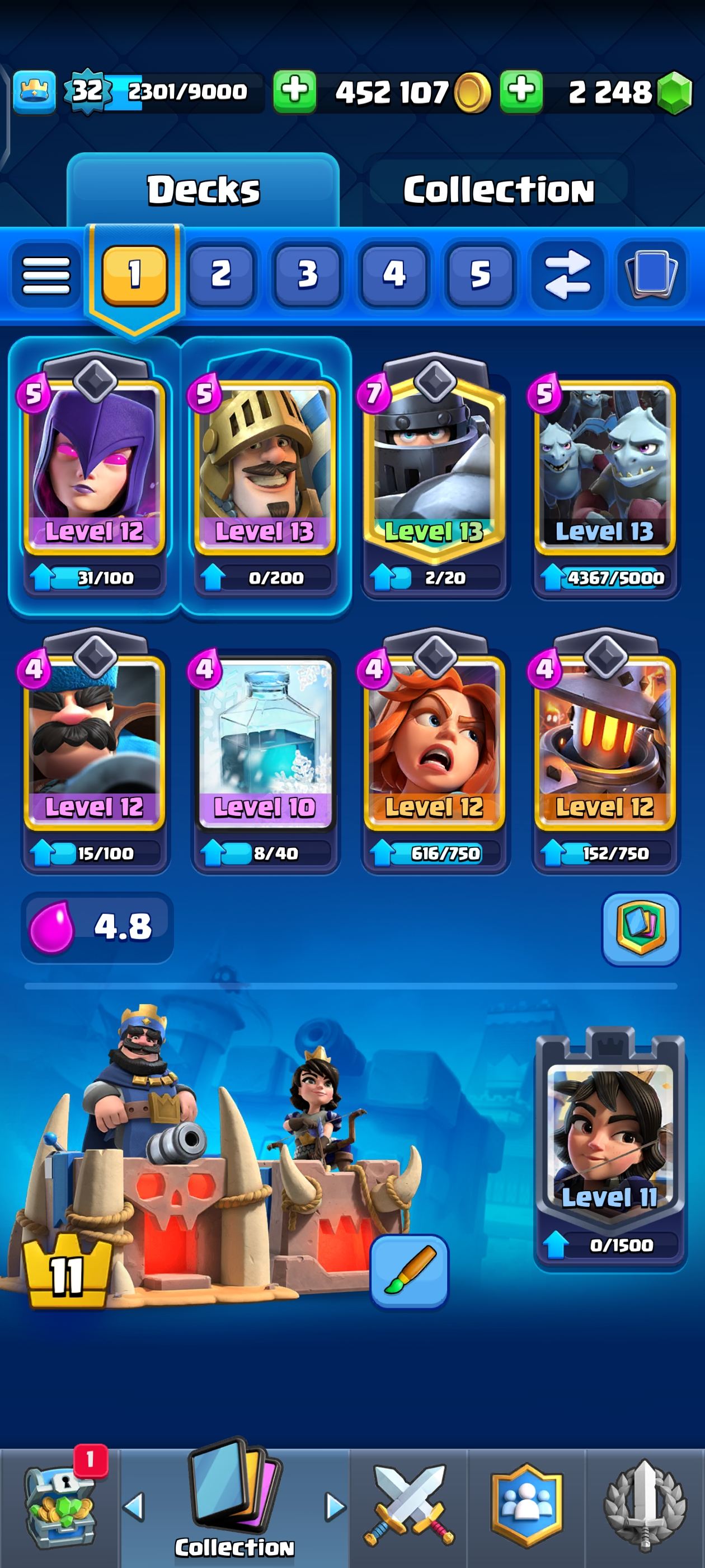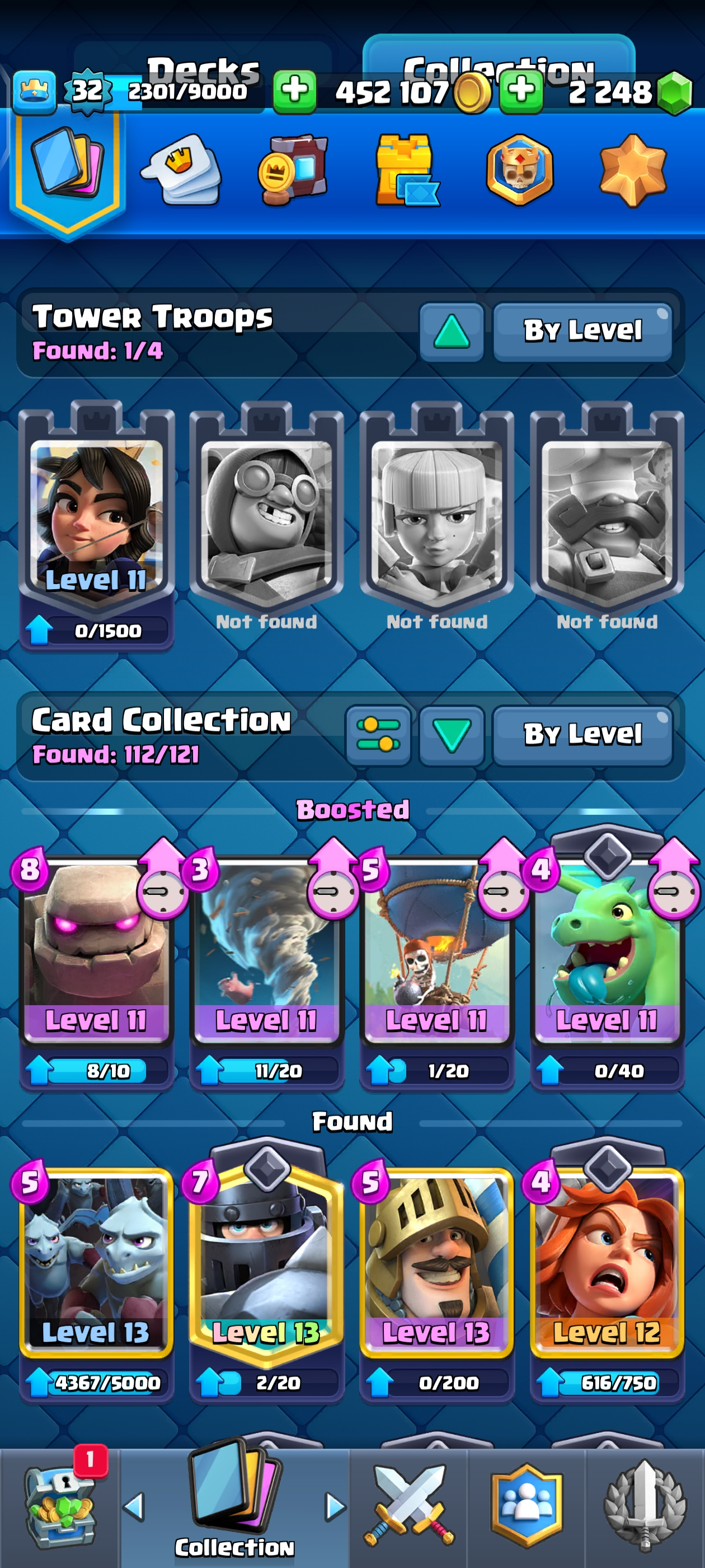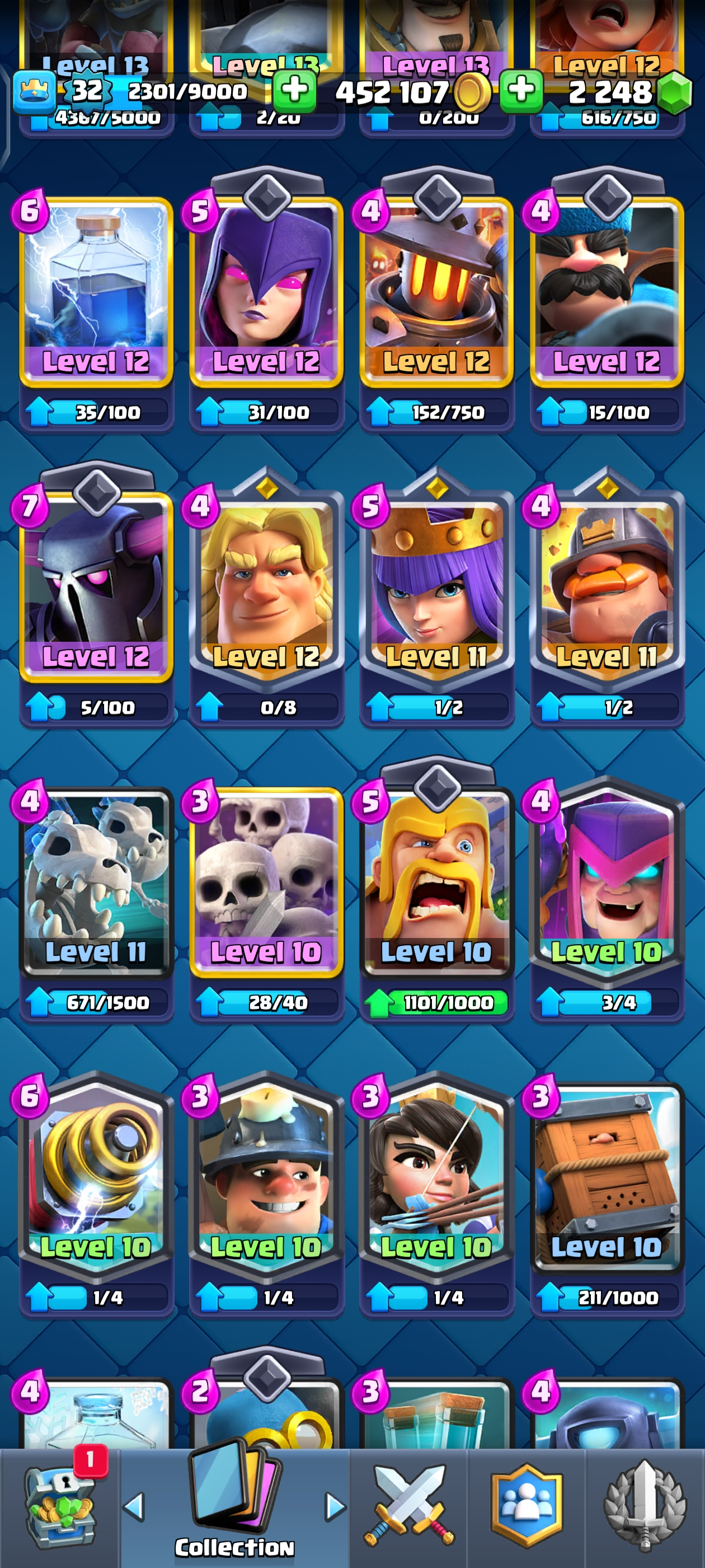 6864 Trophies π | 4 Years old π | (3x Lvl 13, 10x Lvl 12) | KT: 11 π | Level: 32 | Arena 18 π― | 112 Cards π | 452,107 Gold πͺ | 17 Emotes | NC: FREEΒ π | β‘ Instant Delivery π | See Pics for Full Details! π