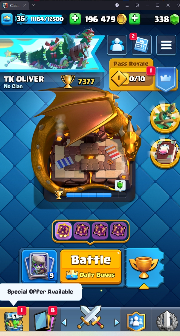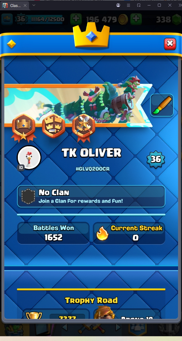 7377 TROPHY 🏆 36 LVL 💯 KT 12 👑 115 CARDS ♦️ 1 MAX CARDS 👑 0 ELITE CARDS 🔮 5 EVO 💯 EMOTE 26 🎭 #GLVQ200CR ⸱ TAG ACCOUNT ♥️
