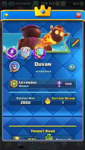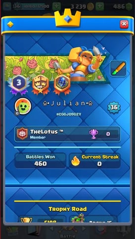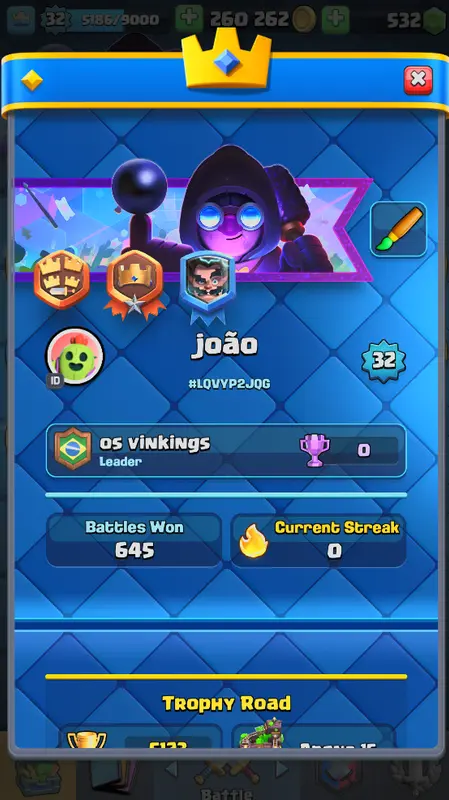 CL5485 KT 11 LEVEL 32 | 3 Evolution | Trophies:5123 | 111 Cards | 3 Cards (12LVL) | 2 Tower Skins | 22 Emotes | 260K Gold | 532 Gems | IOS/ANDROID