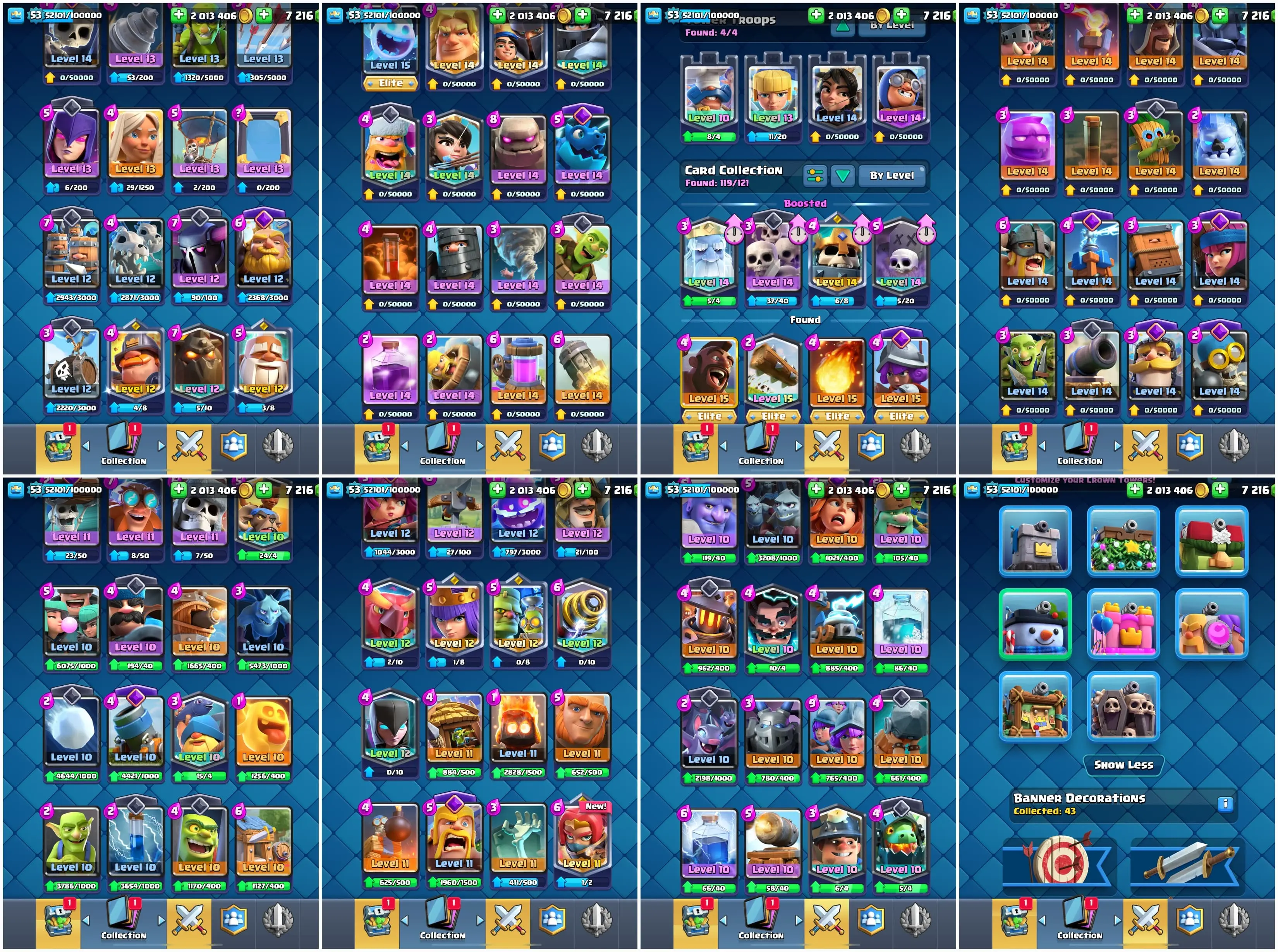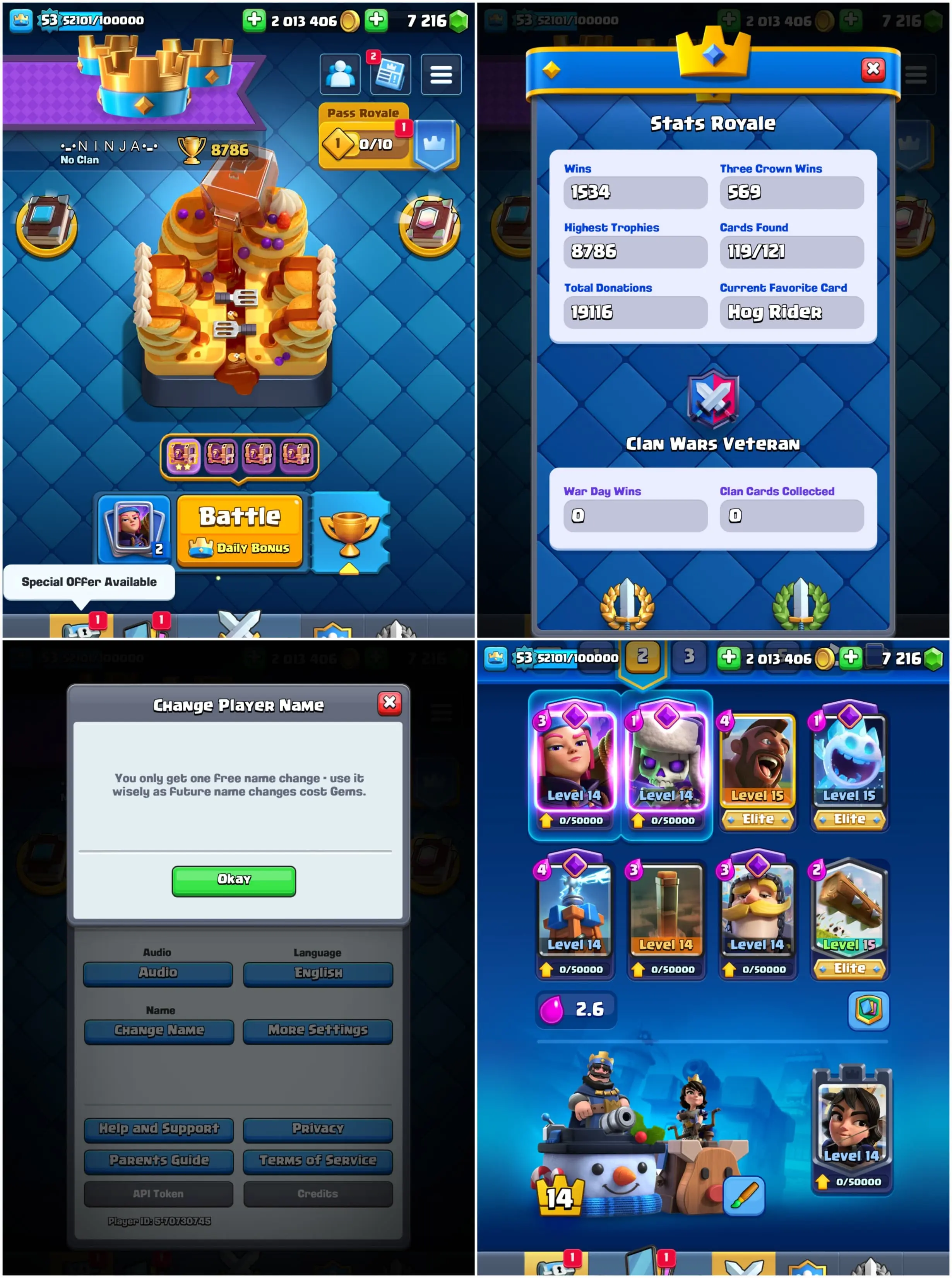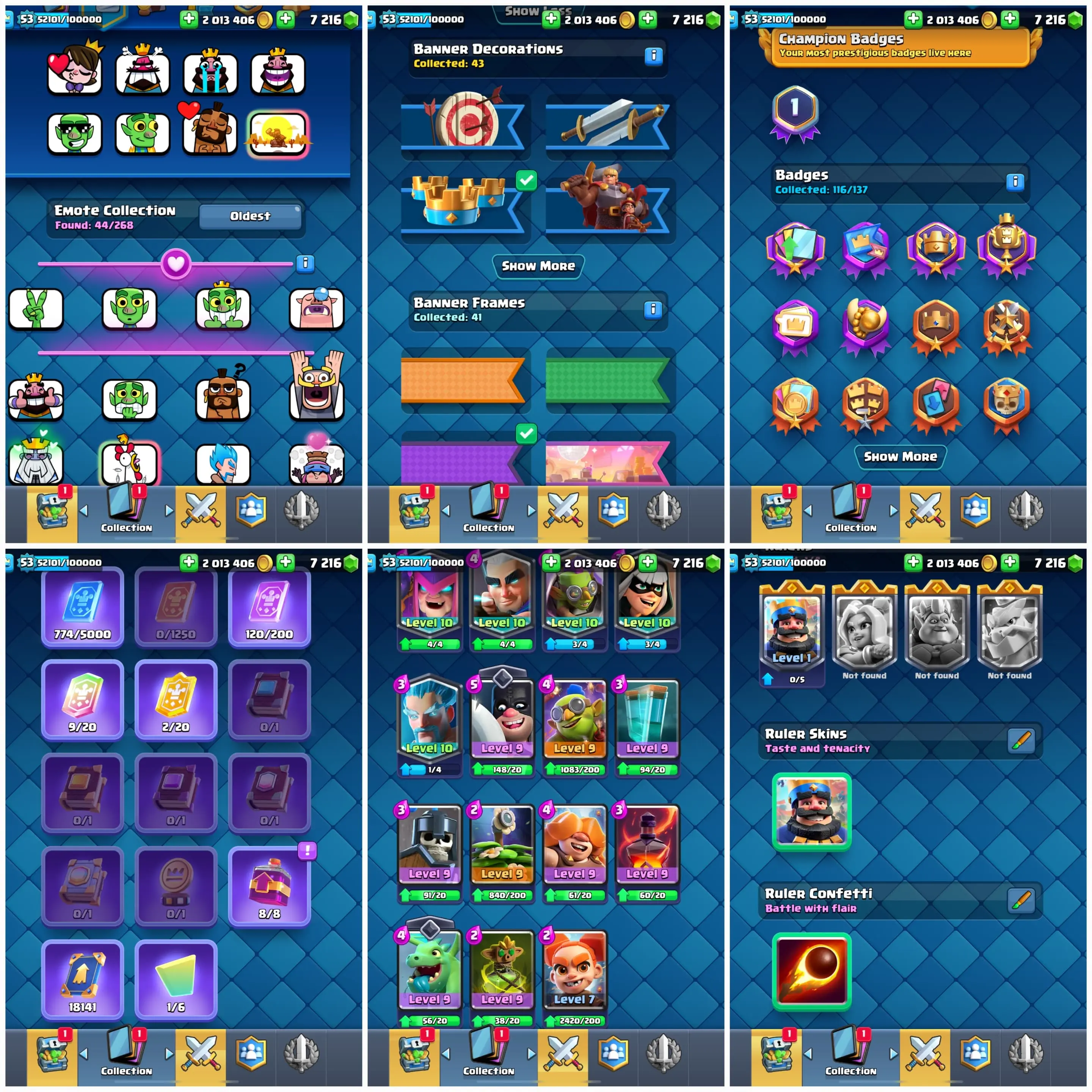 🤯 Crazy Level 53 + 👑 KT 14 🎭 44 Emotes 🏆 8,700+ Trophies ⚔️ 37 Max Cards {5 Elites} + ✨ 15 Evos 💰 2M Gold 💎 7K Gems✏️ Name Changable 📱 Android & iOS ⚡ Instant Delivery