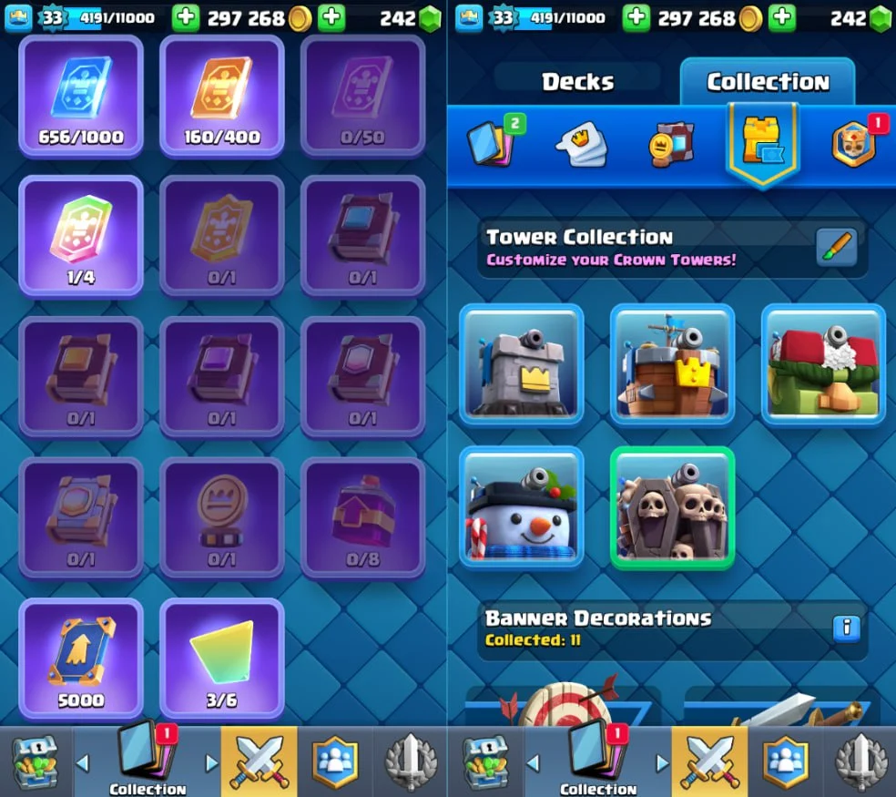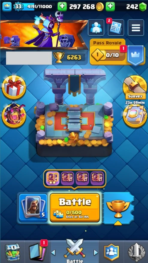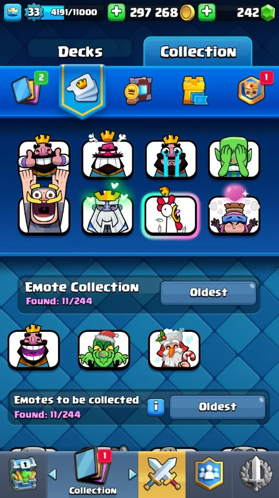 ๐ KT 11 ๐ 6263 Trophy ๐ 33 LVL ๐ 113 Cards ๐ 11 Emotes ๐ 242 Gems ๐ 297 k Gold ๐