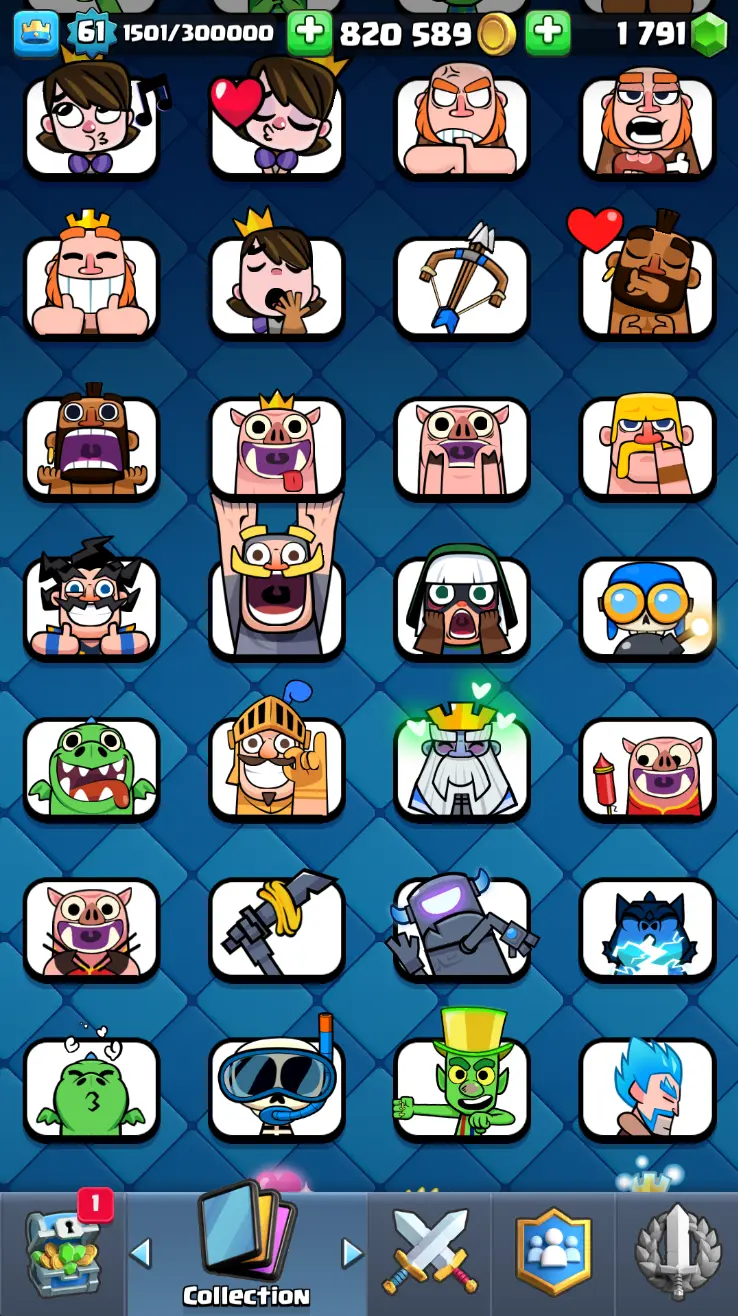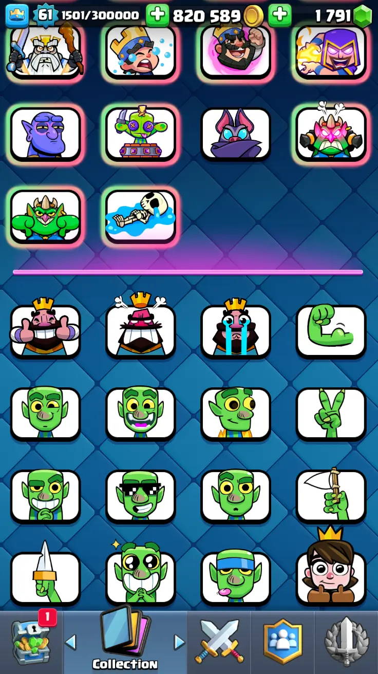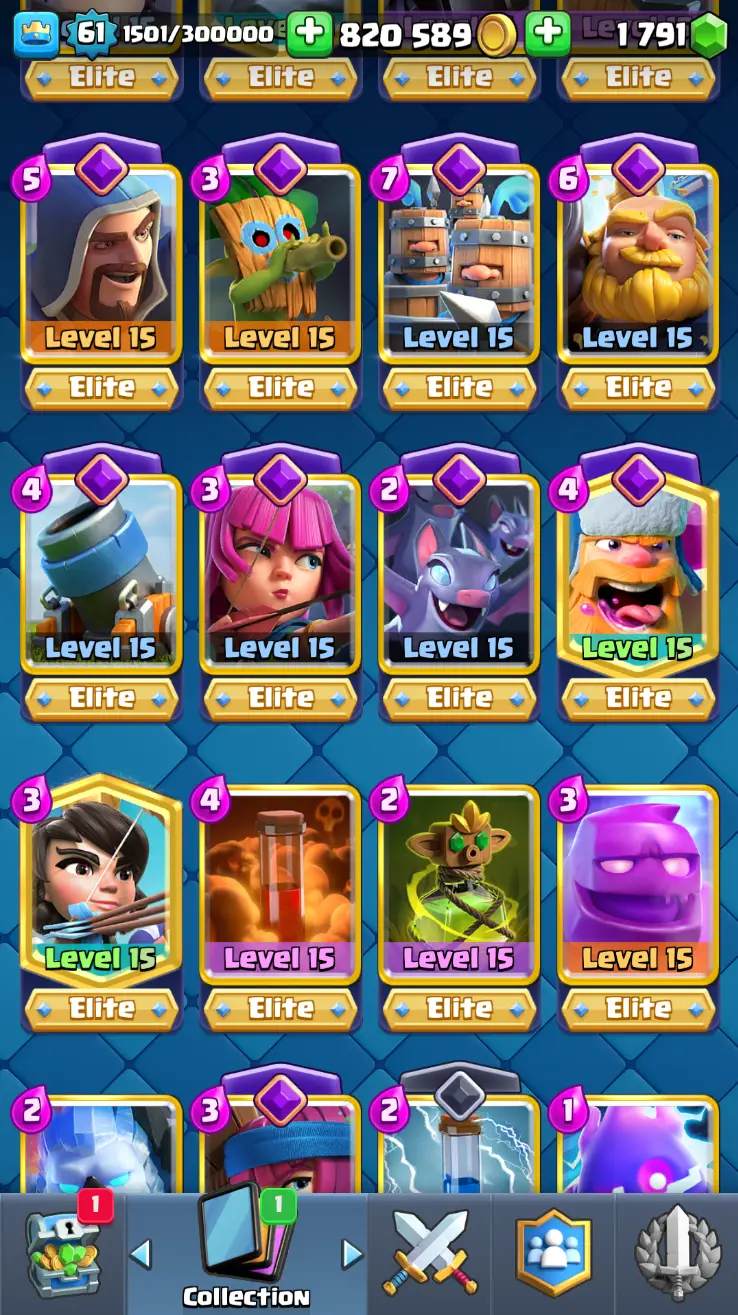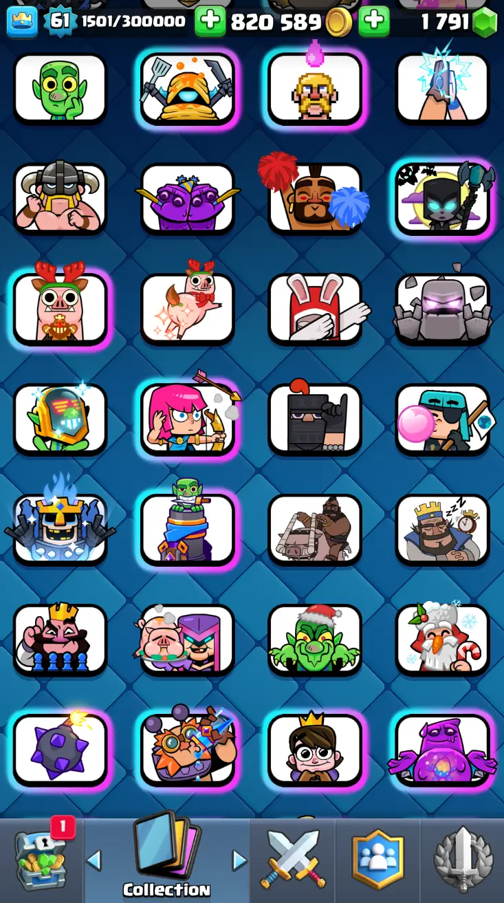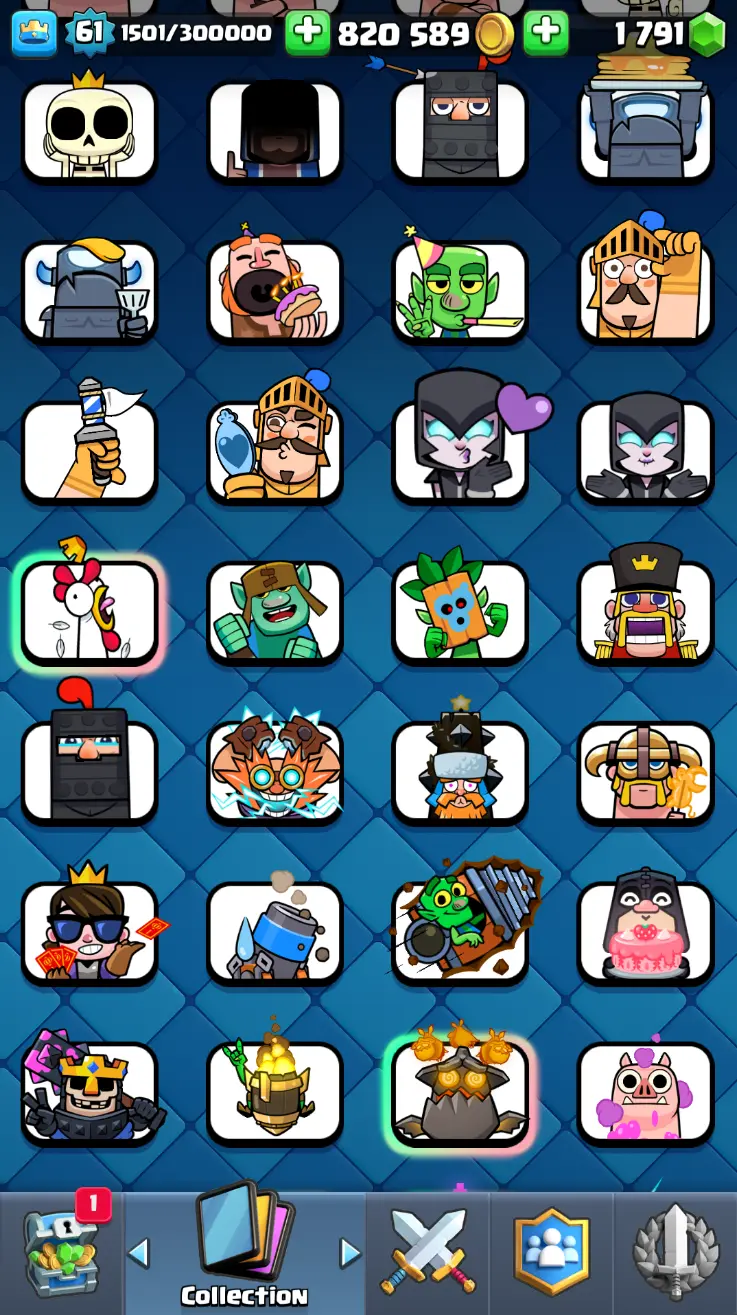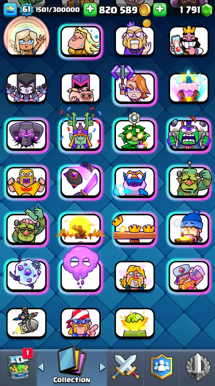 ◀️ KT 15 ▶️ LEVEL 61 🤩 10590 TROPHIES 🏆 24 ELITE CARD 🙀 78 MAX CARD 😎 29 EVO ☠️ 185 EMOTE 😍 35 SKIN 👽 121 CARDS 💳 820k GOLD 💰 1791 GEMS 💎 RL146