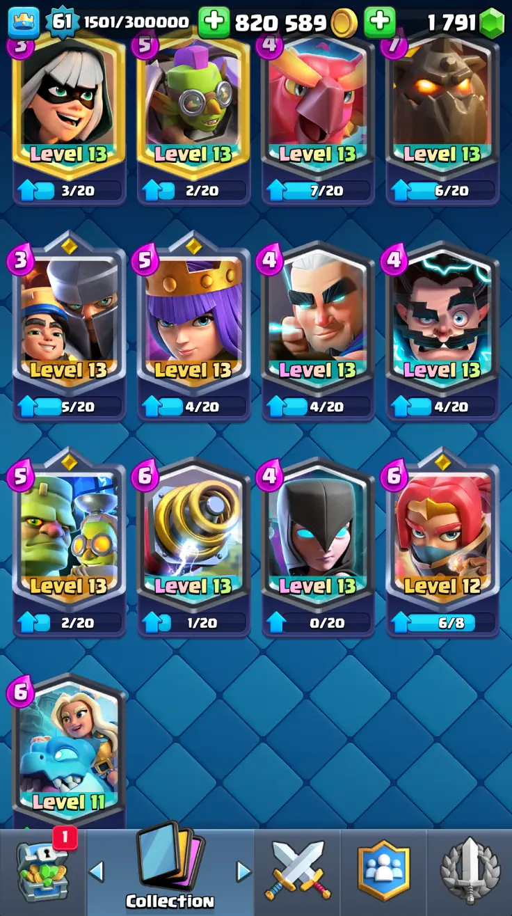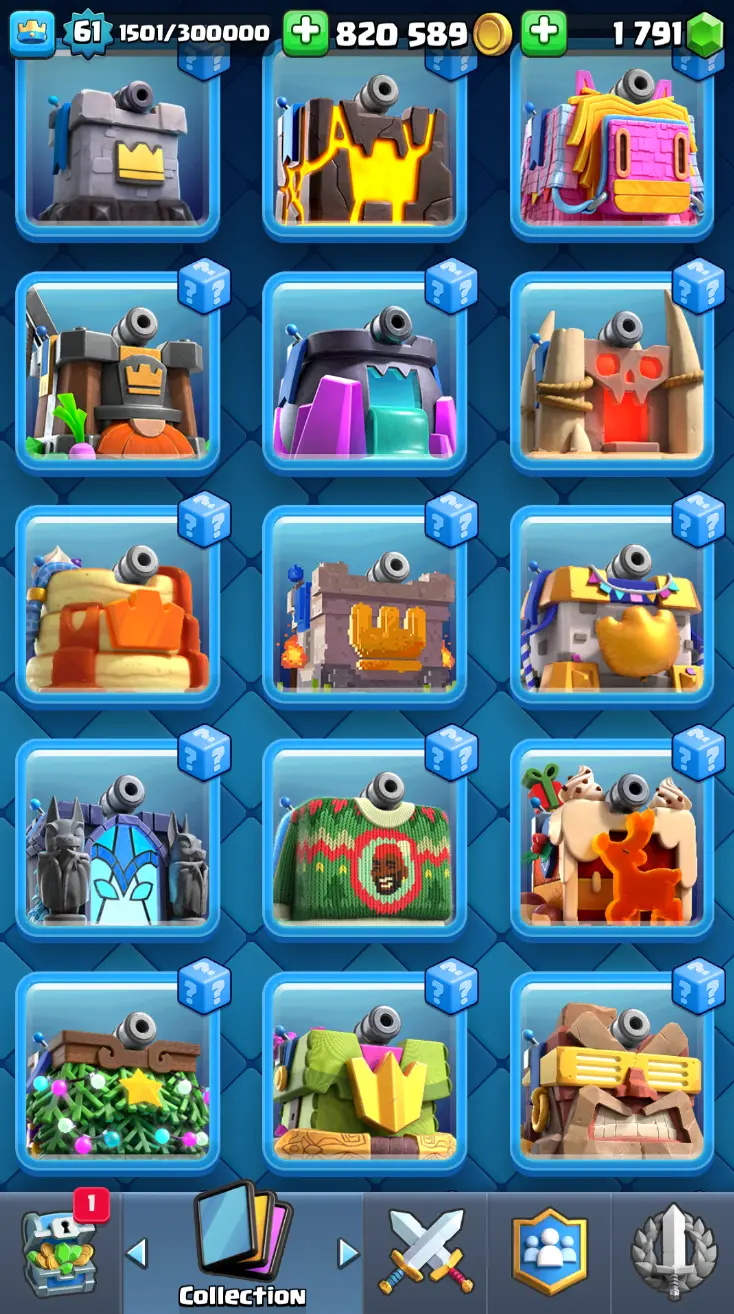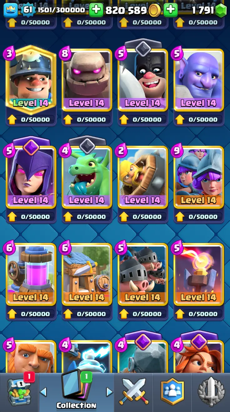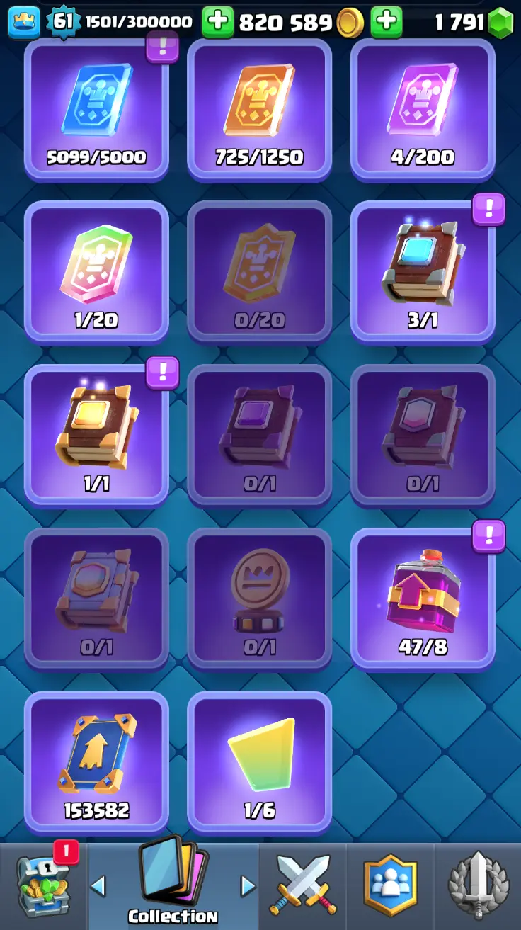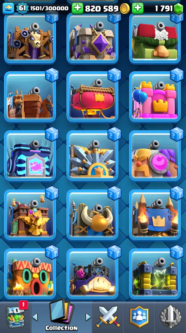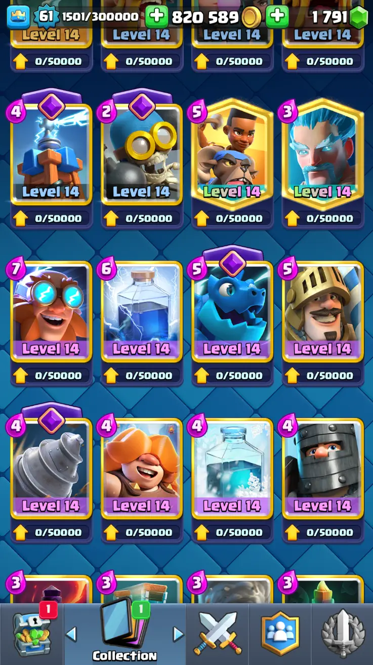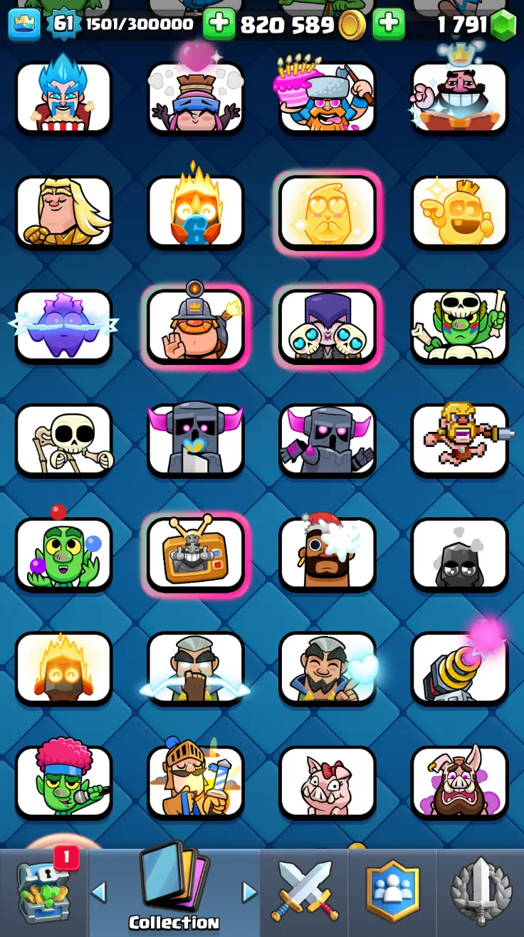 ◀️ KT 15 ▶️ LEVEL 61 🤩 10590 TROPHIES 🏆 24 ELITE CARD 🙀 78 MAX CARD 😎 29 EVO ☠️ 185 EMOTE 😍 35 SKIN 👽 121 CARDS 💳 820k GOLD 💰 1791 GEMS 💎 RL146