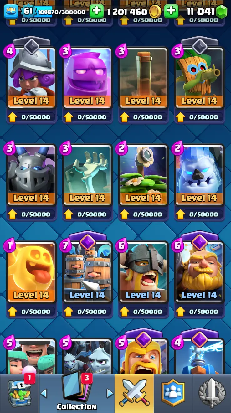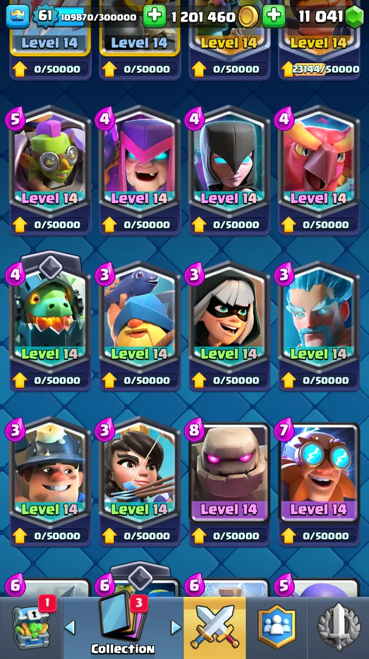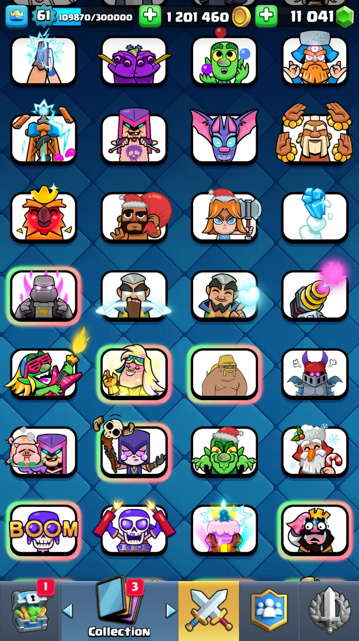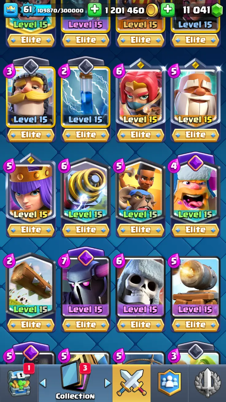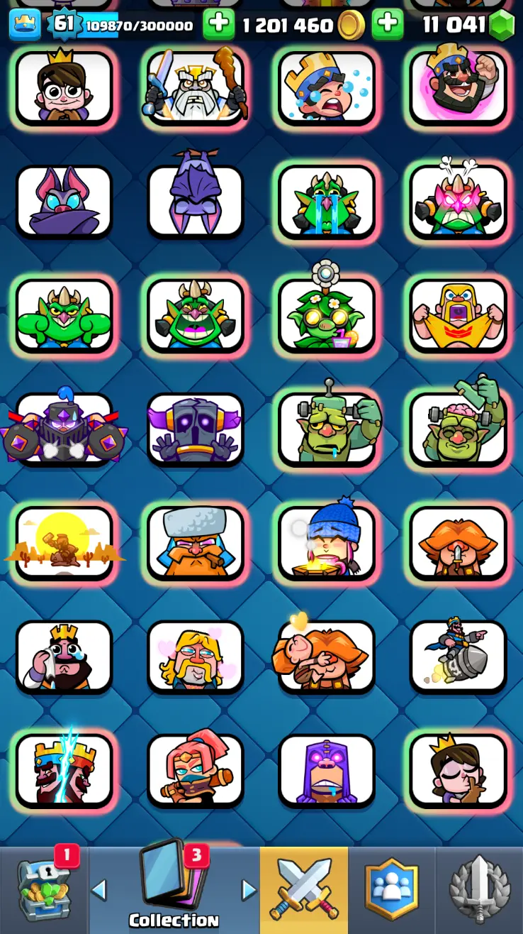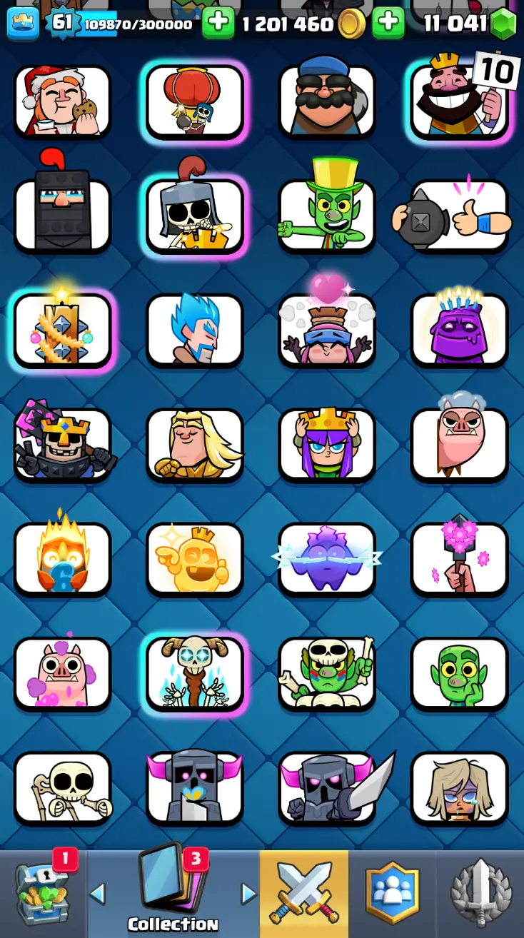 ◀️ KT 15 ▶️ LEVEL 61 🤩 13205 TROPHIES 🏆 27 ELITE CARD 🙀 89 MAX CARD 😎 18 EVO ☠️ 116 EMOTE 😍 9 SKIN 👽 121 CARDS 💳 1.2m GOLD 💰 11041 GEMS 💎 RL143