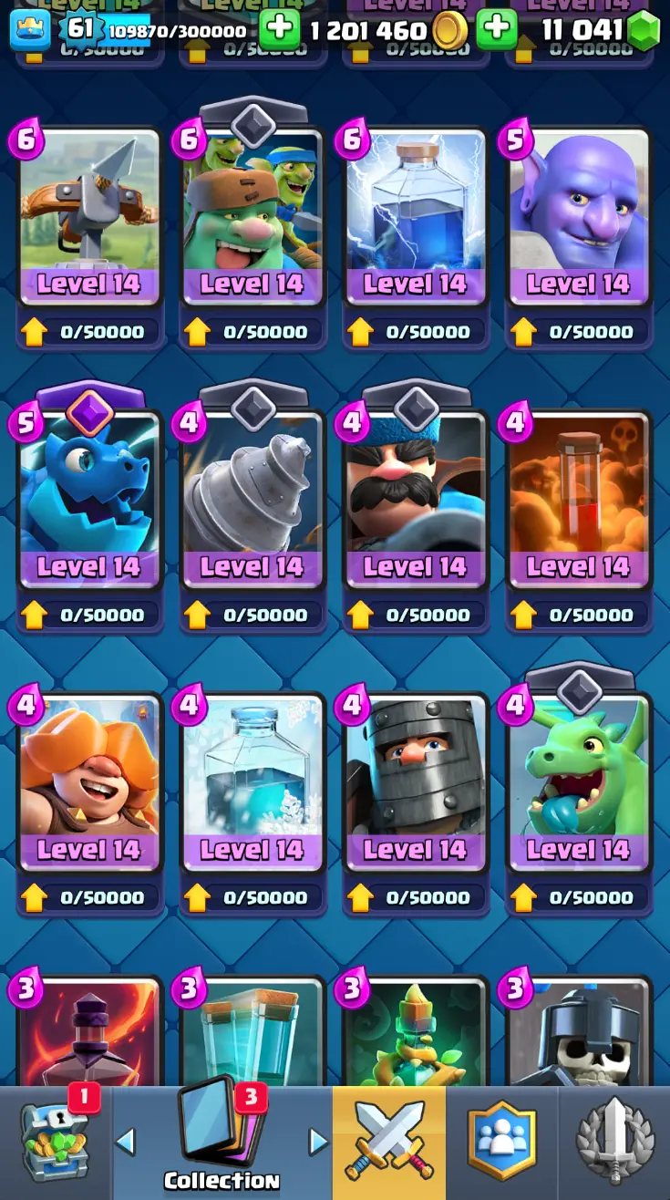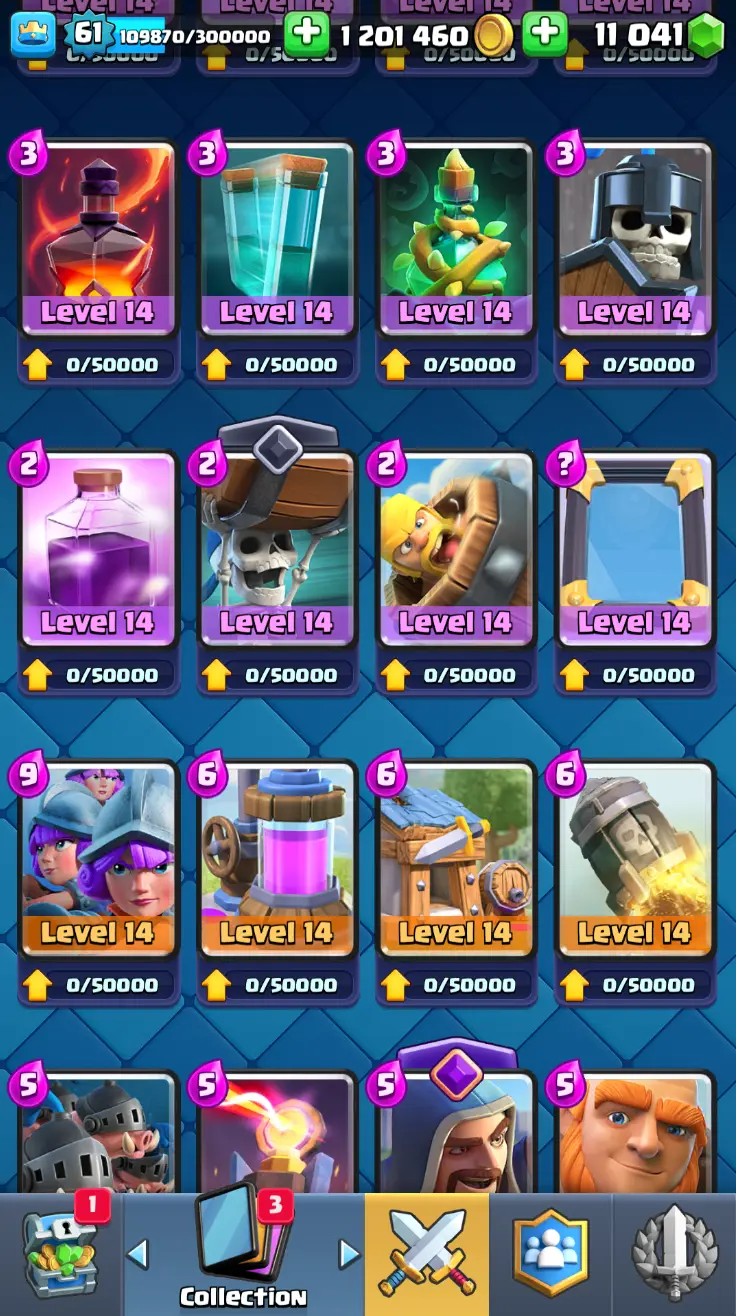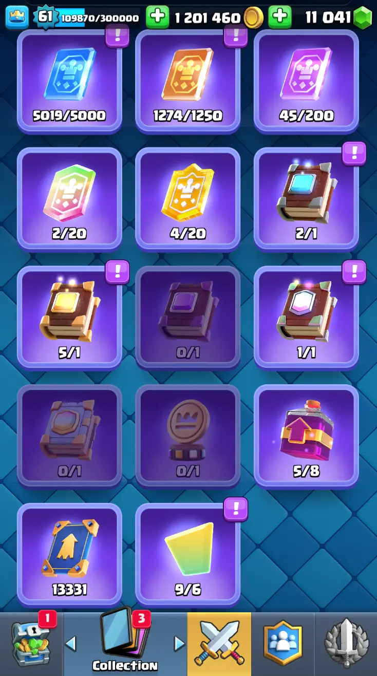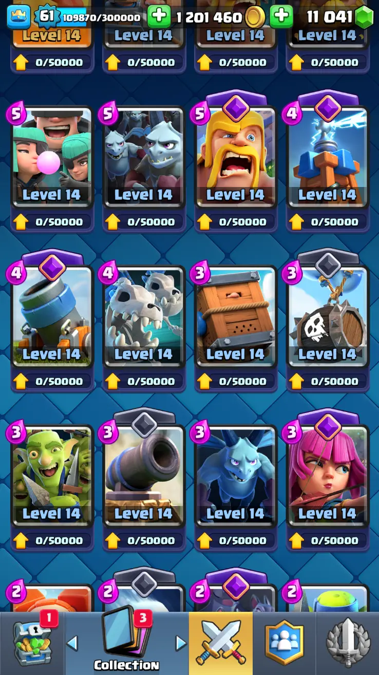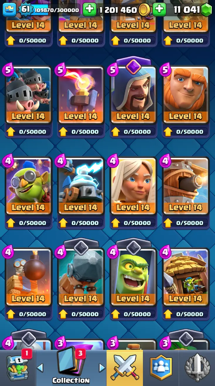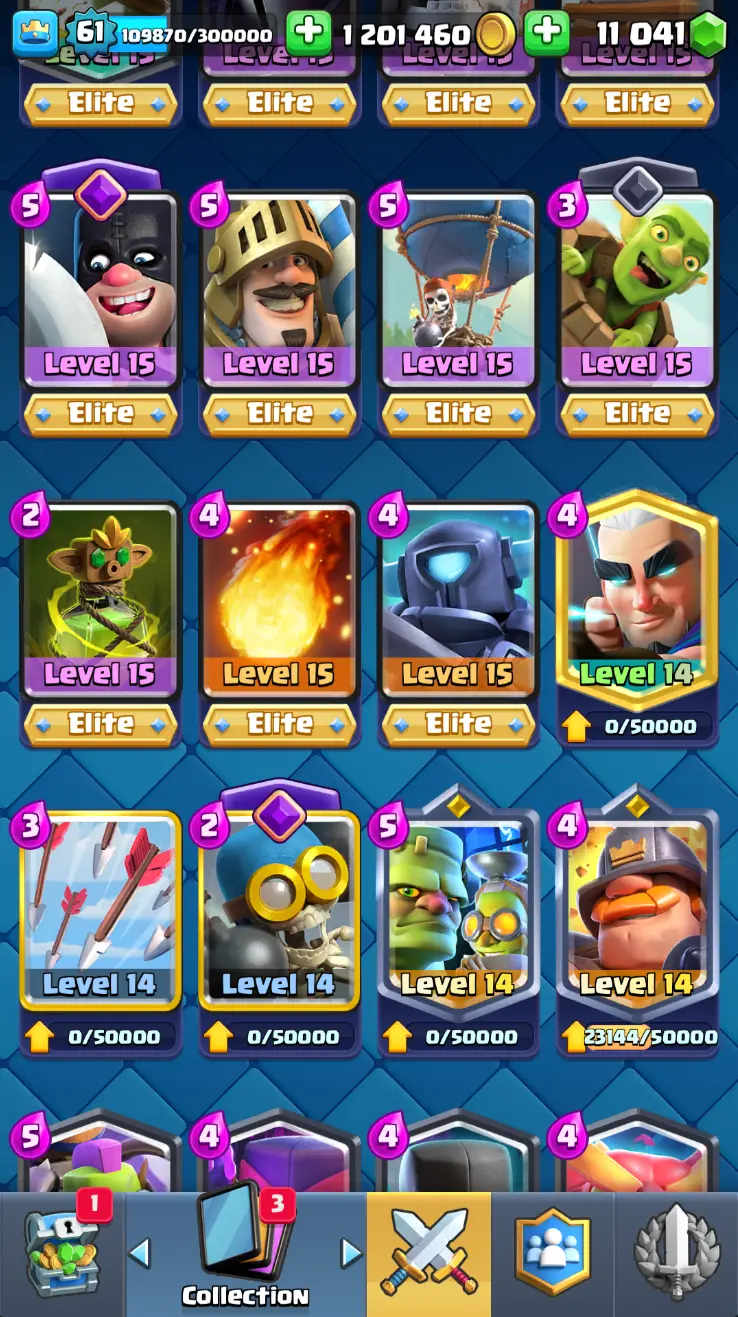 ◀️ KT 15 ▶️ LEVEL 61 🤩 13205 TROPHIES 🏆 27 ELITE CARD 🙀 89 MAX CARD 😎 18 EVO ☠️ 116 EMOTE 😍 9 SKIN 👽 121 CARDS 💳 1.2m GOLD 💰 11041 GEMS 💎 RL143