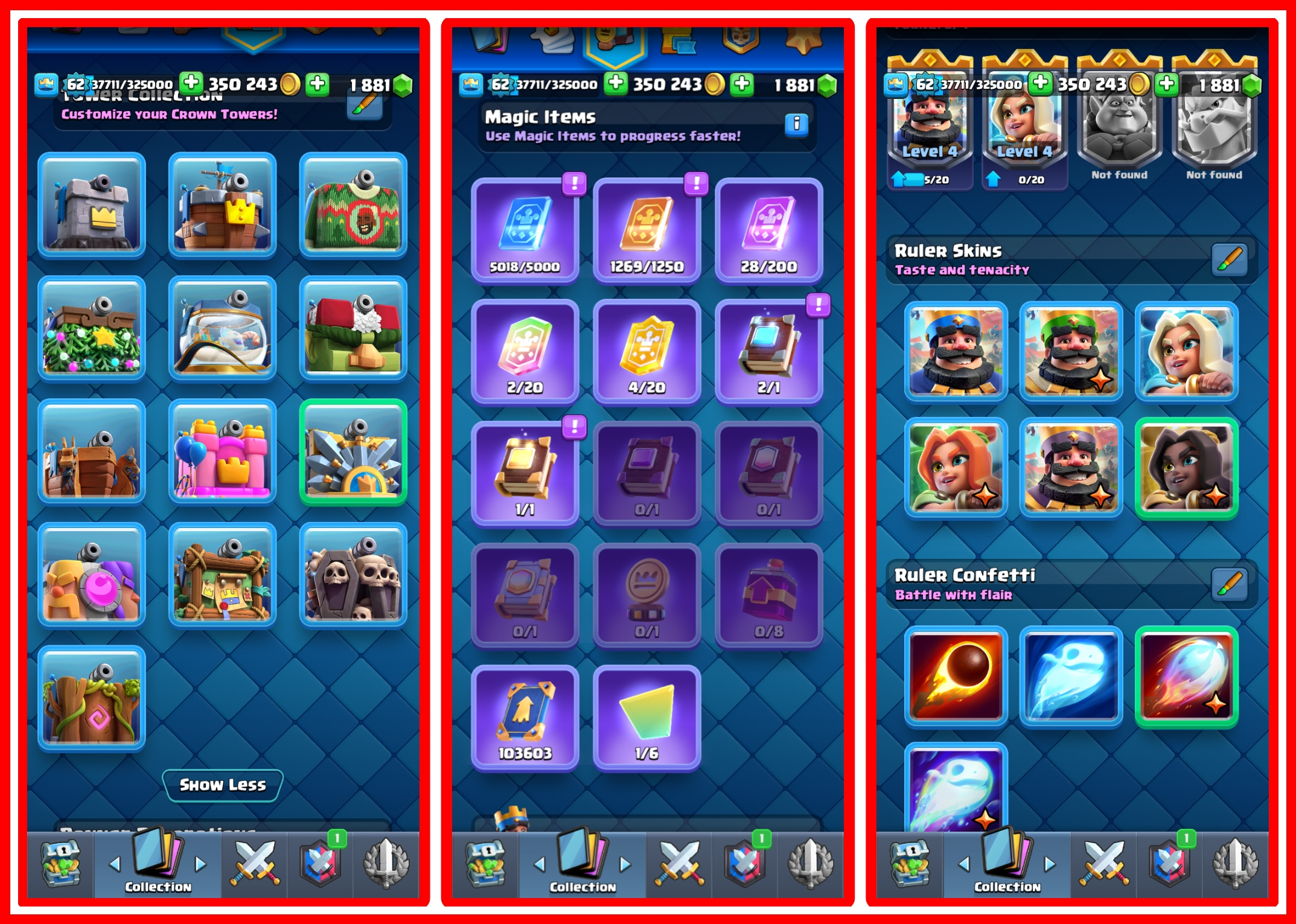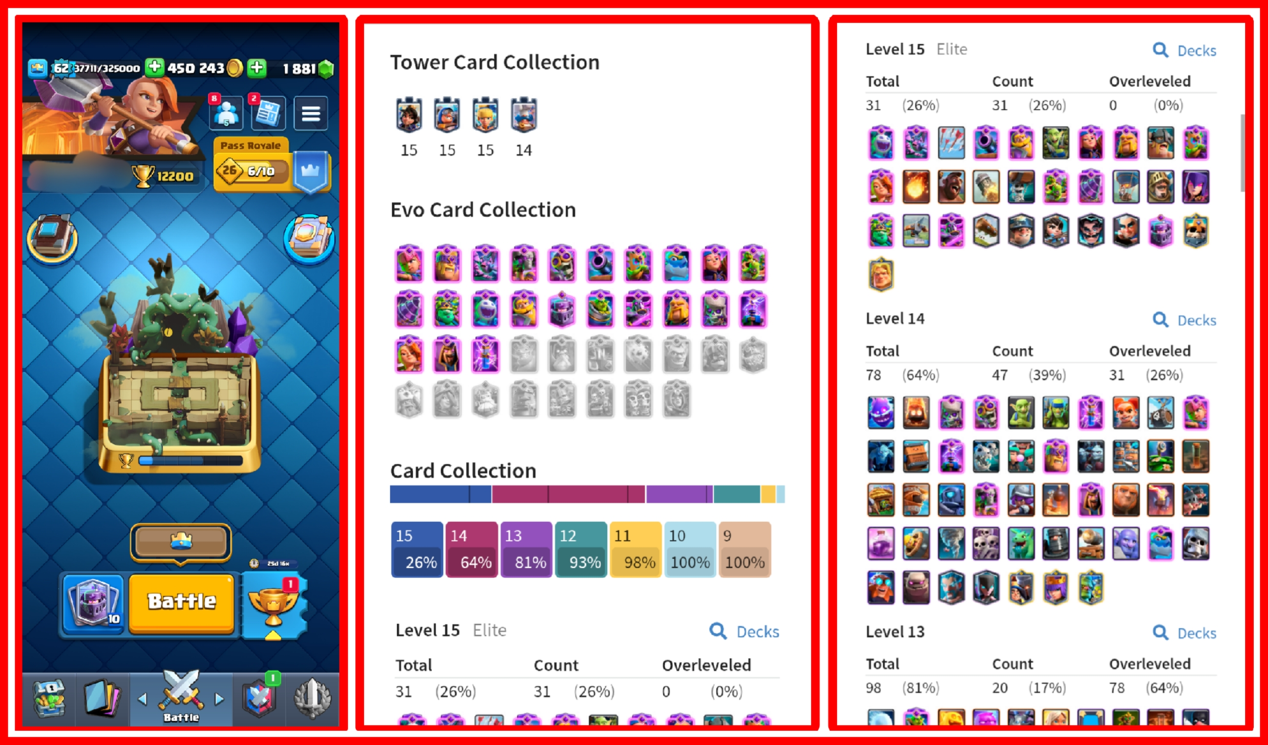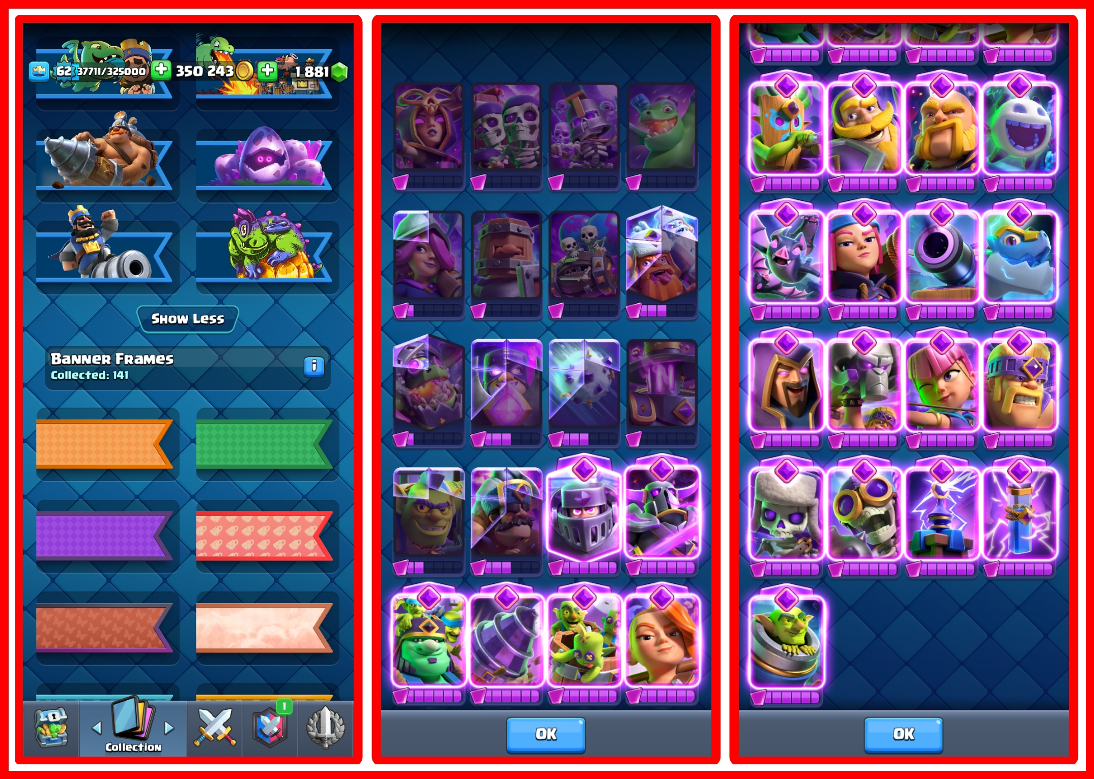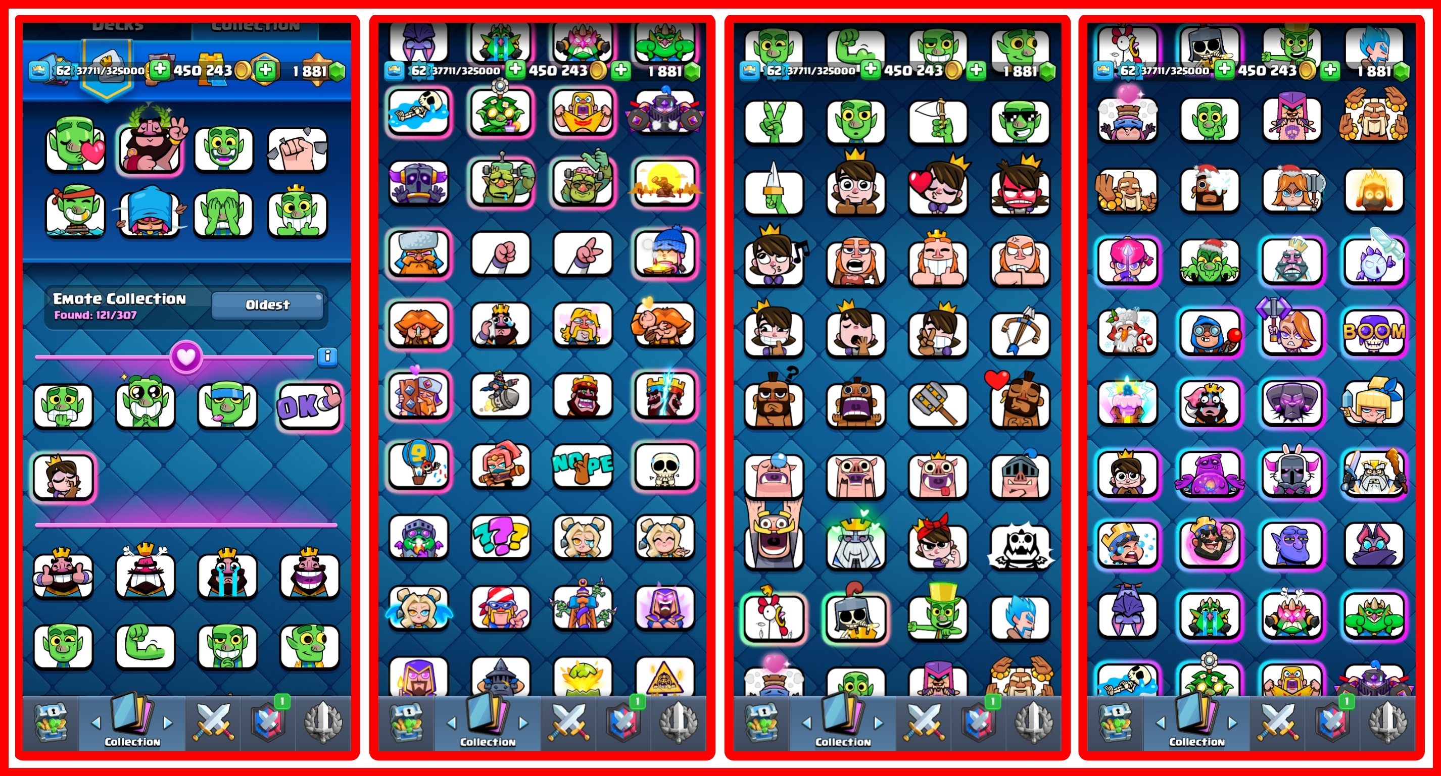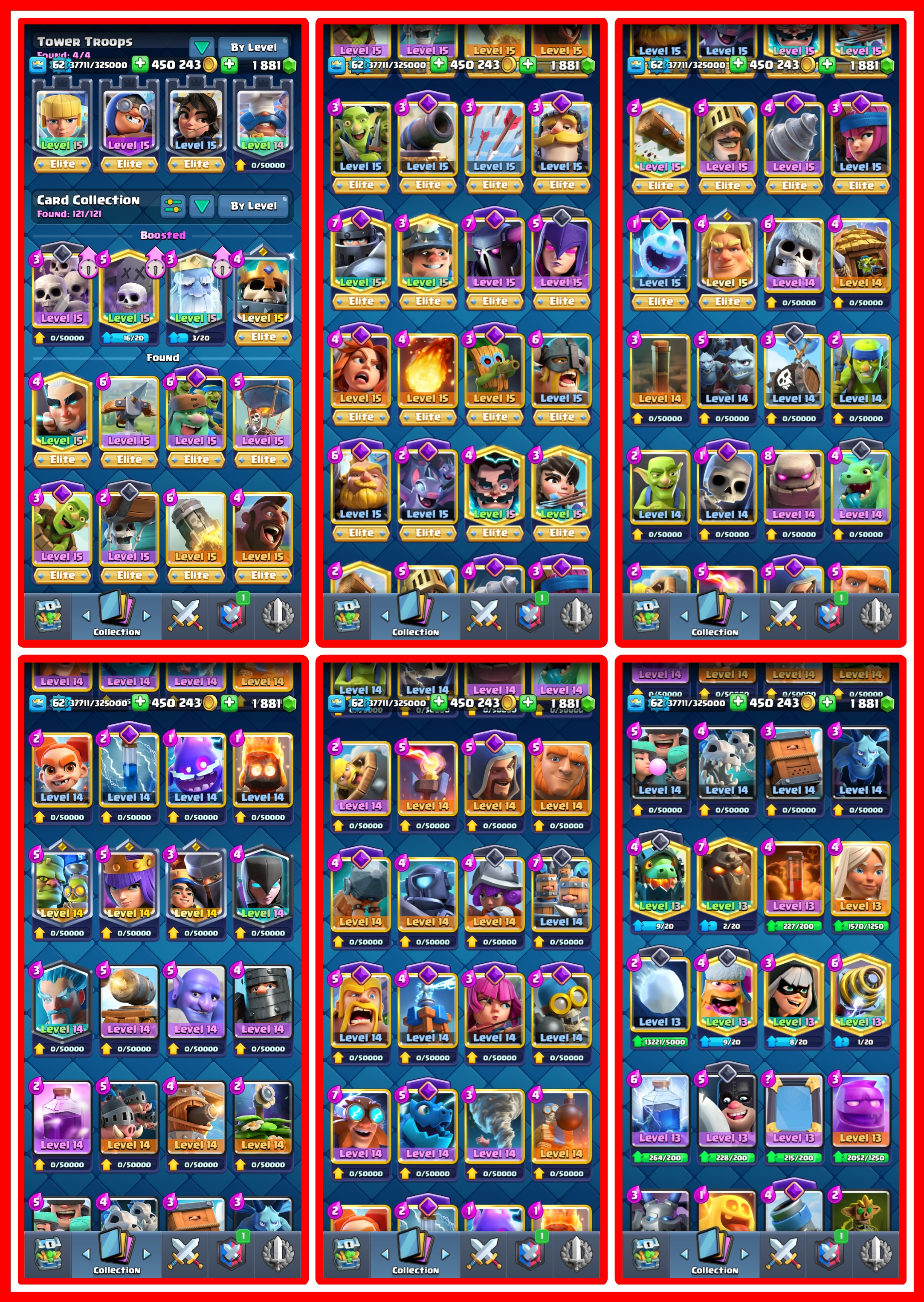 LVL 62 🏆 12.2K+ TROPHIES 👾 23 EVOS 🔥 31 ELITES + 100K ELITE CARDS [ 80 MAX CARDS TOTAL ] 😍 120+ PREMIUM EMOTES [ EMPEROR KING ⸱ GOBLIN KISS ETC ] + MANY TOWER SKINS 💎 1.9K+ GEMS | SAFEST AND INSTANT DELIVERY! 🤝