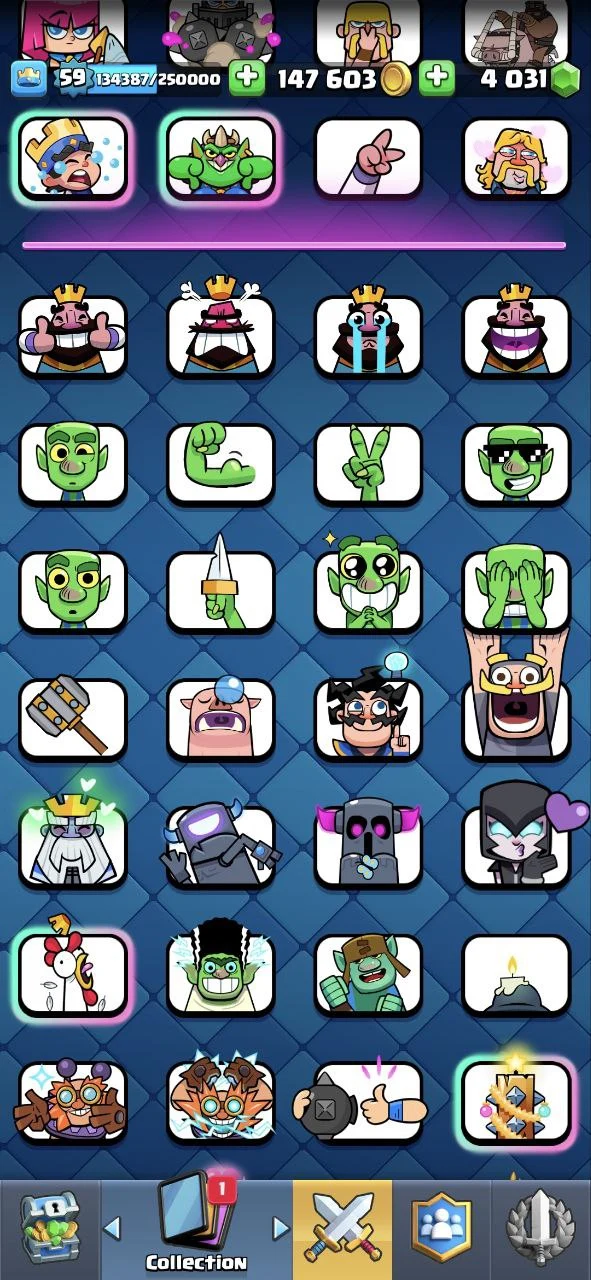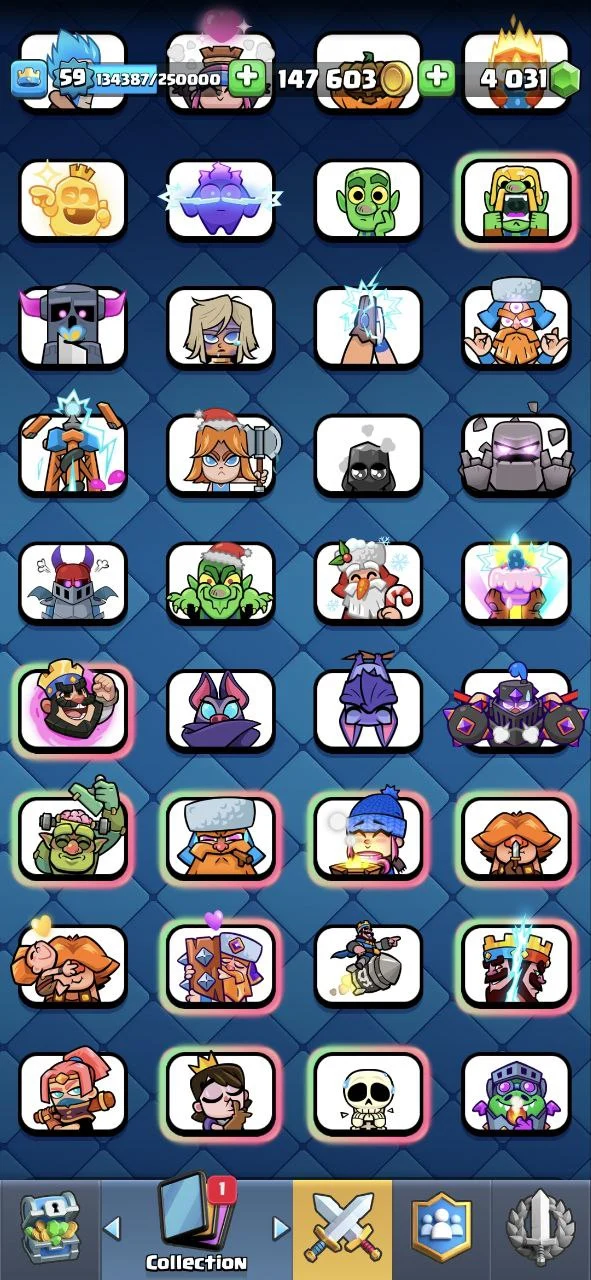 ๐ RARE KISS EMOTE ๐ KT 15 ๐ 9000 Trophy ๐ 59 LVL ๐ 119 Cards ๐ 61 Max Cards ๐ 22 Elite Cards ๐ 13 Evo Cards๐ 96 Emotes ๐ 8 Skins ๐ Free Name Change