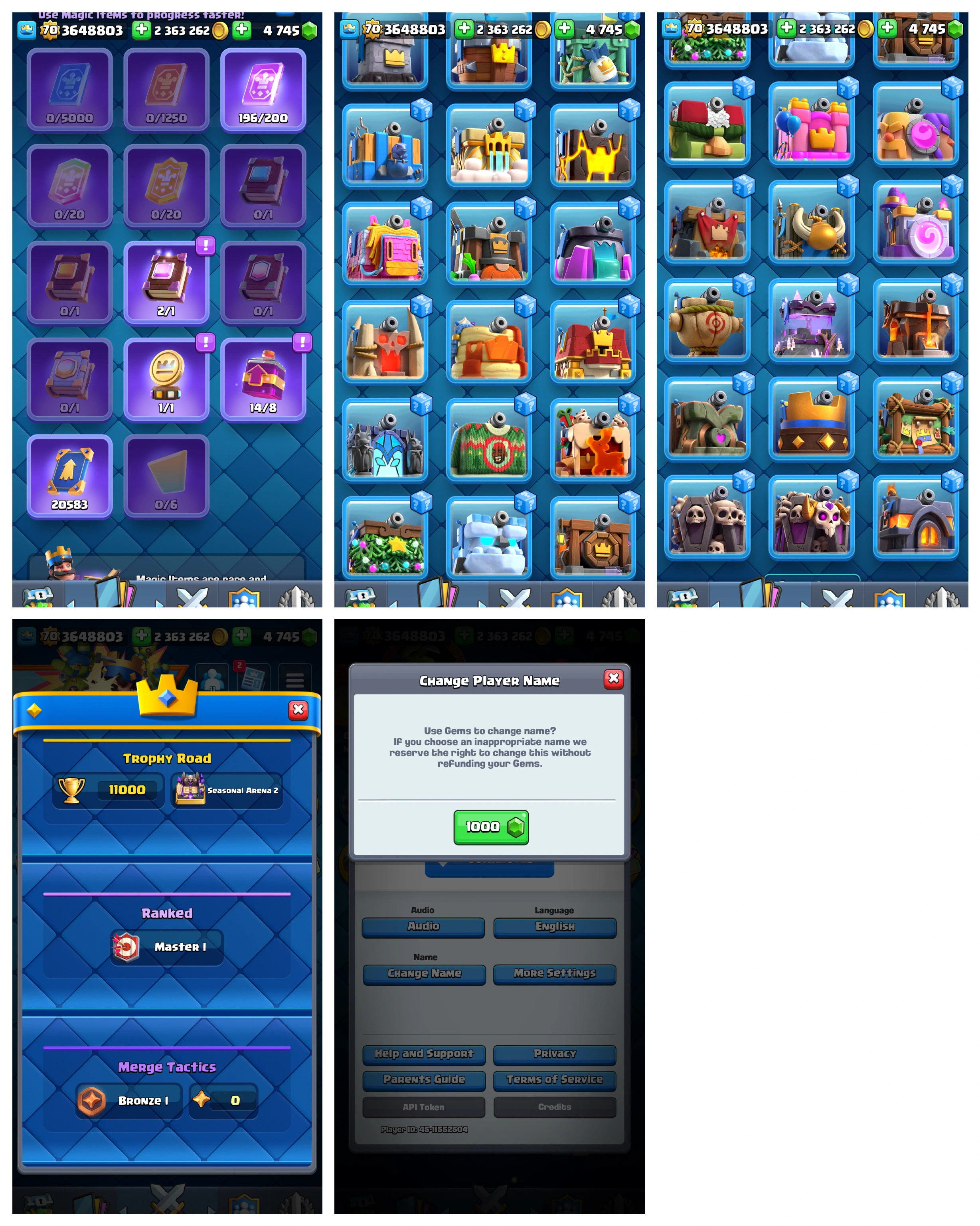 { Rarest Full Max & Esports Profiles Account }✅KT 15 {LVL.70}✅ All Elite > All Evo > All Max Card ✅ Tower Skins-33 ✅ Emotes-222 ✅ 4.7K Gems & 2.3M Gold ✅ 11k Trophy ✅ Android & Ios