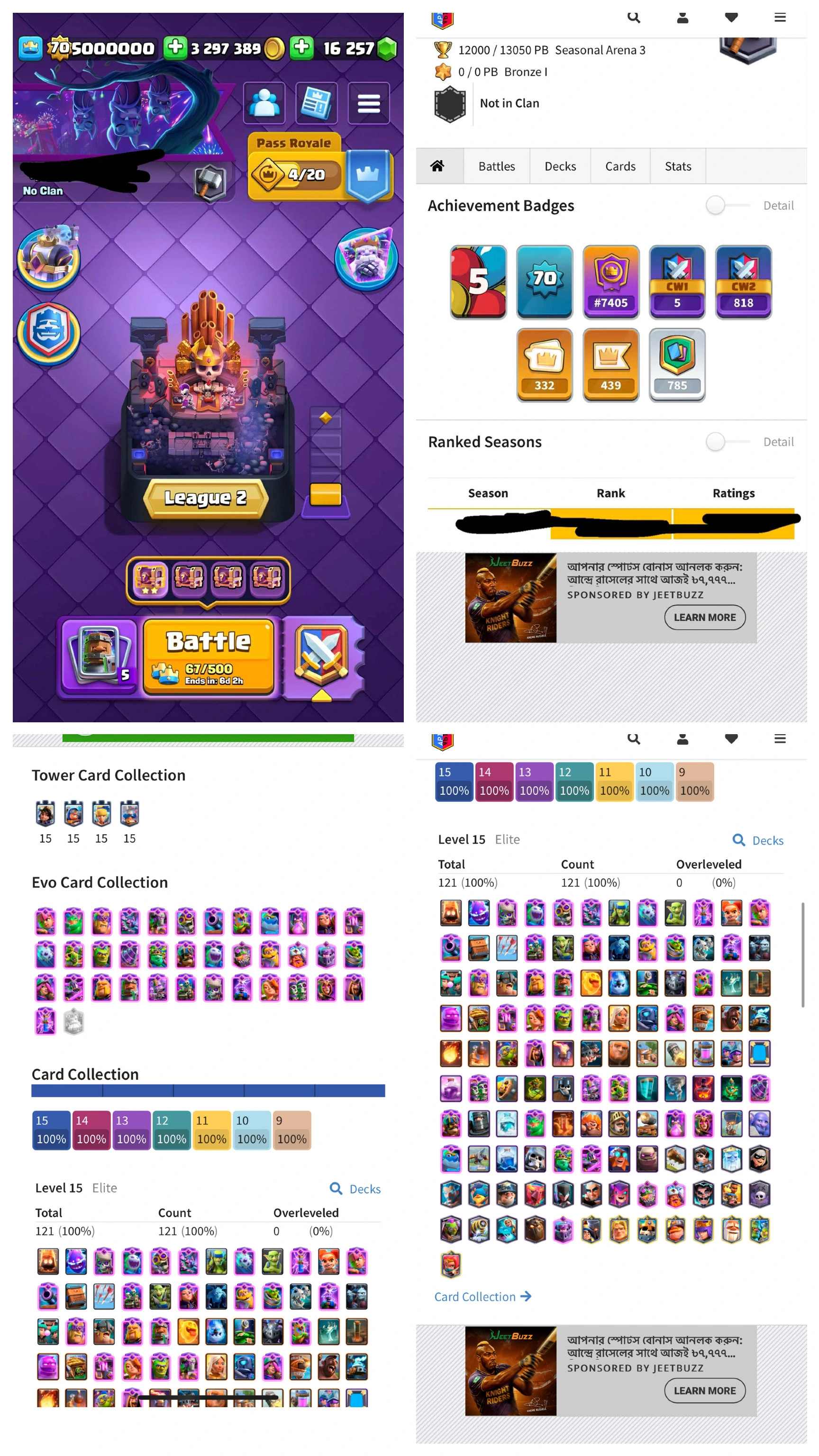 ( Rarest Full Max )✅ KT 15 & LVL.70 ✅ All Elite 121/121 & All Evo 38/38 ✅ All Tower Skin (77) ✅ All Emote -332 ✅ 16.2K Gems ✅ Magic Items Full ✅ Ultimate Champion 2018 PB ✅ 12K trophy ✅ANDROID & IOD