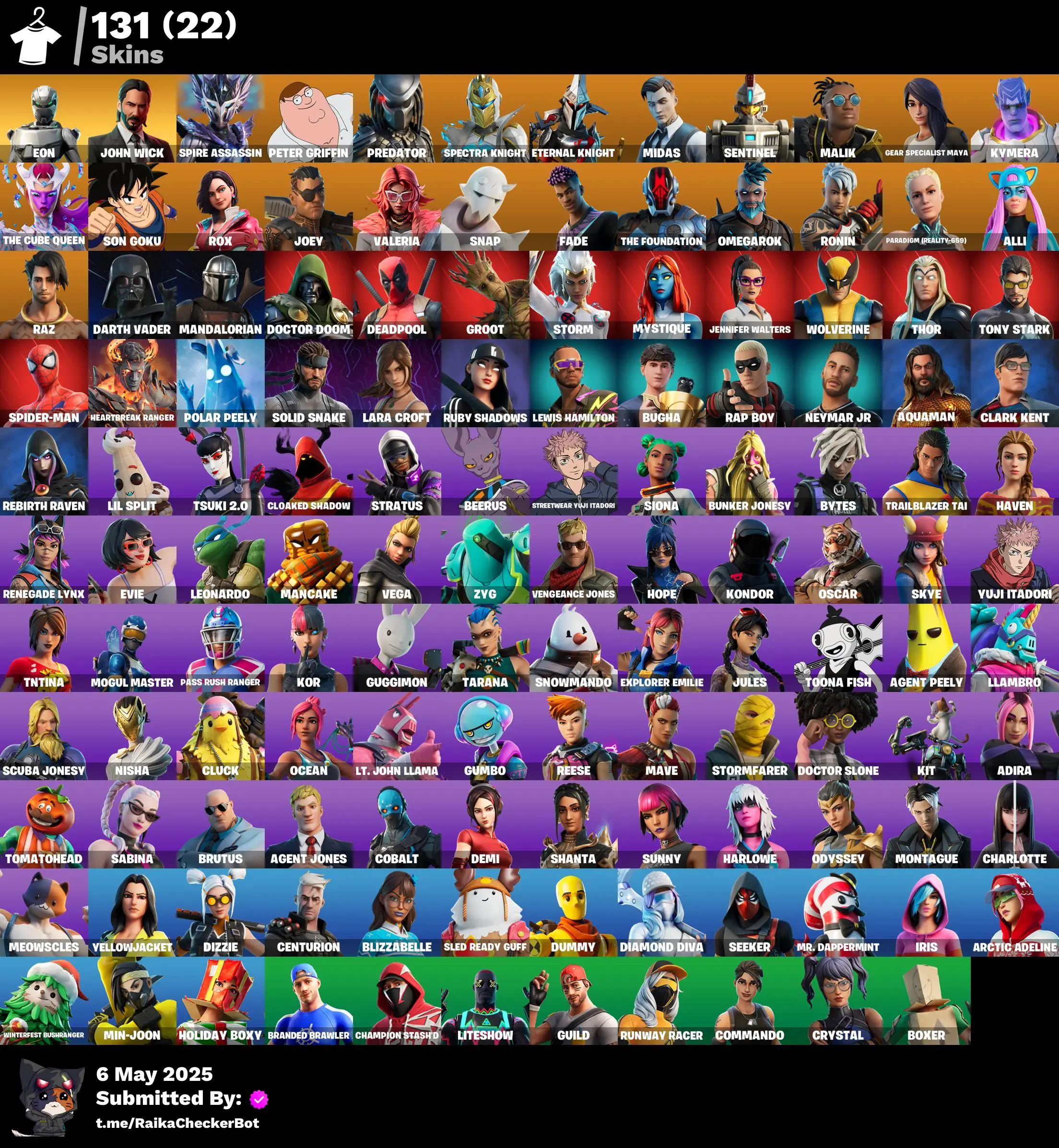 131 skins | Eon | John Wick | Spire Assassin | Peter Griffin | Predator | Spectra Knight | Eternal Knight | Midas | Sentinel | Malik | 300 VB | PSP27