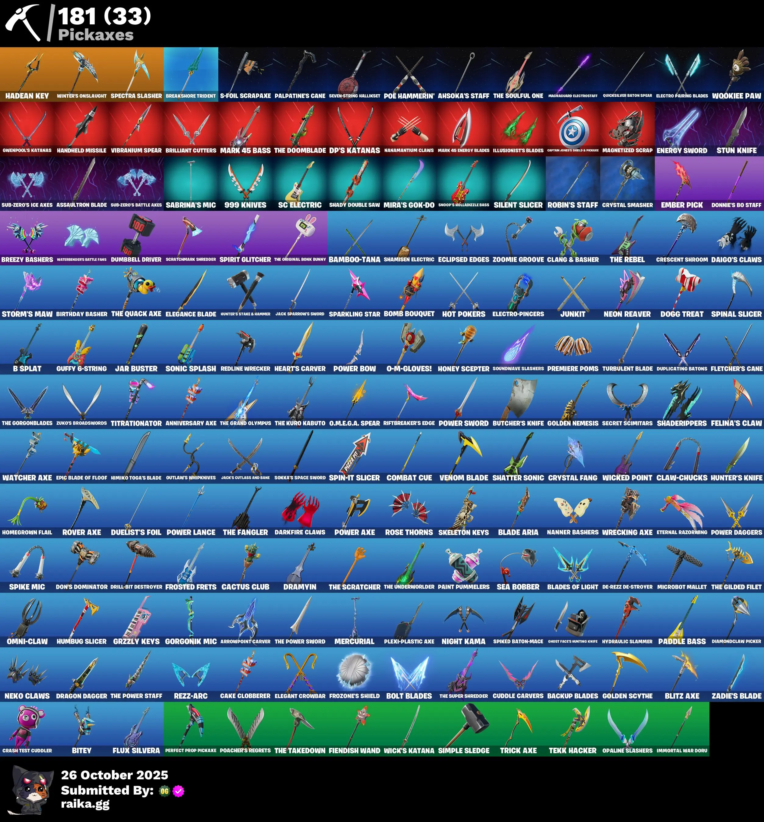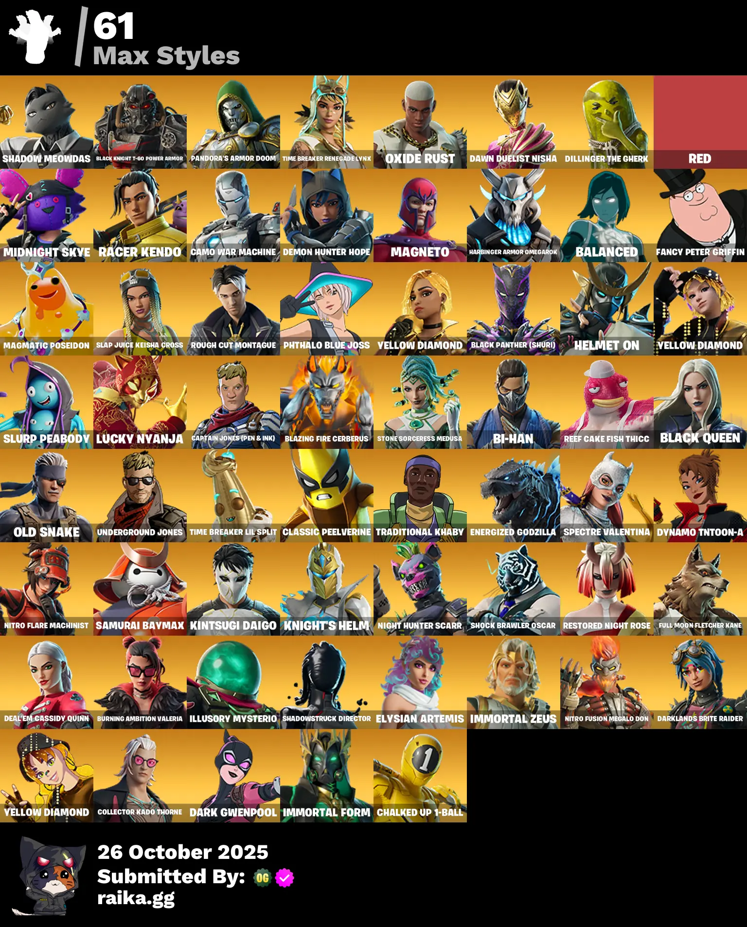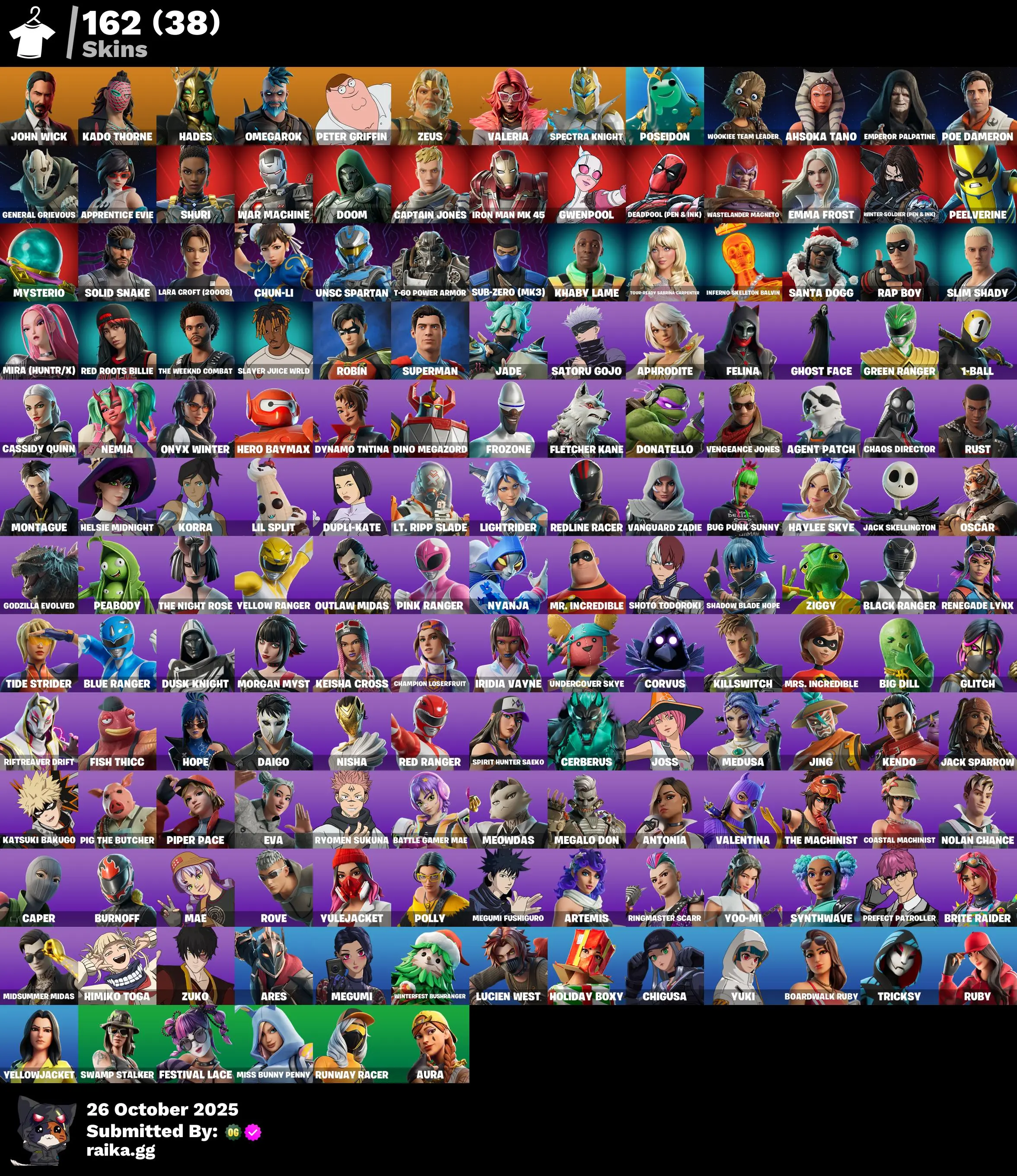 162 skins | General Grievous🎃Peelverine🎃Ahsoka Tano🎃Valeria🎃Wookiee Team Leader🎃John Wick🎃Peter Griffin🎃War Machine🎃Spectra Knight🎃Emperor Palpatine🎃Omegarok🎃Zeus🎃Captain Jones🎃Poe Dameron🎃Emma Frost🎃Hades🎃Poseidon🎃Kado Thorne🎃Doom D5219