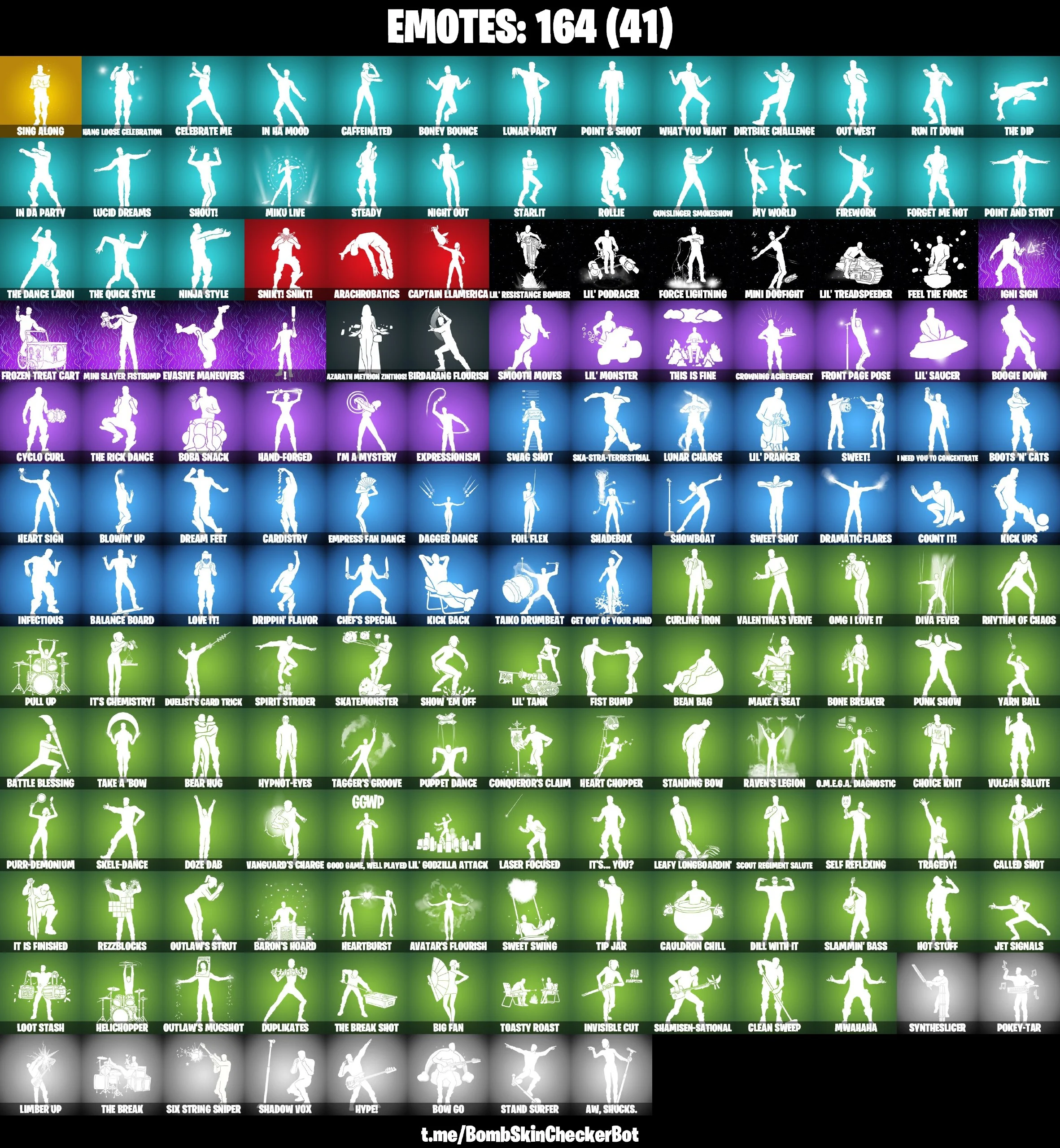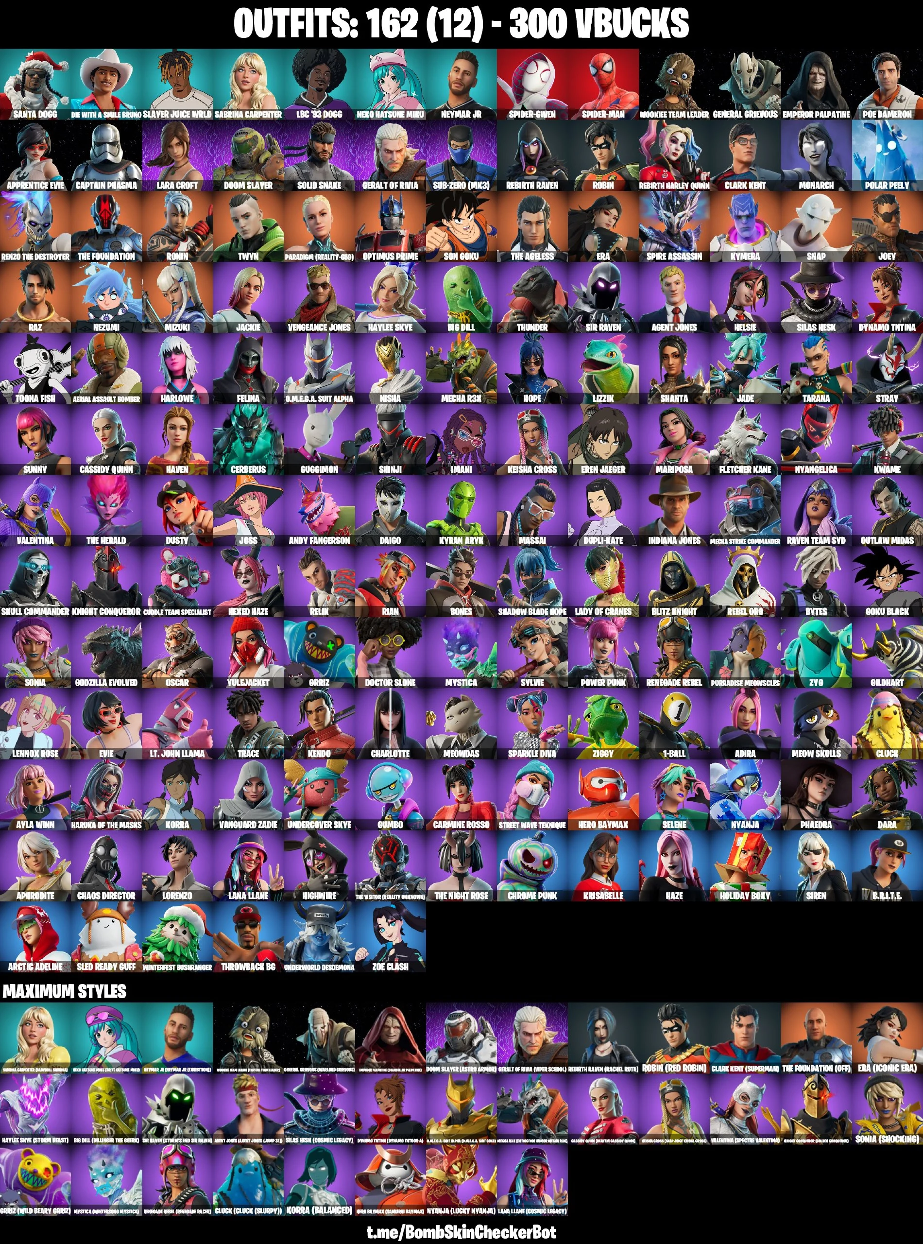 🔮162 Skins🔮 Spider Gwen💎Rebirth Harley Quinn💎Son Goku💎Lara Croft💎Neymar Jr💎Clark Kent💎Polar Peely💎Krisabelle💎Toona Fish💎Meow Skulls💎Eren Jaeger💎Spiderman💎Goku Black💎