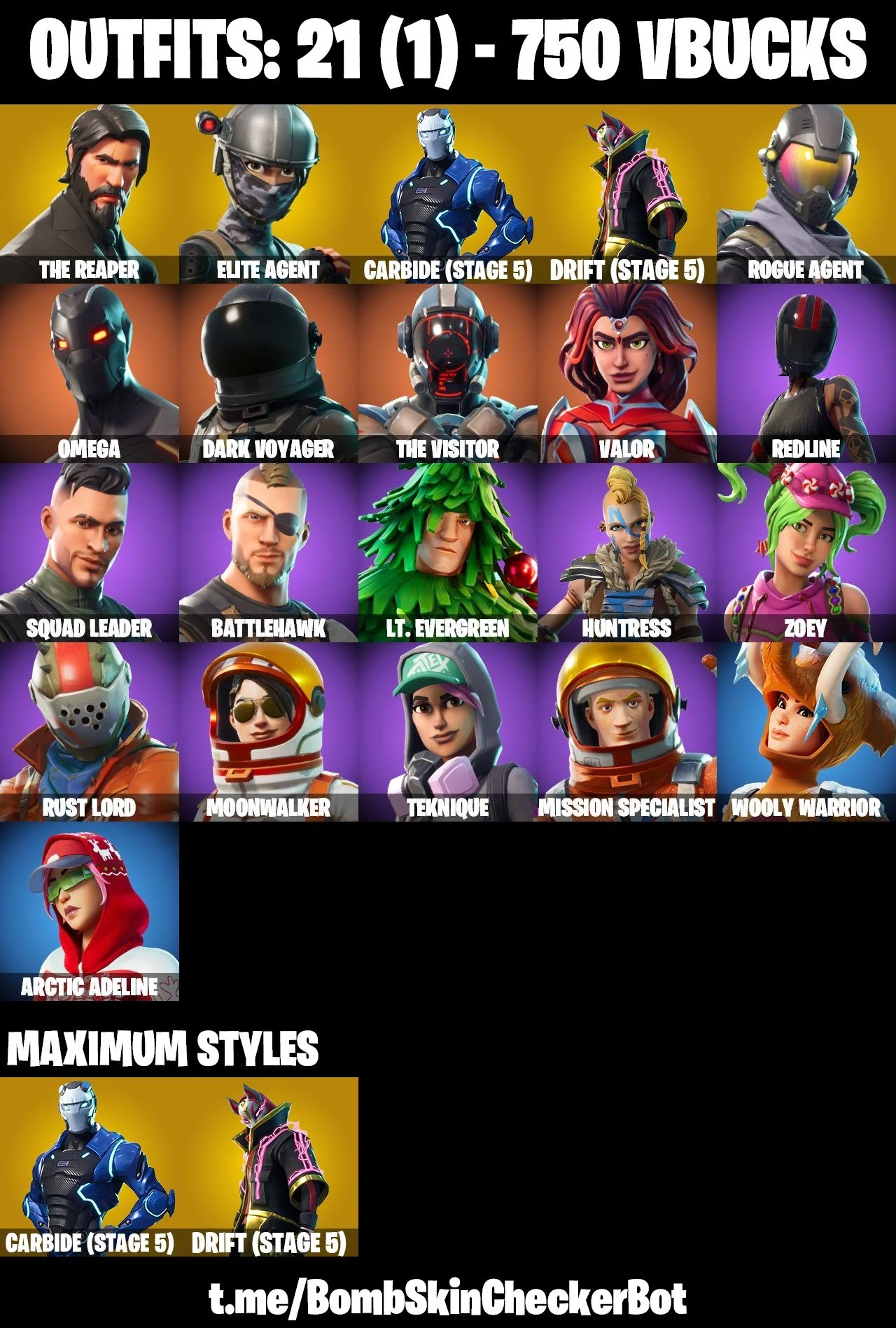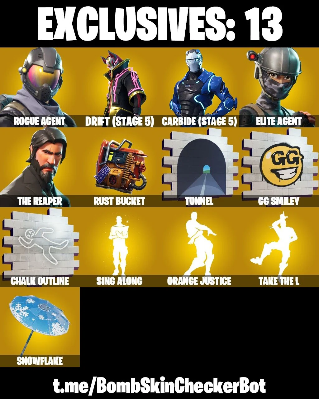 🔮21 Skins🔮 The Reaper💎Take The L💎Rogue Agent💎Elite Agent💎Carbide (Stage 5)💎Rust Bucket💎Orange Justice💎Snowflake💎Arctic Adeline