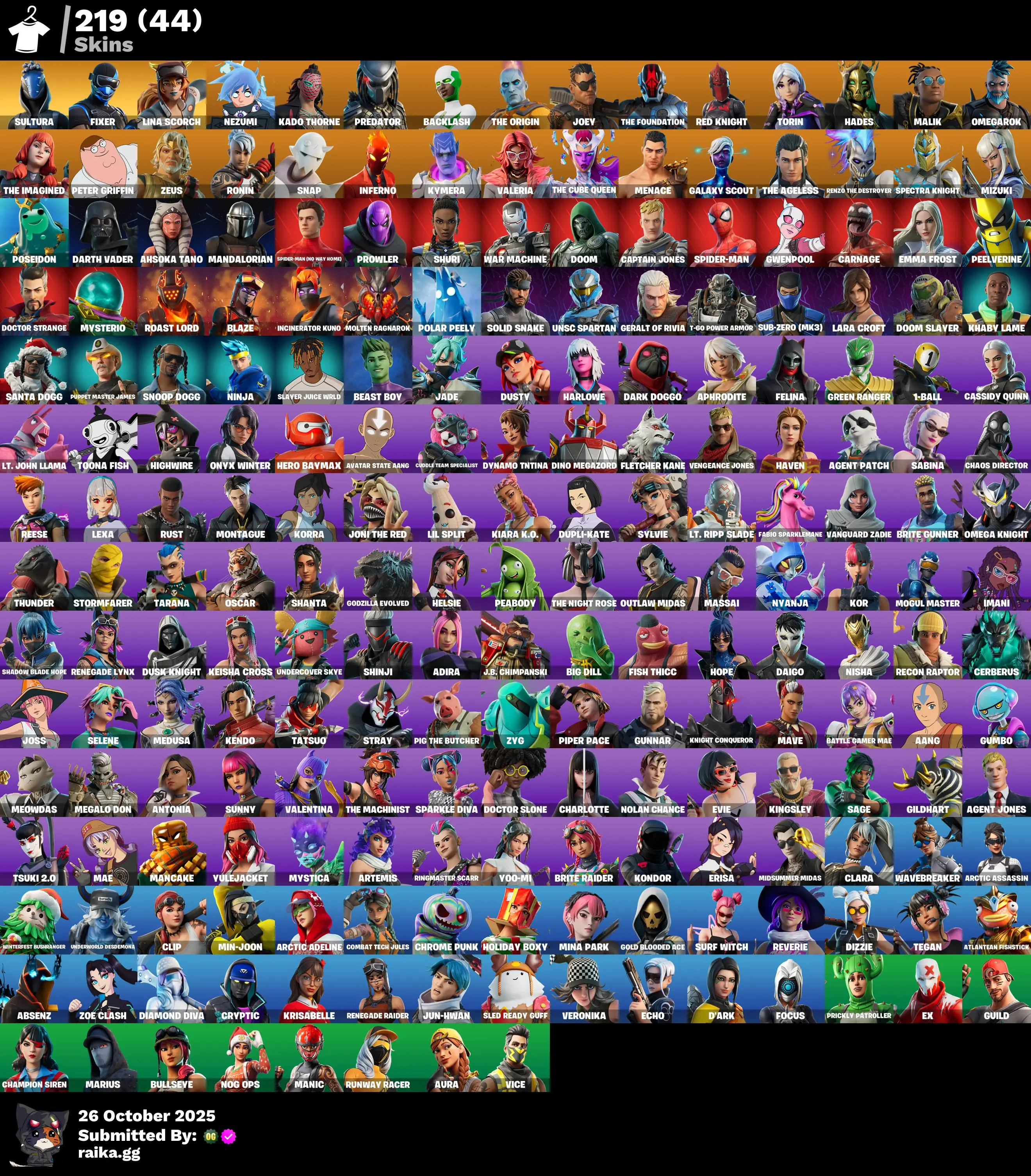 219 skins | Torin🎃Zeus🎃Hades🎃Kado Thorne🎃The Foundation🎃The Ageless🎃Valeria🎃The Origin🎃Malik🎃Sultura🎃Lina Scorch🎃Spectra Knight🎃Galaxy Scout🎃Inferno🎃Fixer🎃Mizuki🎃Peter Griffin🎃Kymera🎃Nezumi🎃Omegarok🎃Backlash🎃Red Knight D5216