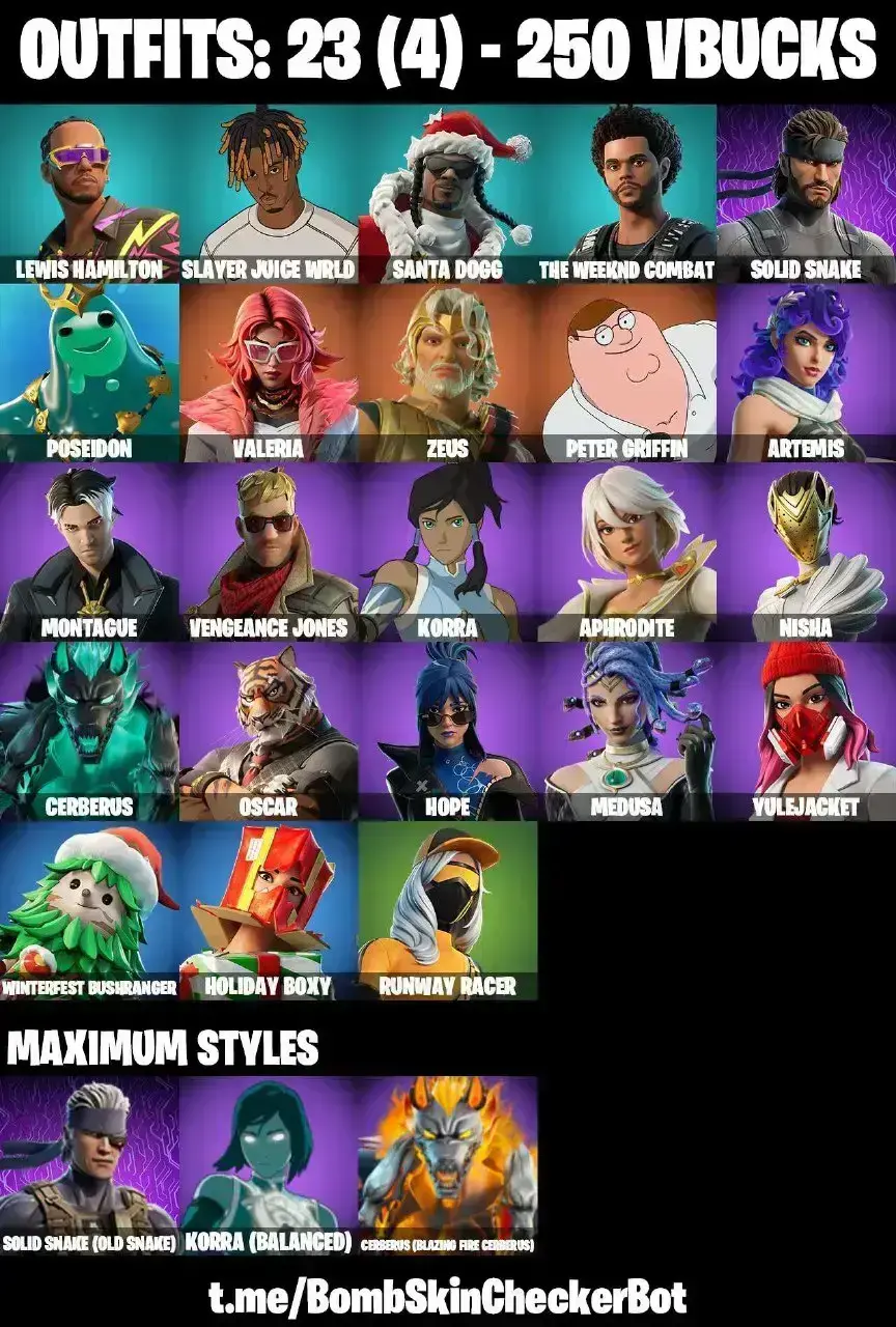 23 SKINS | ARTEMIS | HOPE | MEDUSA | APHRODITE | KORRA MAX | SLAYER JUICE WRLD | ZEUS | NISHA | OSCAR | CAN PLAY ON PSN,XBOX,PC,NINTENDO,MOBILE | 250 VBUCKS | FULL EMAIL ACCESS