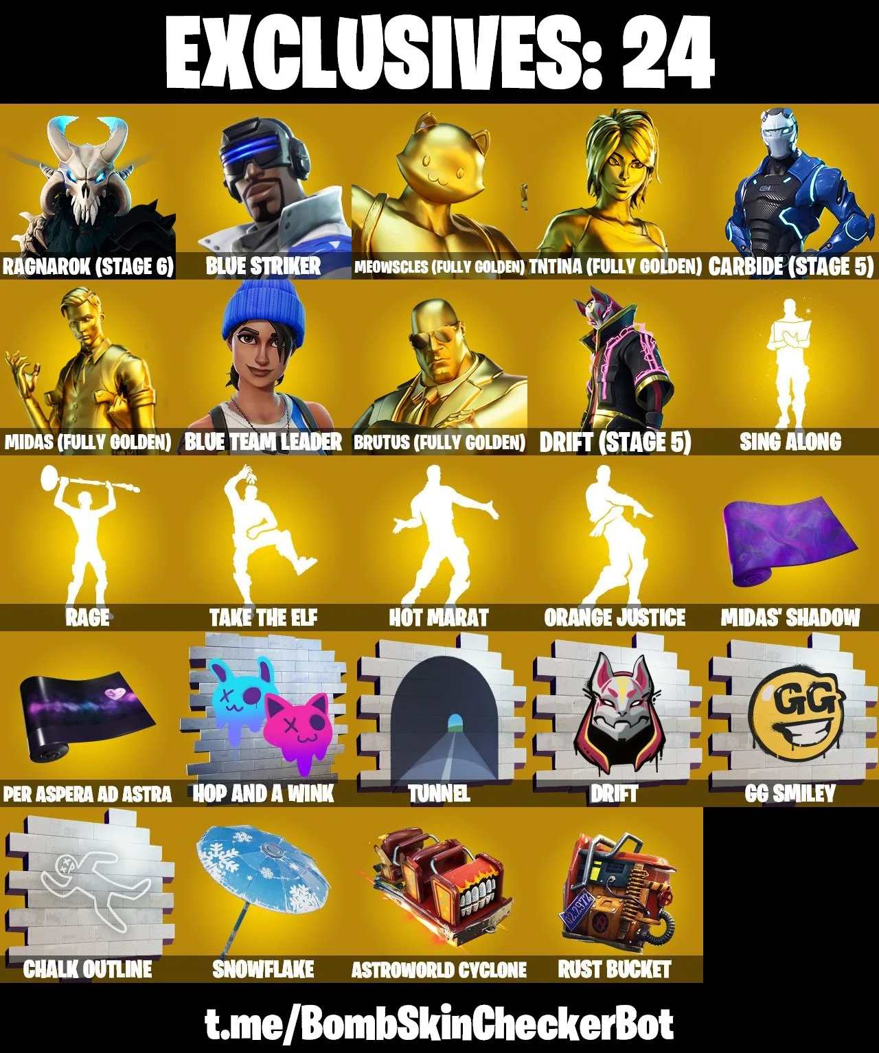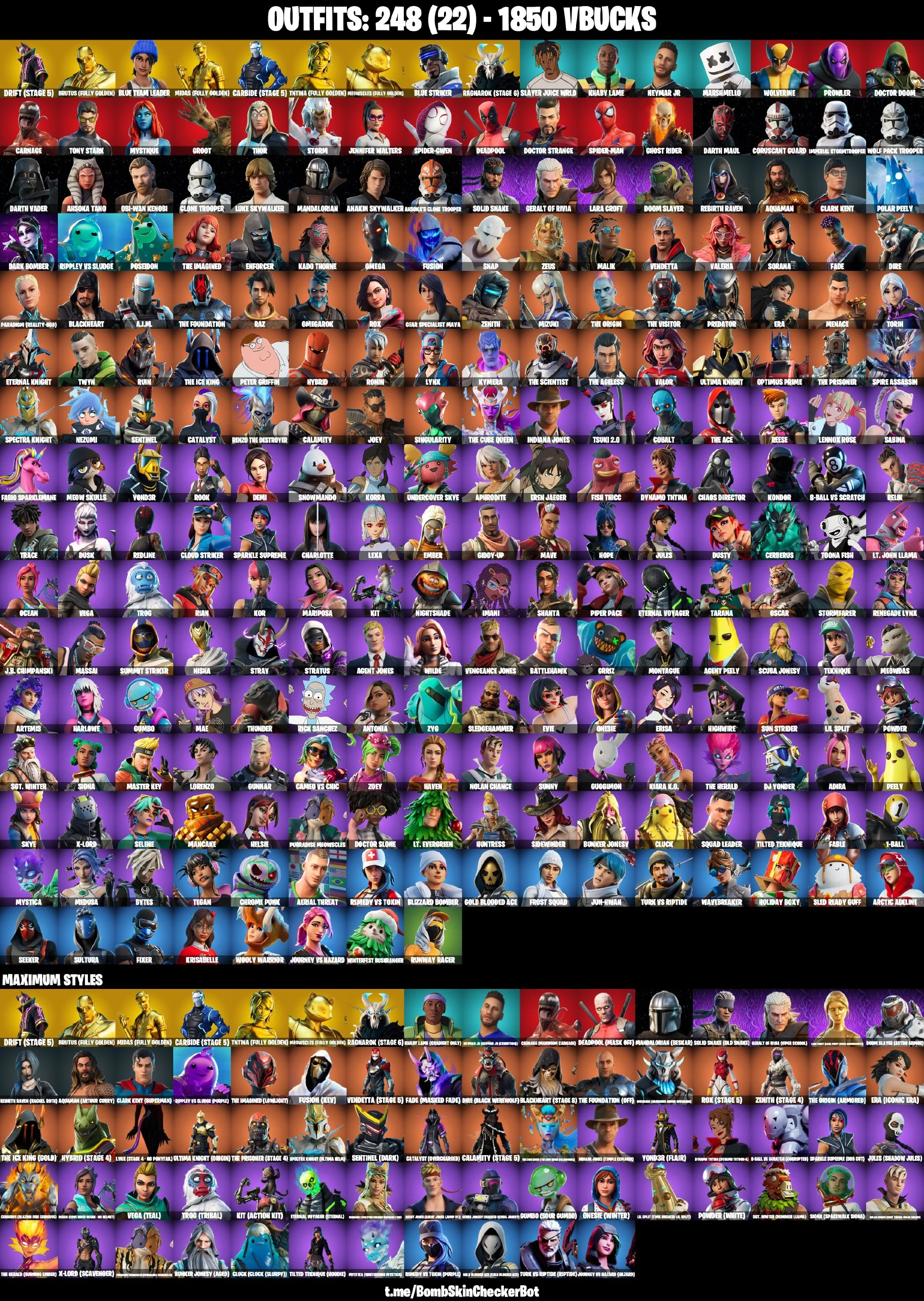🔮248 Skins🔮 Hot Marat💎TNTina (Fully Golden)💎Rage💎Midas (Fully Golden)💎Take The Elf💎Ragnarok (Stage 6)💎Carbide (Stage 5)💎Rust Bucket💎Blue Team Leader💎Blue Striker💎Spider Gwen