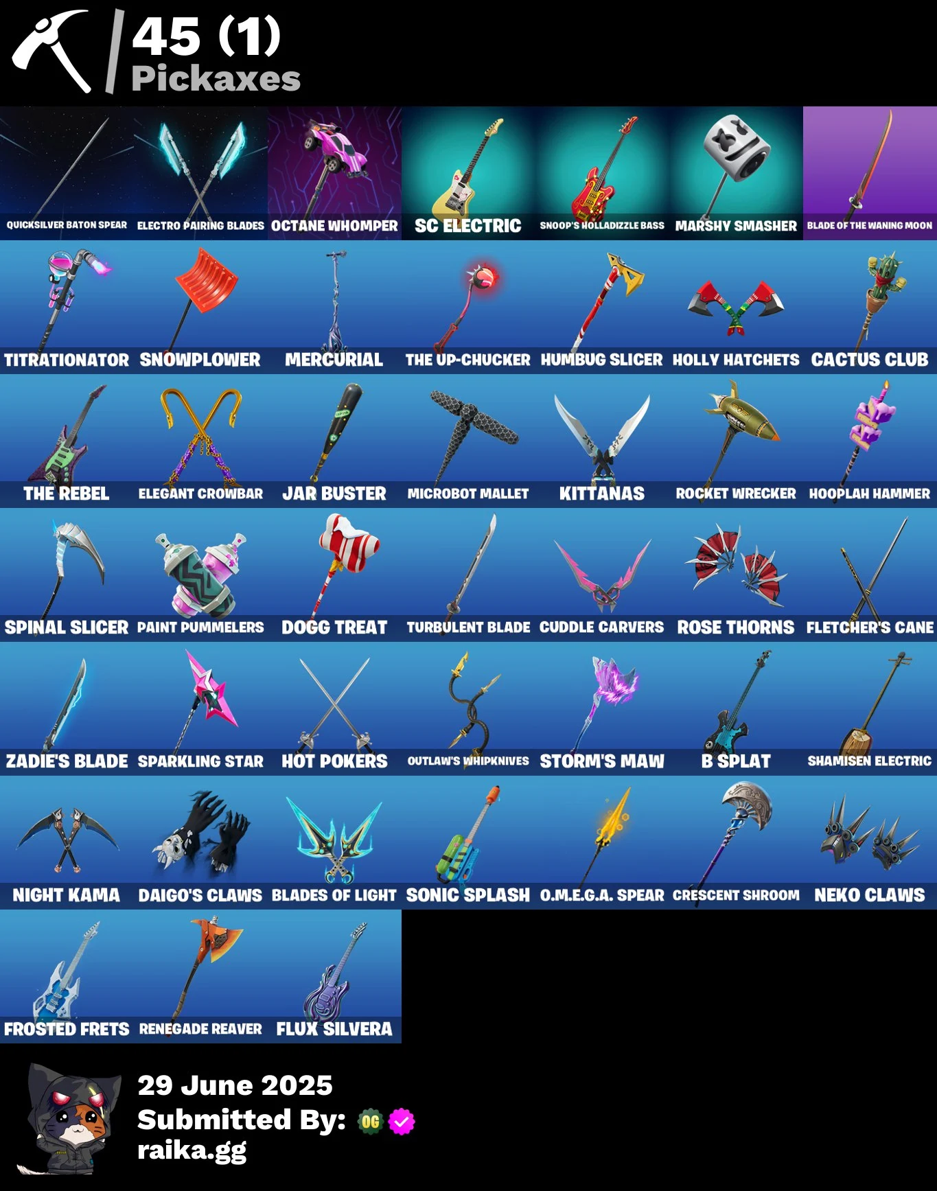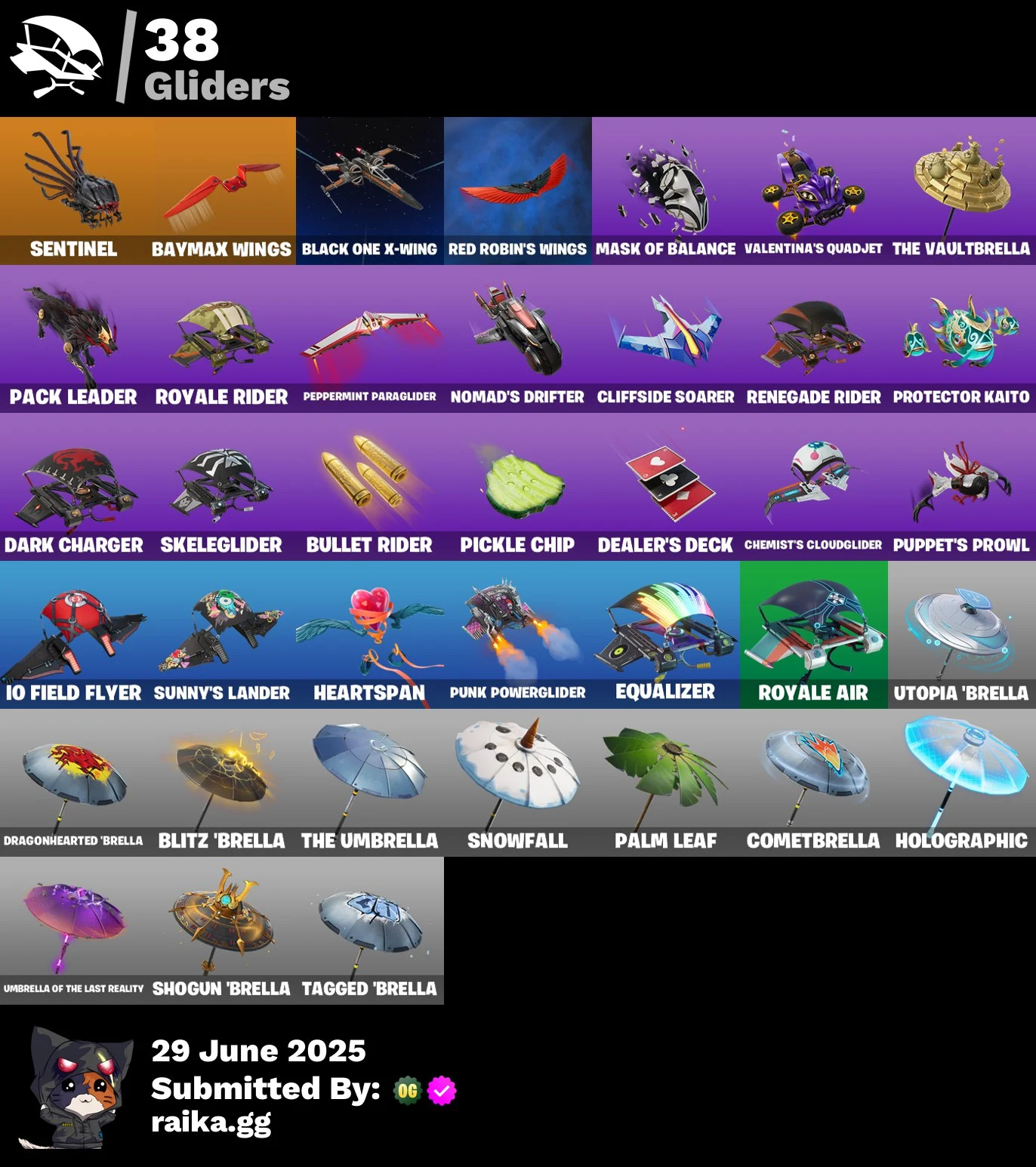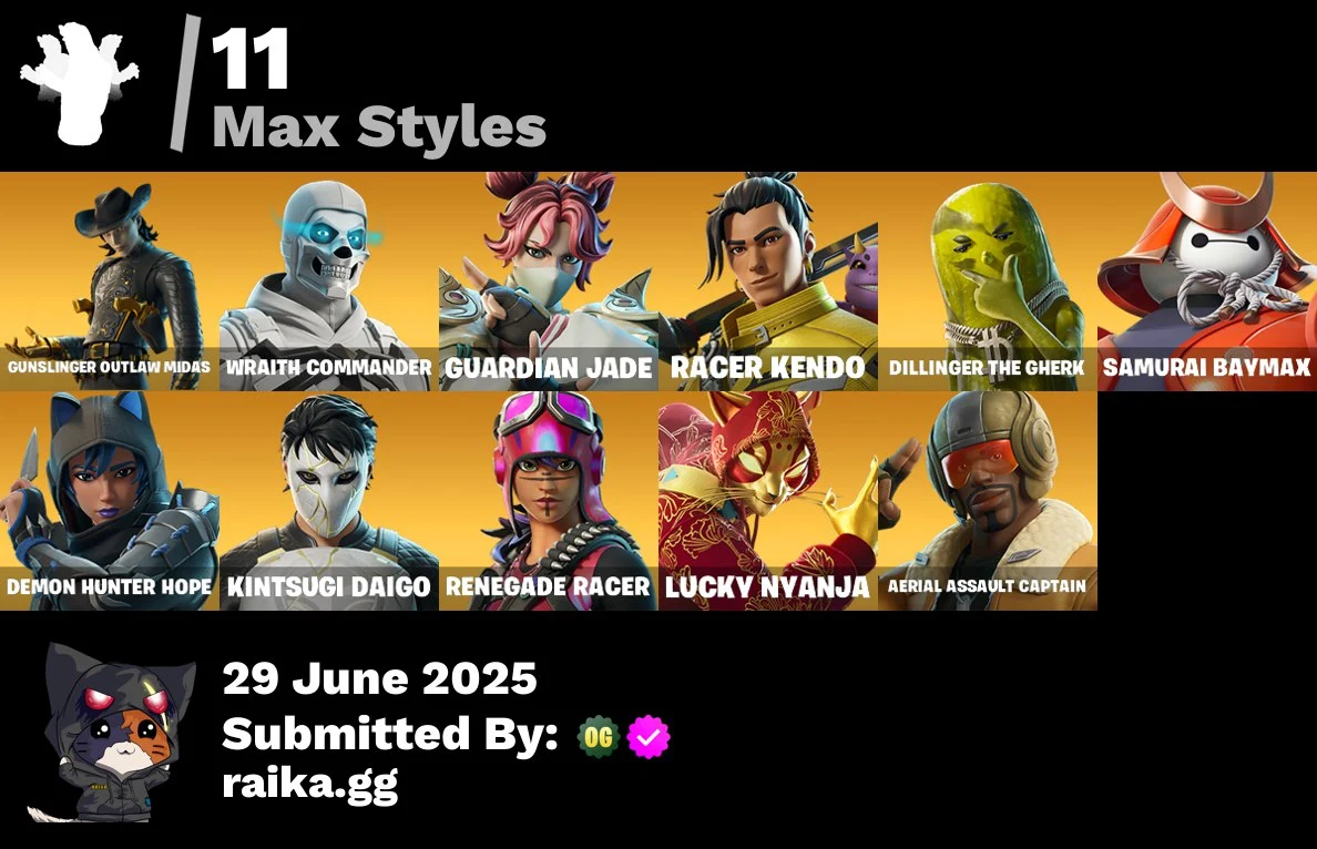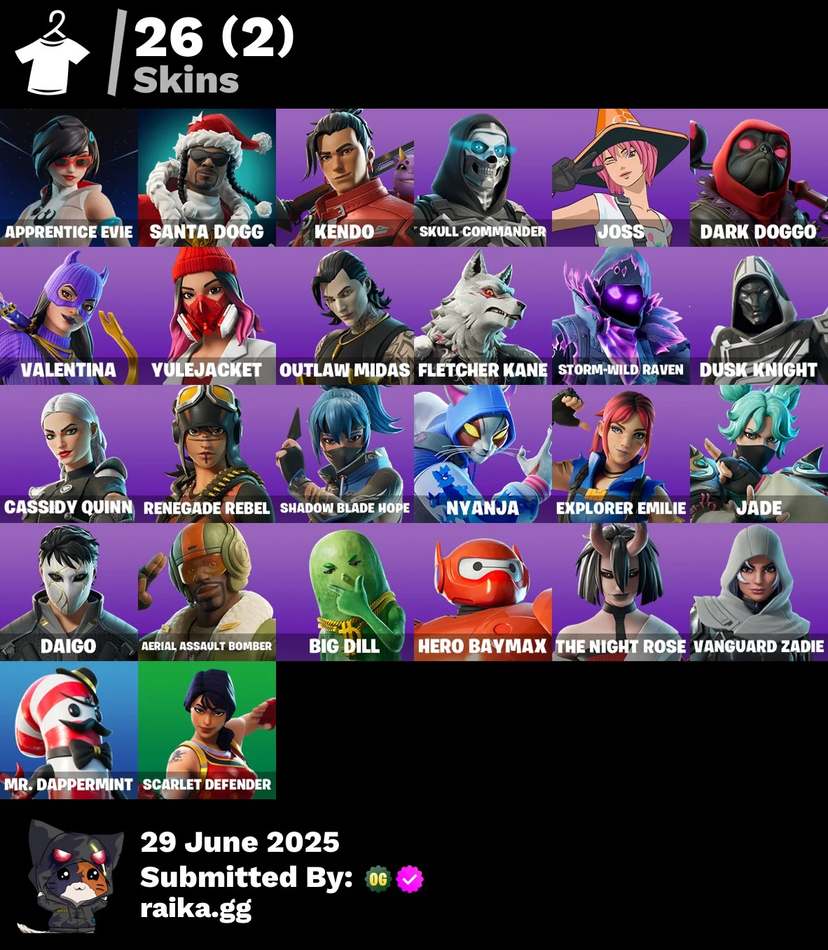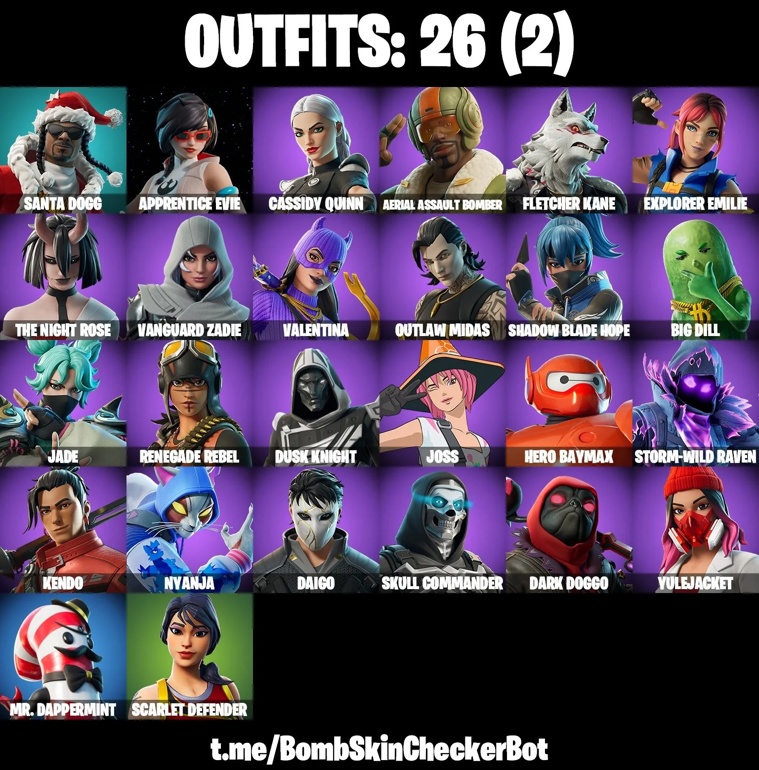 26 skins | Apprentice Evie | Santa Dogg | Kendo | Skull Commander | Joss | Dark Doggo | Valentina | Yulejacket | Outlaw Midas | Fletcher Kane | Nai@1
