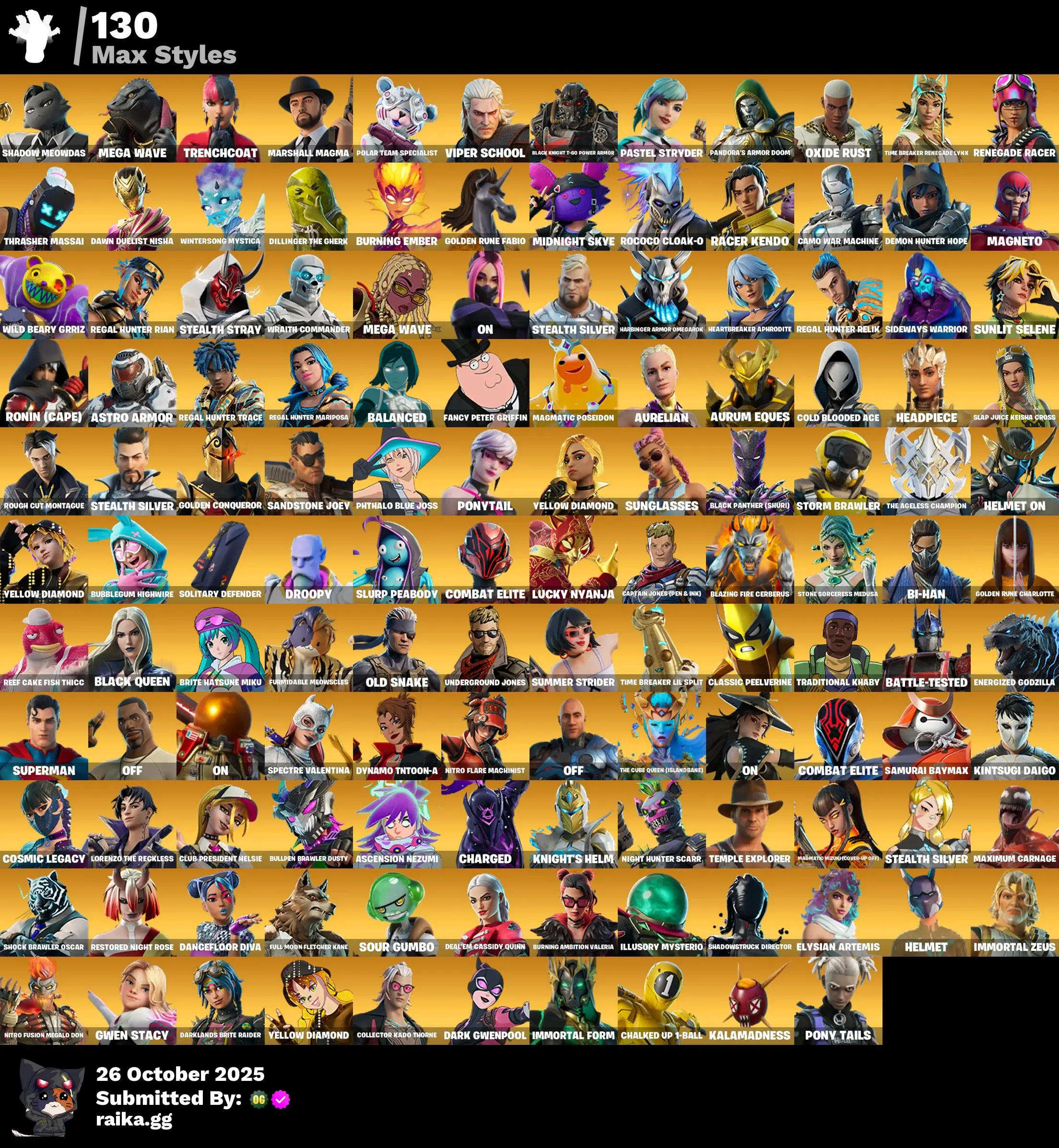 265 skins | The Ageless🎃Zeus🎃Nezumi🎃Valeria🎃Kado Thorne🎃Torin🎃Optimus Prime🎃Omegarok🎃The Origin🎃Peter Griffin🎃Son Goku🎃Renegade Raider🎃Dynamo Dancer🎃Hades🎃Red Knight🎃The Foundation🎃Spectra Knight🎃Malik🎃Kymera🎃Mizuki🎃Ravage D5215