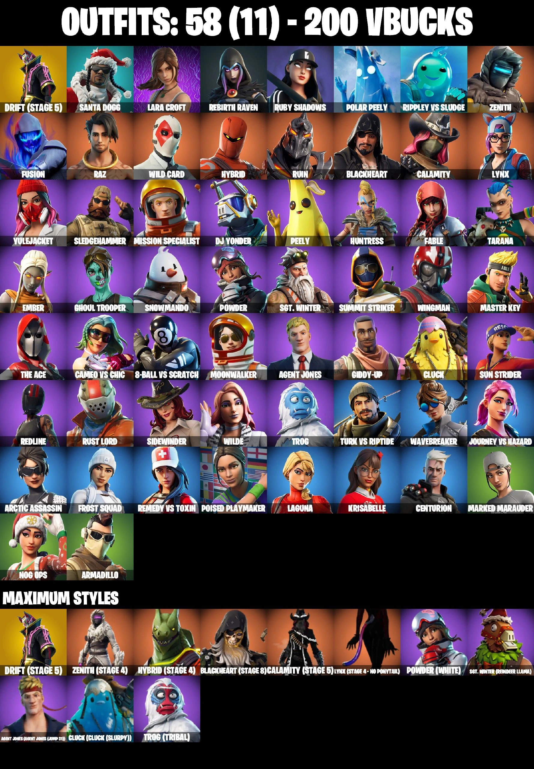 58 SKINS ⸱ TAKE THE L ⸱ GET GRIDDY ⸱ DRIFT MAXED ⸱ LARA CROFT ⸱ REBIRTH RAVEN ⸱ CALAMITY ⸱ BLACKHEART ⸱ LYNX ⸱ RUST LORD ⸱ PEELY ⸱ WILD CARD ⸱ GHOUL TROOPER ⸱ FUSION ⸱ MASTER KEY ⸱ ZENITH ⸱ THE ACE ⸱ RUIN ⸱ REAPER AXE ⸱ ICE BREAKE