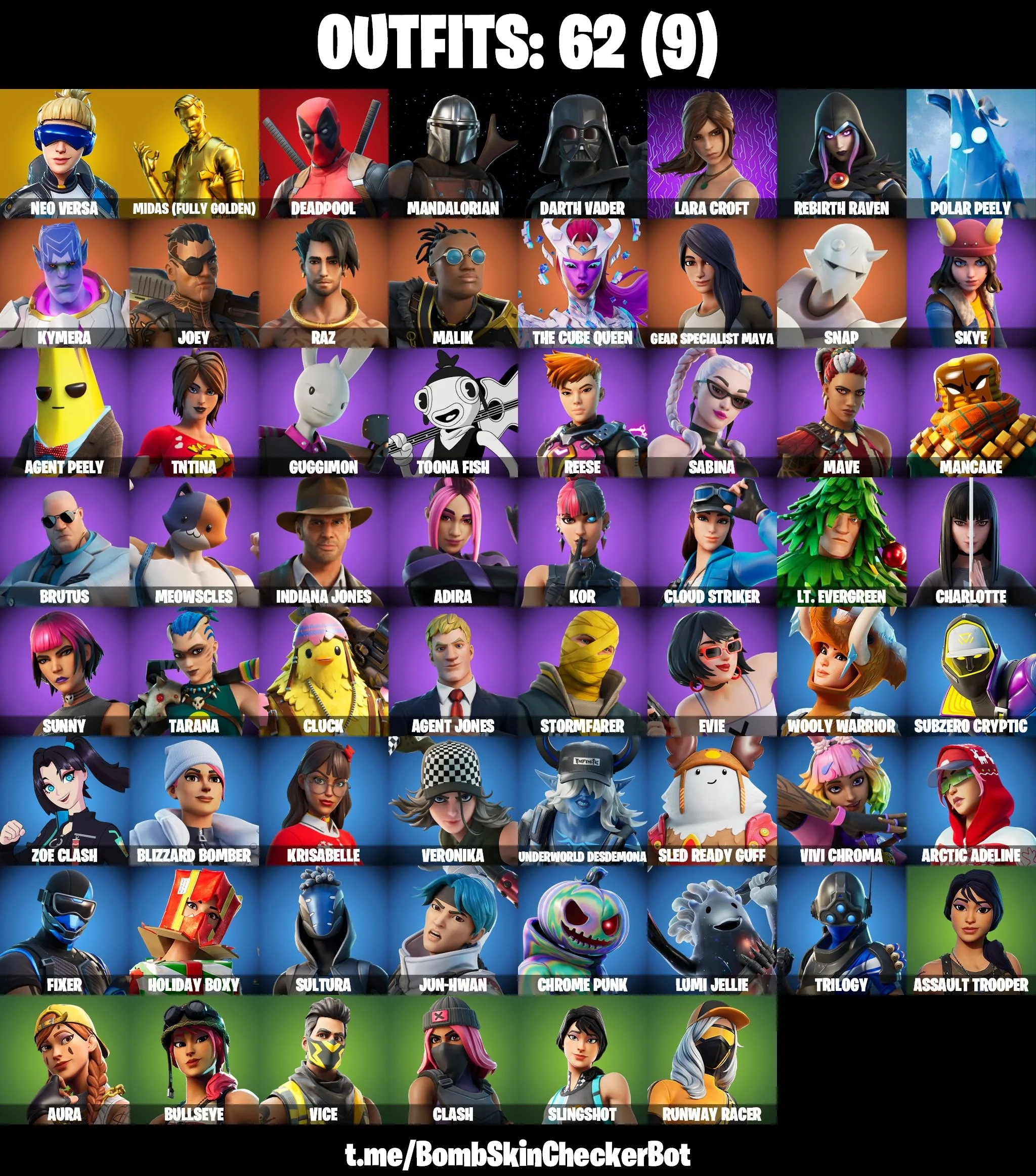 62 SKINS | Neo Versa | Midas | Deadpool | Mandalorian | Darth Vader | Lara Croft | Rebirth Raven
