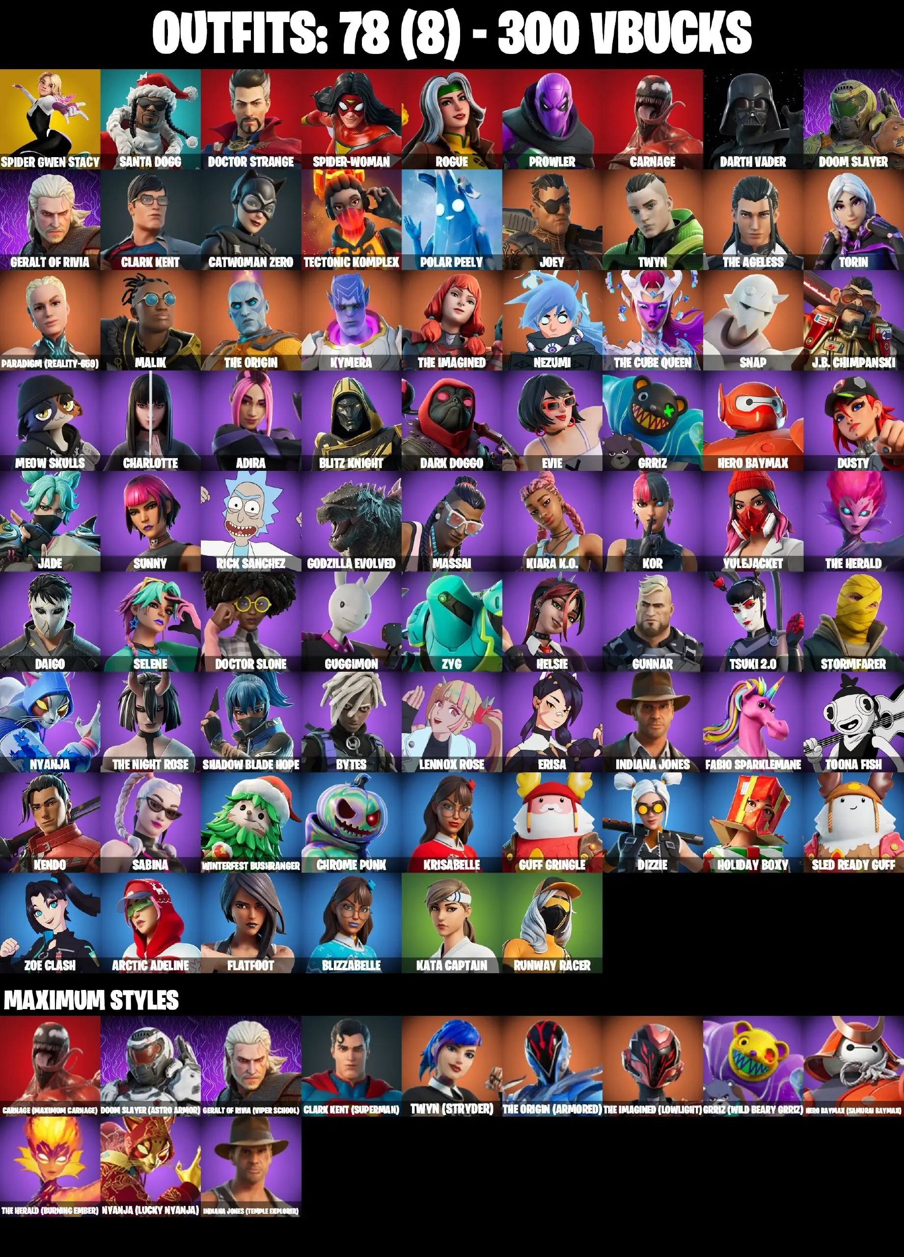 78 SKINS | SPIDER-GWEN STACY | SPIDER-WOMAN | DARTH VADER | CATWOMAN ZERO | CLARK KENT SUPERMAN | CHARLOTTE | KOR | EVIE | HELSIE | TSUKI 2.0 | TOONA FISH | BYTES | DARK DOGGO | CAN PLAY ON PSN,XBOX,PC,NINTENDO,MOBILE | 300 VBUCKS