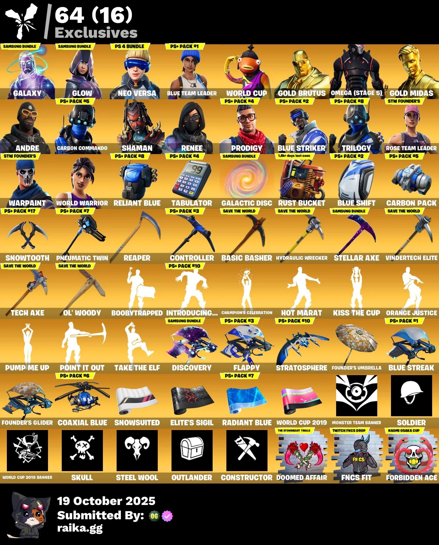 [ All Platforms Linkable ] 251 skins 👑 Galaxy ✨ OG STW 🌟 Glow 🌟 Neo Versa 🌟 Blue Team Leader 🌟 WORLD CUP 🌟 Gold Brutus 🌟 Omega (stage 5) 🌟 Gold Midas 🌟 Andre