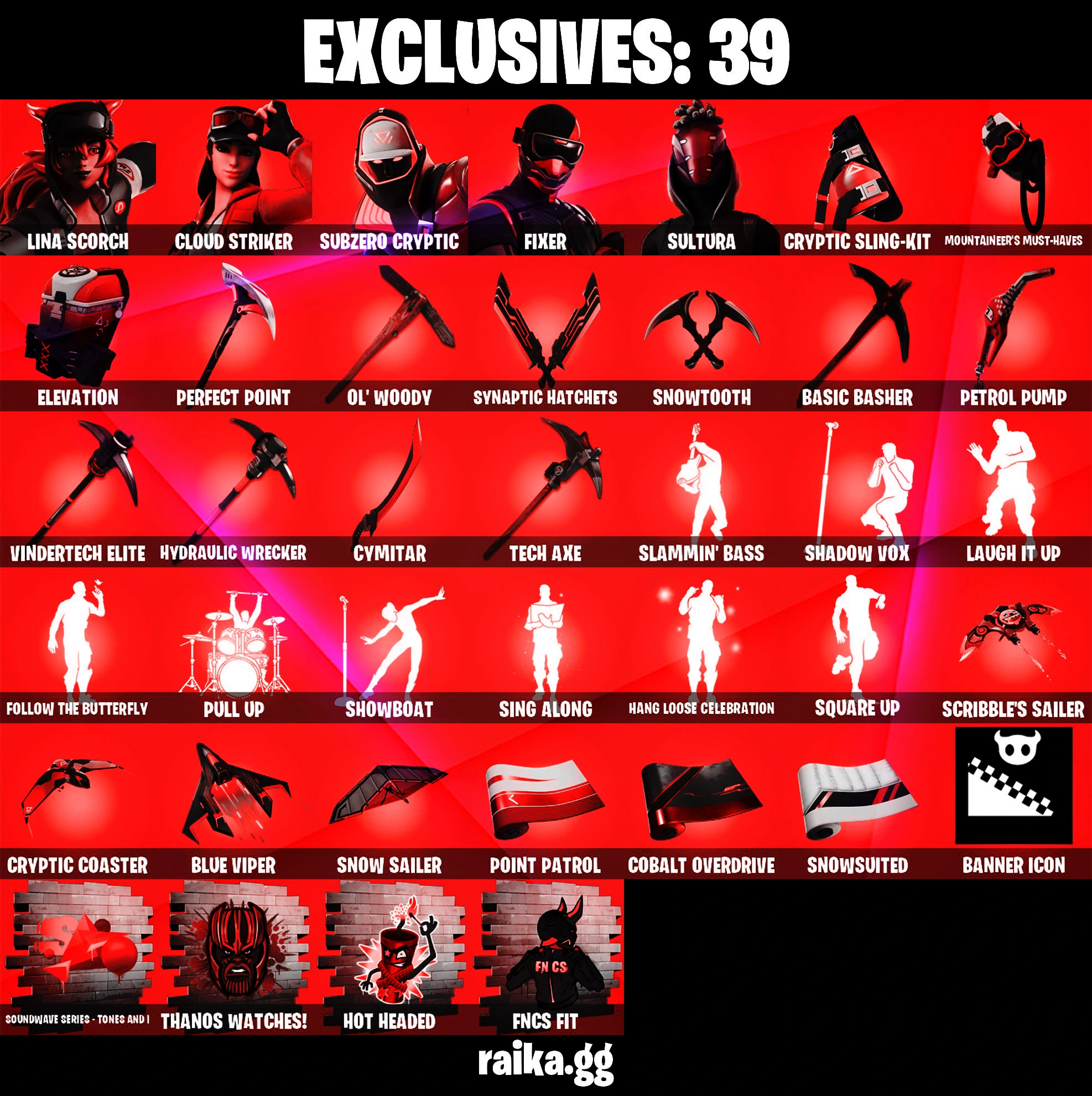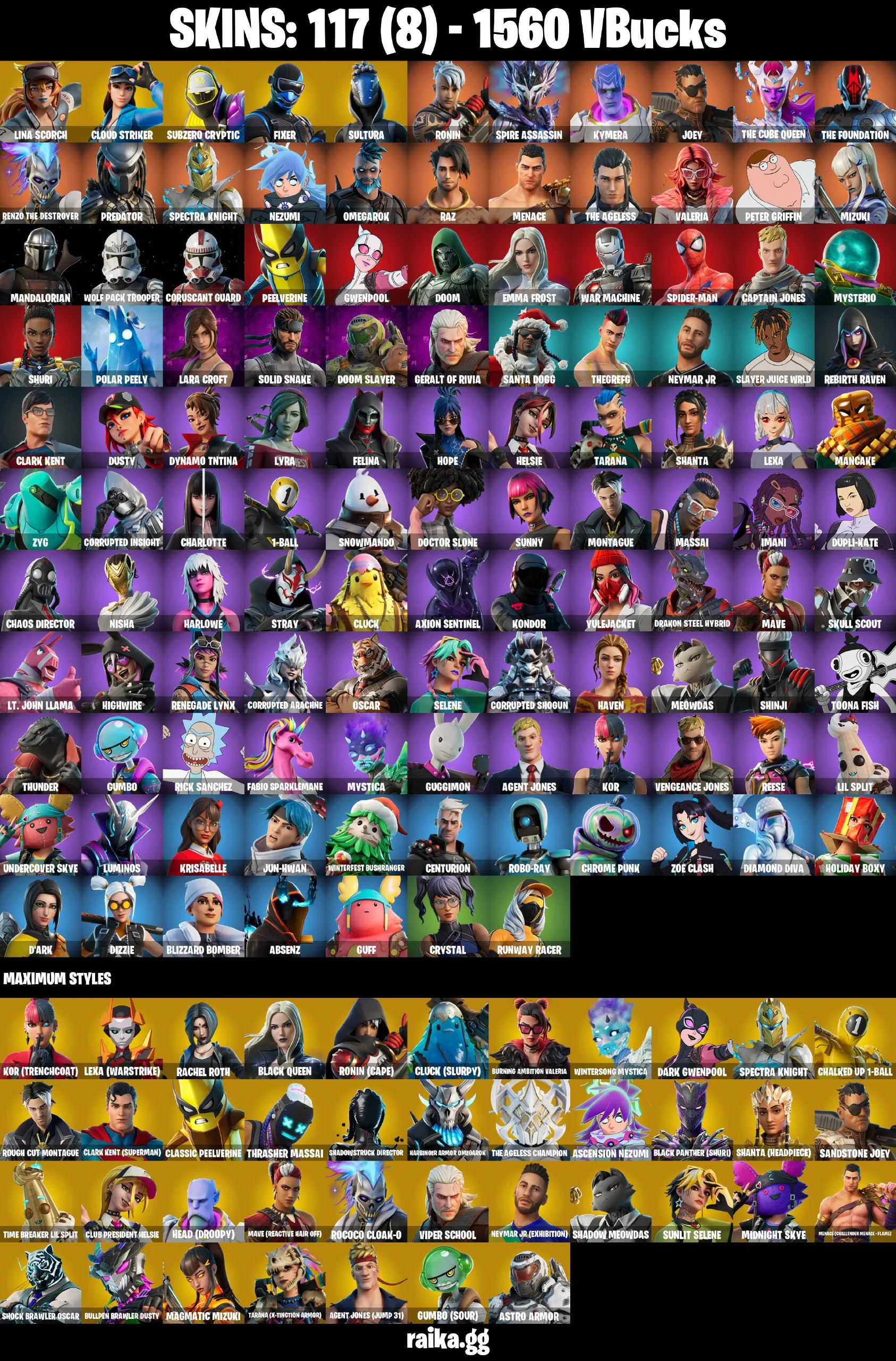 πβ¨LIMITED RARE ACCOUNTβ¨π 117 SKINS π LINA SCORCH π CLOUD STRIKER π SUBZERO CRYPTIC π FIXER π SULTURA π RONIN π SPIRE ASSASSIN π KYMERA π JOEY π THE CUBE QUEEN π THE FOUNDATION π RENZO THE DESTROYER π PREDATOR π SPECTRA KNIGHT π 1560 VBUCKS β‘οΈPC/PSN/XBOXβ‘οΈ