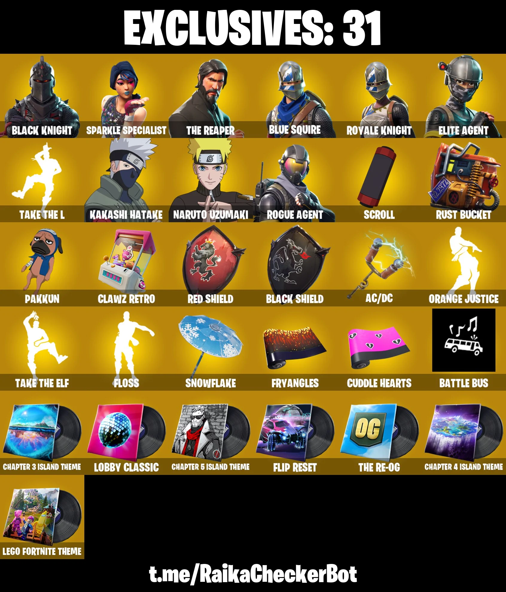 π₯𧨠OG ACCOUNT π§¨π₯ 42 skins π Black Knight π Sparkle Specialist π The Reaper π Blue Squire π Royale Knight π Elite Agent π Take The L π Floss π Naruto Uzumaki π Red Knight π Kakashi Hatake π Drift π Charlotte π Full Access π PC\PSN\XBOX\SWITCH π