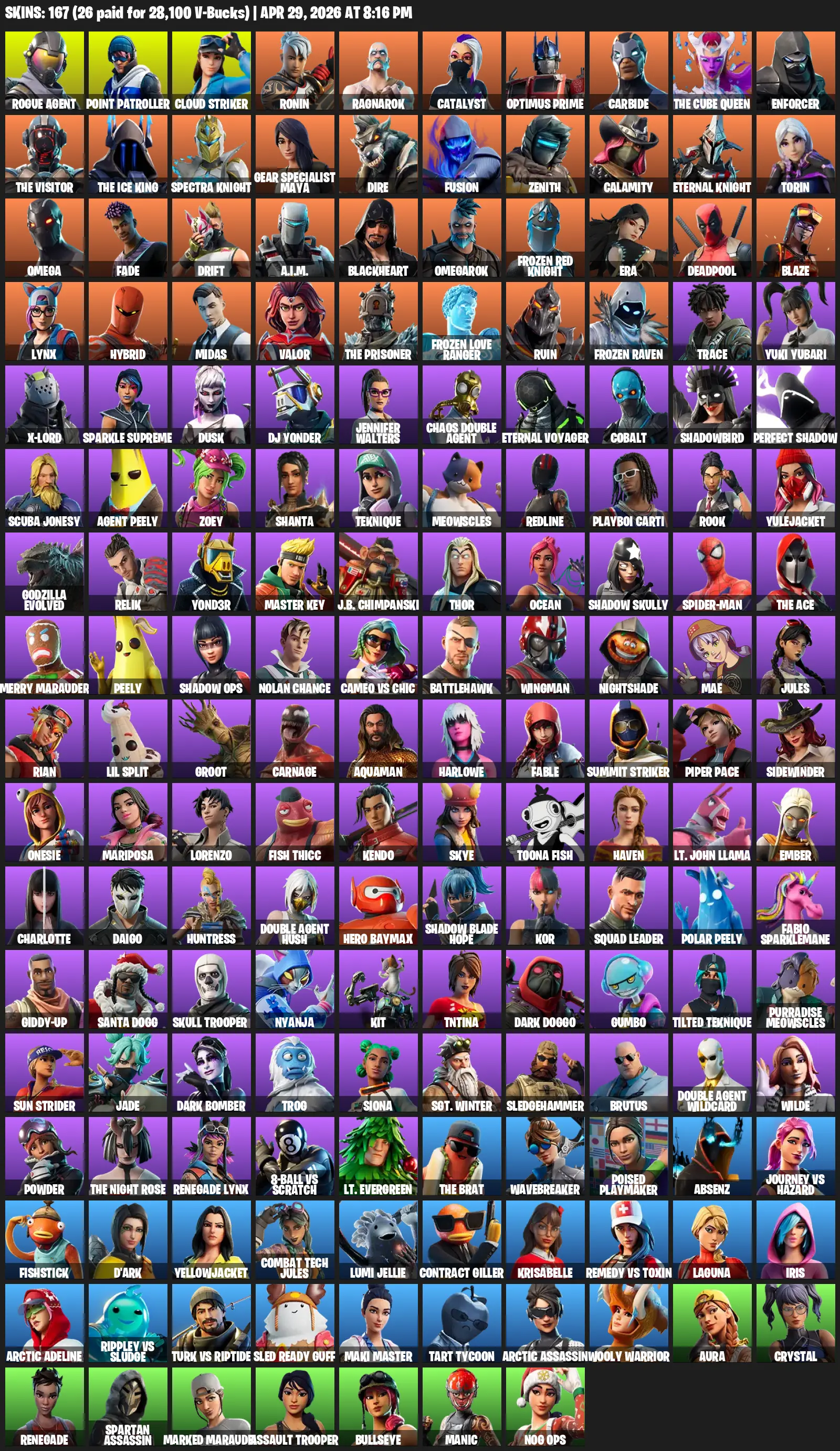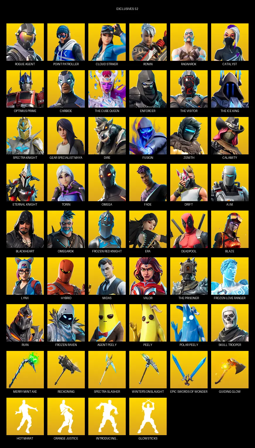 [PC] | 167 skins | Merry Mint Axe | Omega | Rogue Agent | Point Patroller | Cloud Striker | Ronin | Ragnarok | Catalyst | Optimus Prime | #THQ7897