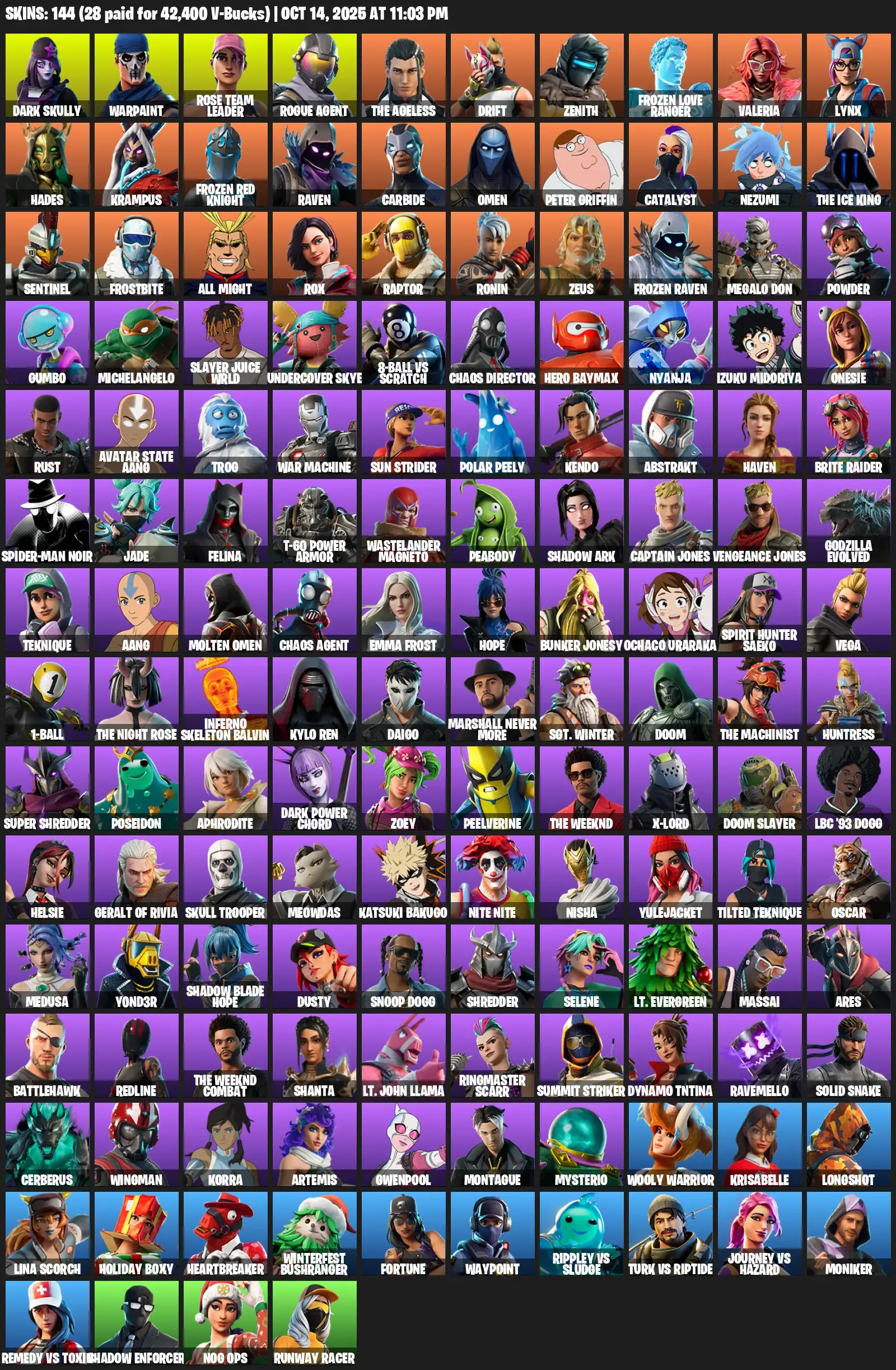 [PC] | 144 skins | OG STW | Dark Skully | Warpaint | Rose Team Leader | Rogue Agent | The Ageless | Drift | Zenith | #UBV8524 | #MBFN