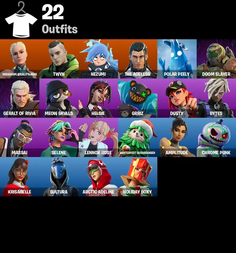 【PC/NS/XBOX/PSN】 22 SKINS 🔥 SULTURA 🔥 NEZUMI 🔥 THE AGELESS 🔥 TWYN 🔥 PARADIGM (REALITY-659) 🔥 POLAR PEELY 🔥 DOOM SLAYER 🔥 GERALT OF RIVIA 🔥 600 VB