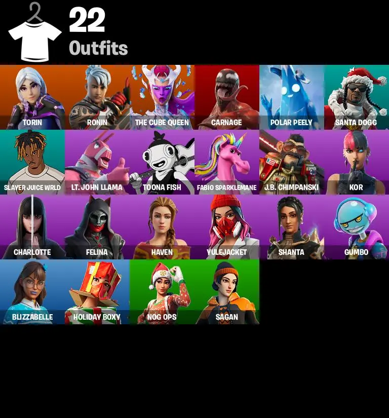 【PC/NS/XBOX/PSN】 22 SKINS 🔥 TORIN 🔥 THE CUBE QUEEN 🔥 RONIN 🔥 CARNAGE 🔥 POLAR PEELY 🔥 SLAYER JUICE WRLD 🔥 SANTA DOGG 🔥 HAVEN 🔥 0 VB
