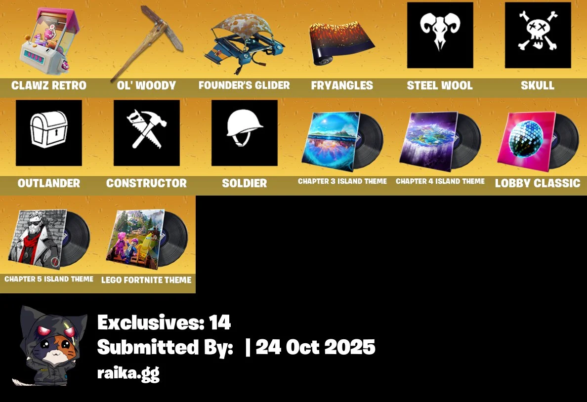 [PC/PSN/XBOX] 0 skins | OG STW | Clawz Retro | Ol' Woody | Ride The Pony | Founder's Glider | Steel Wool | Skull | Outlander | Constructor | Soldier |
