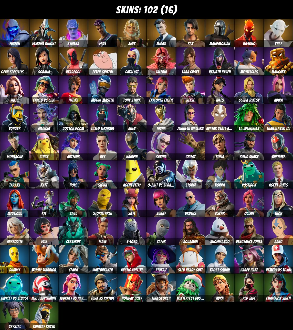 ⚡PC/PSN/XBOX⚡ 102 skins 💎 Candy Axe 💎 Deadpool 💎 Tony Stark 💎 Lara Croft 💎 Midas 💎 Mandalorian 💎 Jules 💎 Aura 💎 Agent Peely 💎 Catalyst 💎 Zeus 💎 Caper 💎 Meowscles 💎 Thor 💎 Dummy 💎 Crystal 💎 Snap 💎 TNTina 💎 Brutus 💎 Fusion 💎 Eternal Knight 💎 550 V-Bucks 💎