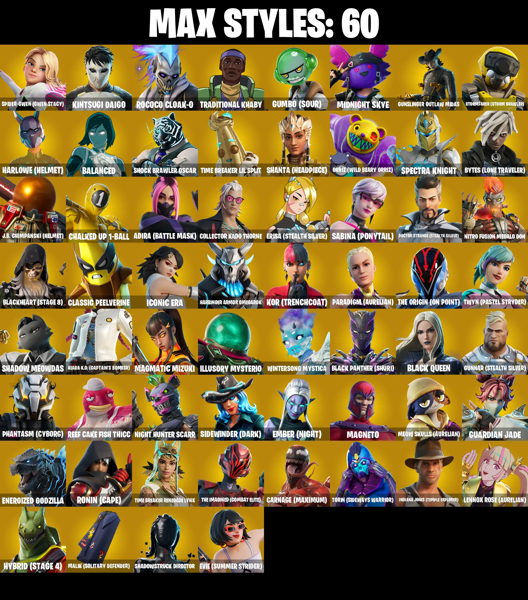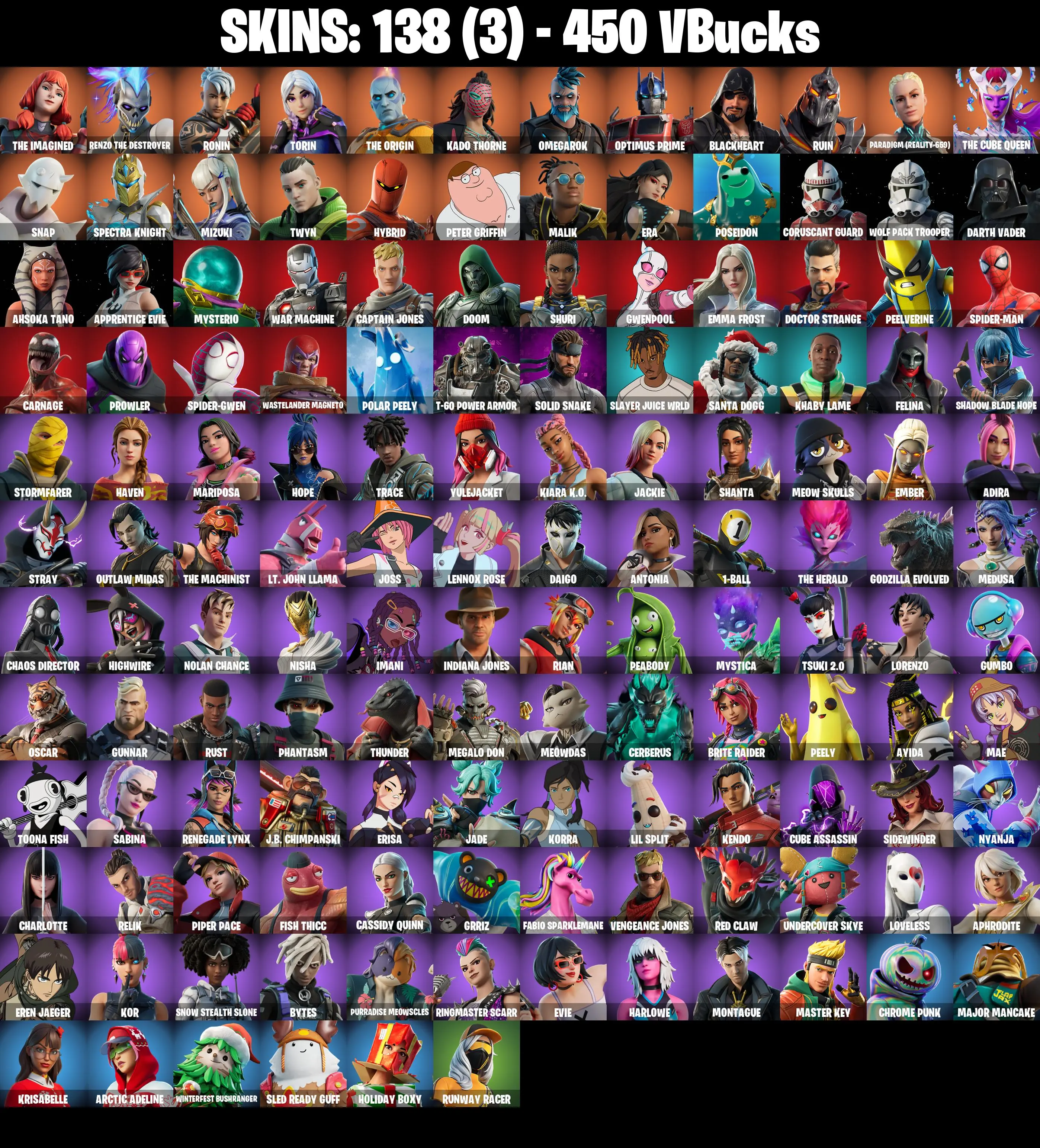 PC/PSN/XBOX ♨️138 skins ✨ Spider-Gwen ✨ Peely ✨ Spider-Man ✨ Carnage ✨ Doctor Strange ✨ Darth Vader ✨ Mizuki ✨ Optimus Prime ✨ Kado Thorne ✨ #B733