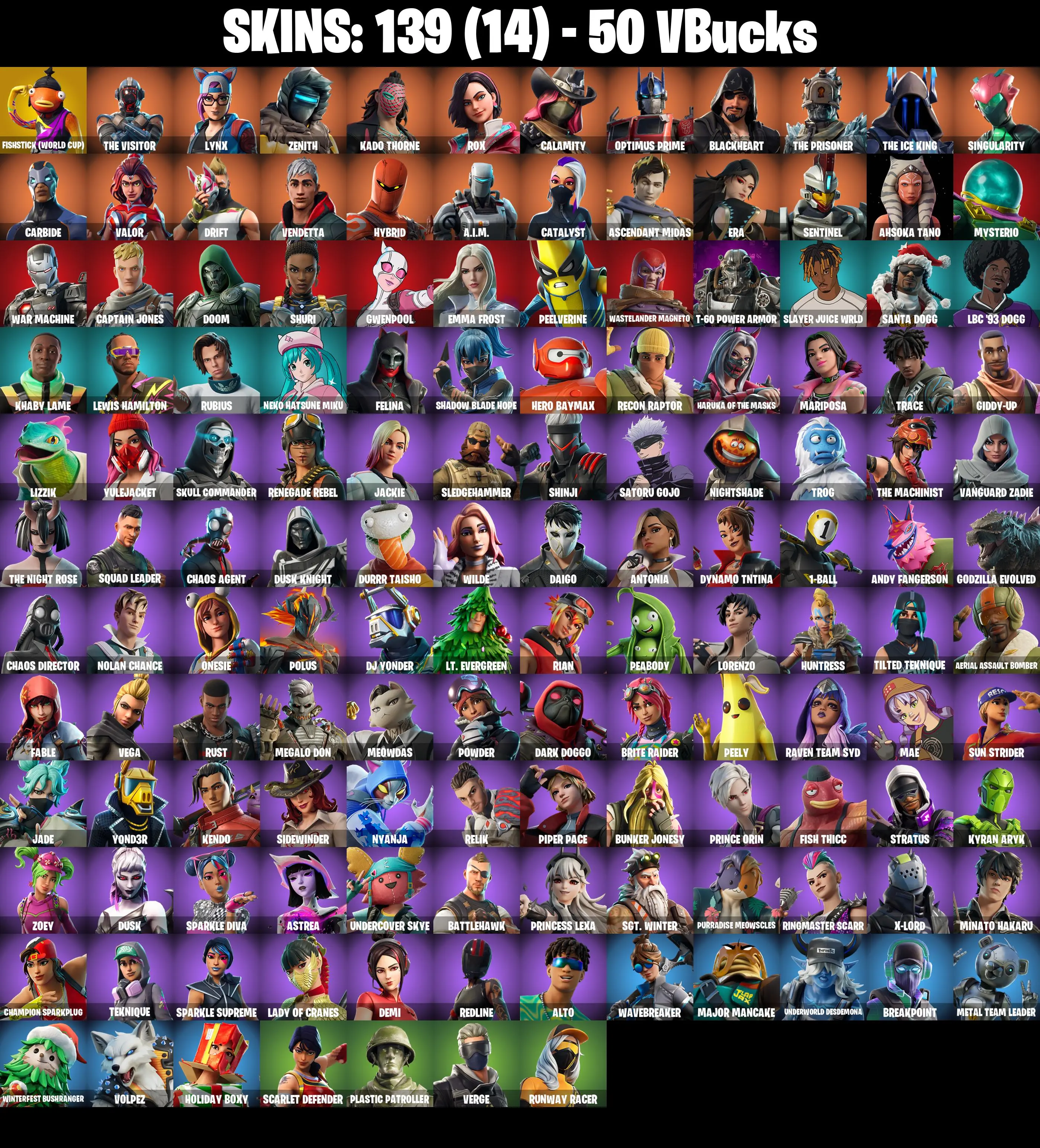 PC/PSN/XBOX ♨️139 skins ✨ Satoru Gojo ✨ Reaper ✨ Orange Justice ✨ Drift ✨ Carbide ✨ Jabba Switchway ✨ The Ice King ✨ Peely ✨ Vendetta ✨ #B732