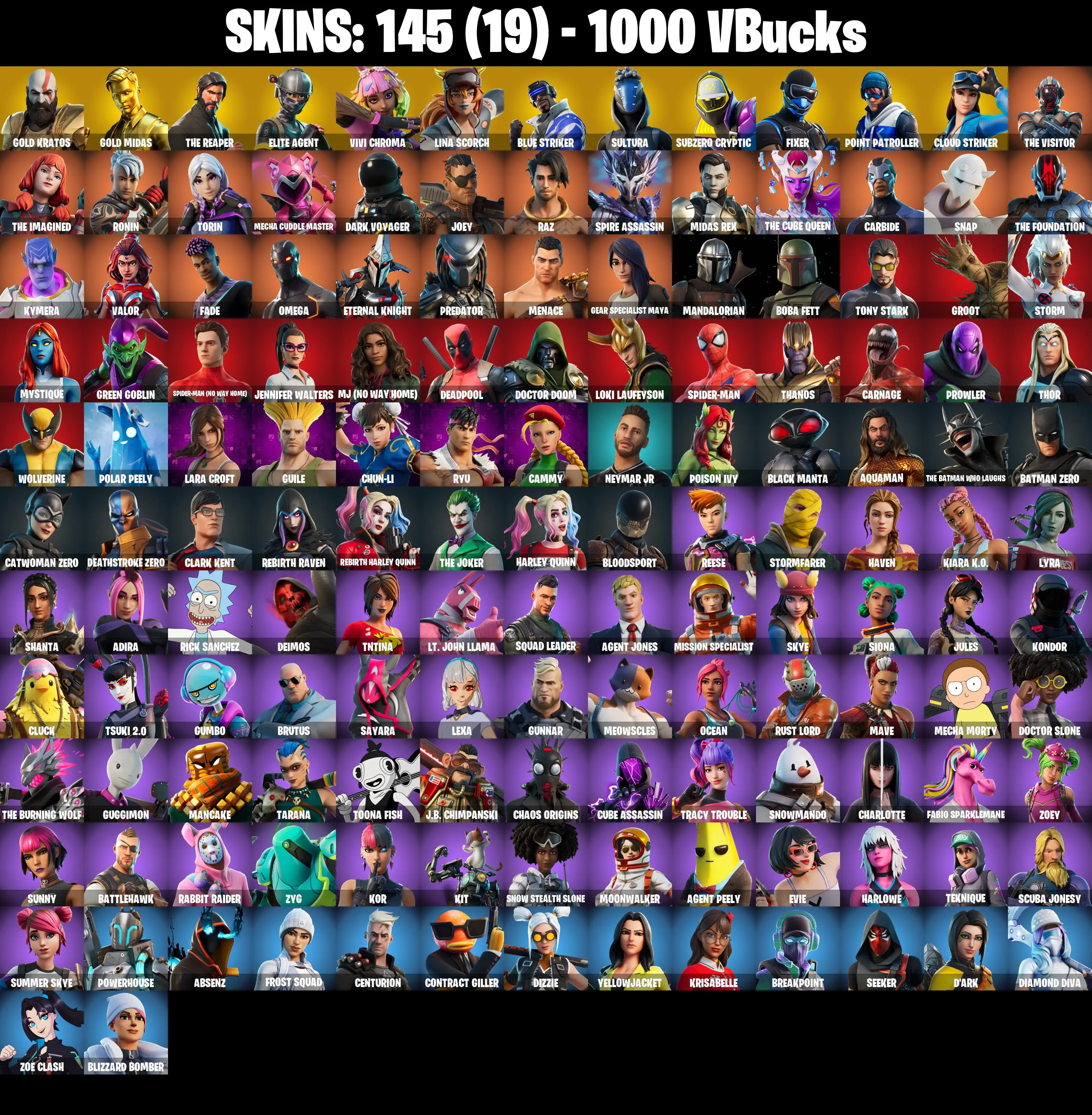 PC/PSN/XBOX ♨️145 skins ✨ Ryu ✨ Cammy ✨ Leviathan Axe ✨ Chun-Li ✨ Lara Croft ✨ Deadpool ✨ Gold Kratos ✨ Gold Midas ✨ The Reaper ✨ Elite Agent ✨ #B727