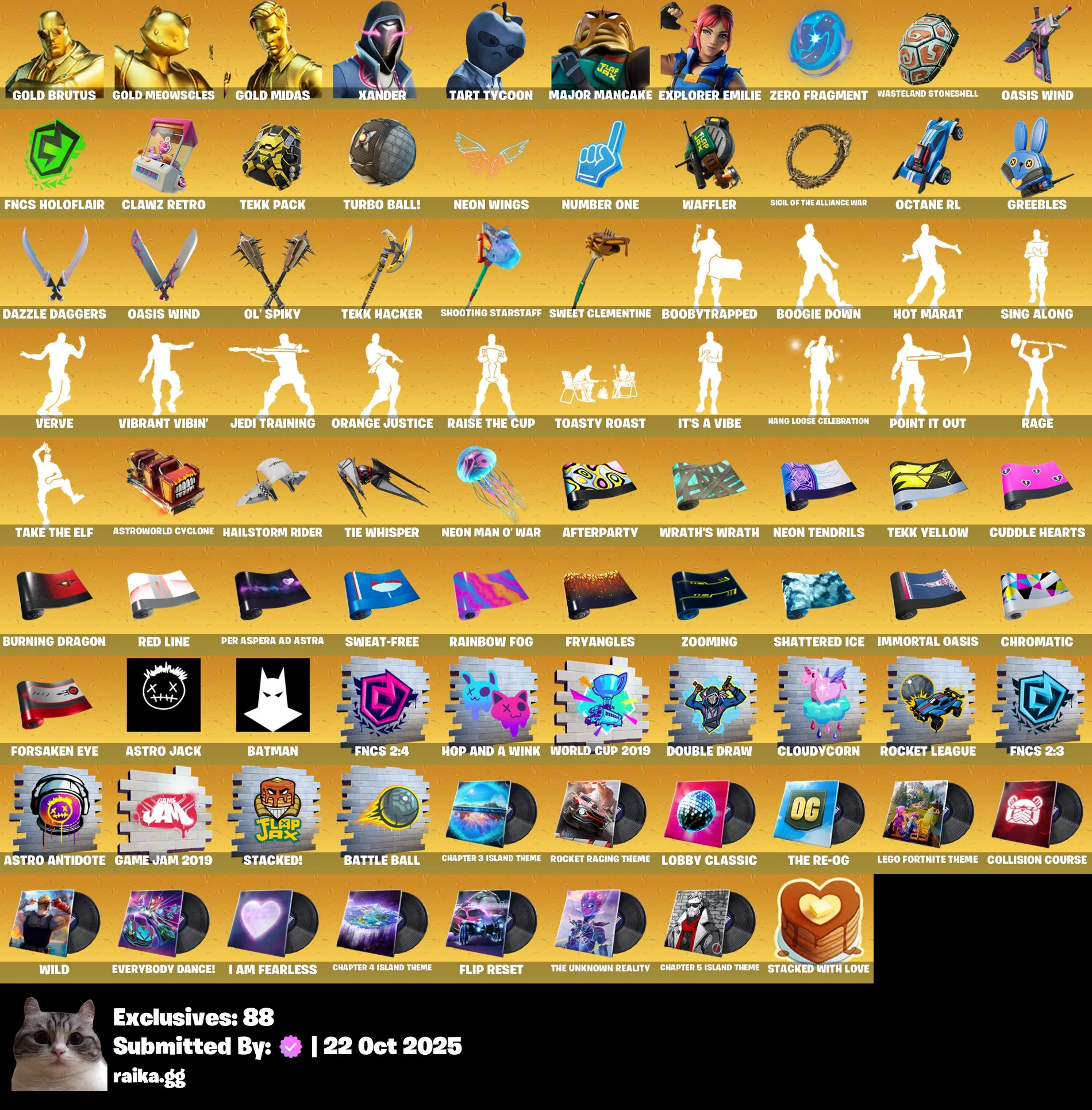 [PC/PSN/XBOX] 163 skins | Gold Brutus | Gold Meowscles | Gold Midas | Xander | Tart Tycoon | Explorer Emilie | Burning Ambition Valeria | Gold | Kalam