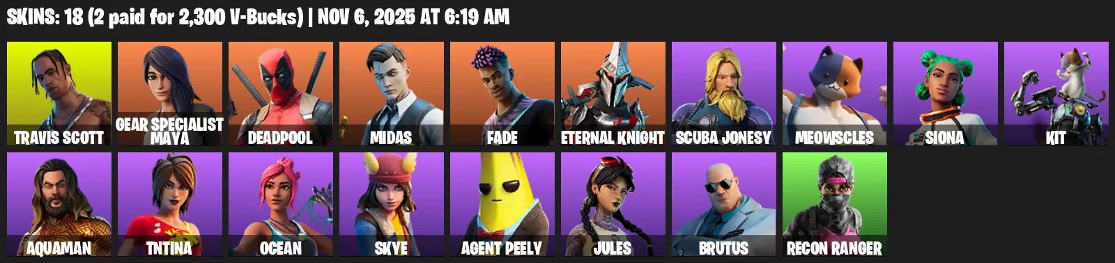 [PC/PSN/XBOX] | 18 skins | Travis Scott | Gear Specialist Maya | Deadpool | Midas | Fade | Eternal Knight | Scuba Jonesy | Meowscles | Siona | S4G