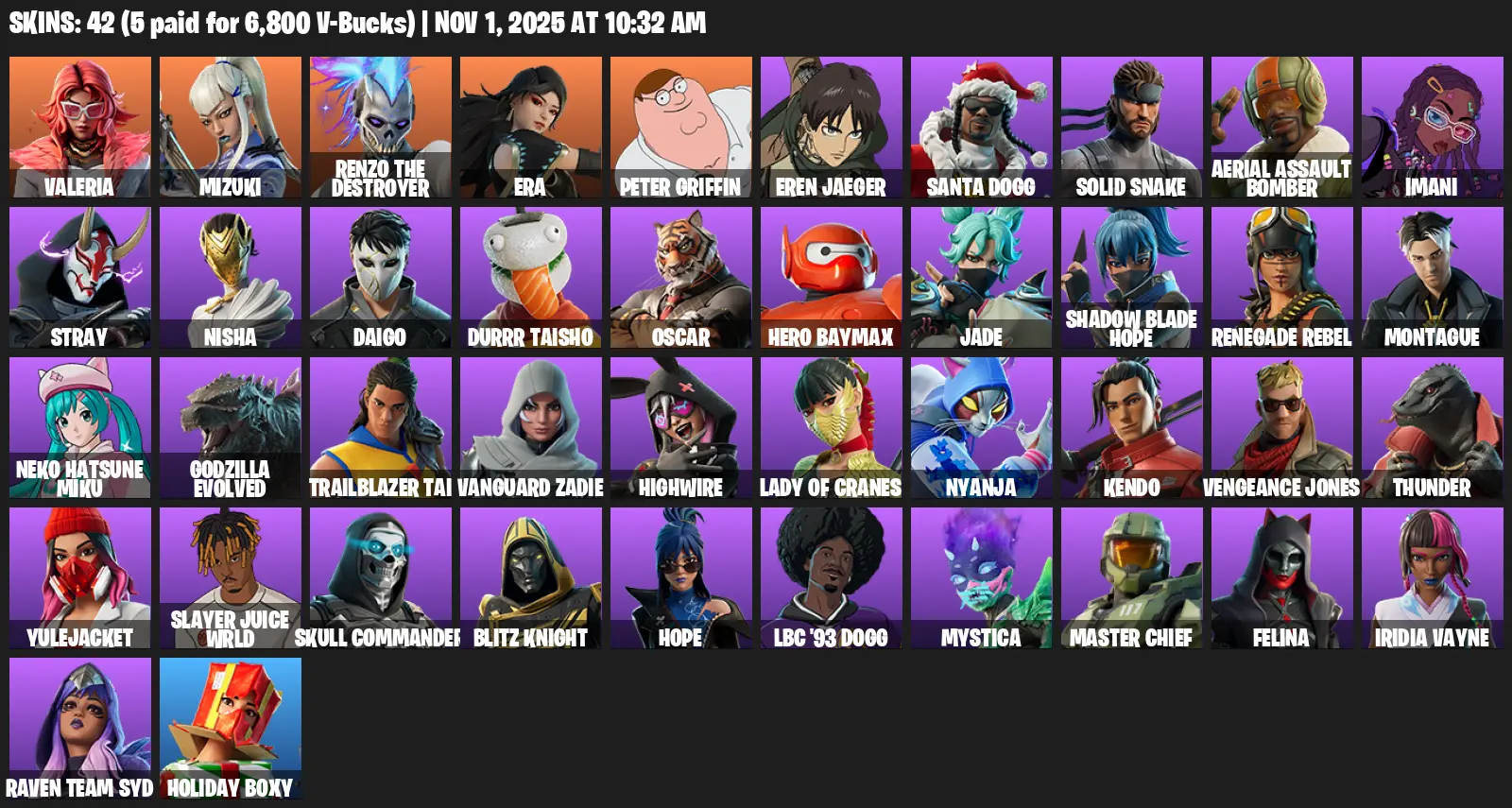 π¨ [PC/PSN/XBOX] π 42 skins | Valeria , Mizuki , Renzo the Destroyer , Era , Stray , Daigo , Vanguard Zadie , Highwire , Mystica | π 350 VBUCKS | βοΈ Changeable Email Now