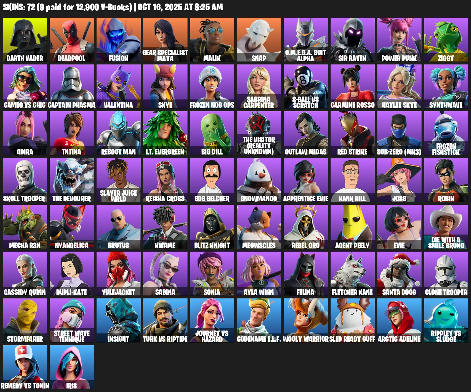 π¨ [PC/PSN/XBOX] π 72 skins | Fusion , Gear Specialist Maya , O.M.E.G.A. Suit Alpha , The Visitor (Reality Unknown) , Outlaw Midas , Rebel Oro , Agent Peely , Mecha R3X , The Devourer | π 150 VBUCKS | βοΈ Changeable Email Now