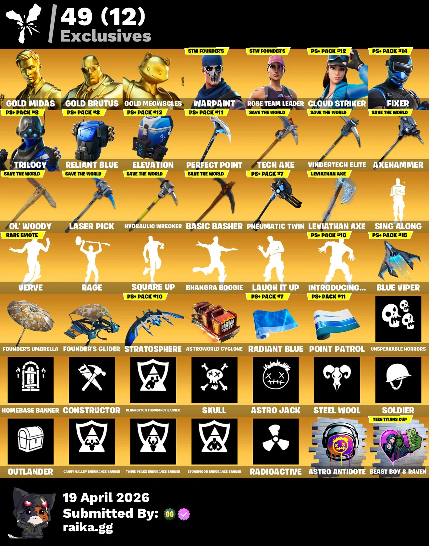 [PC/PSN/XBOX/Nintendo] 101 skins F/A : Leviathan Axe | OG STW | Gold Brutus | Gold Meowscles | Gold Midas | Trilogy | Fixer | Cloud Striker | Raz | Fade | Eternal Knight | Predator | Fusion