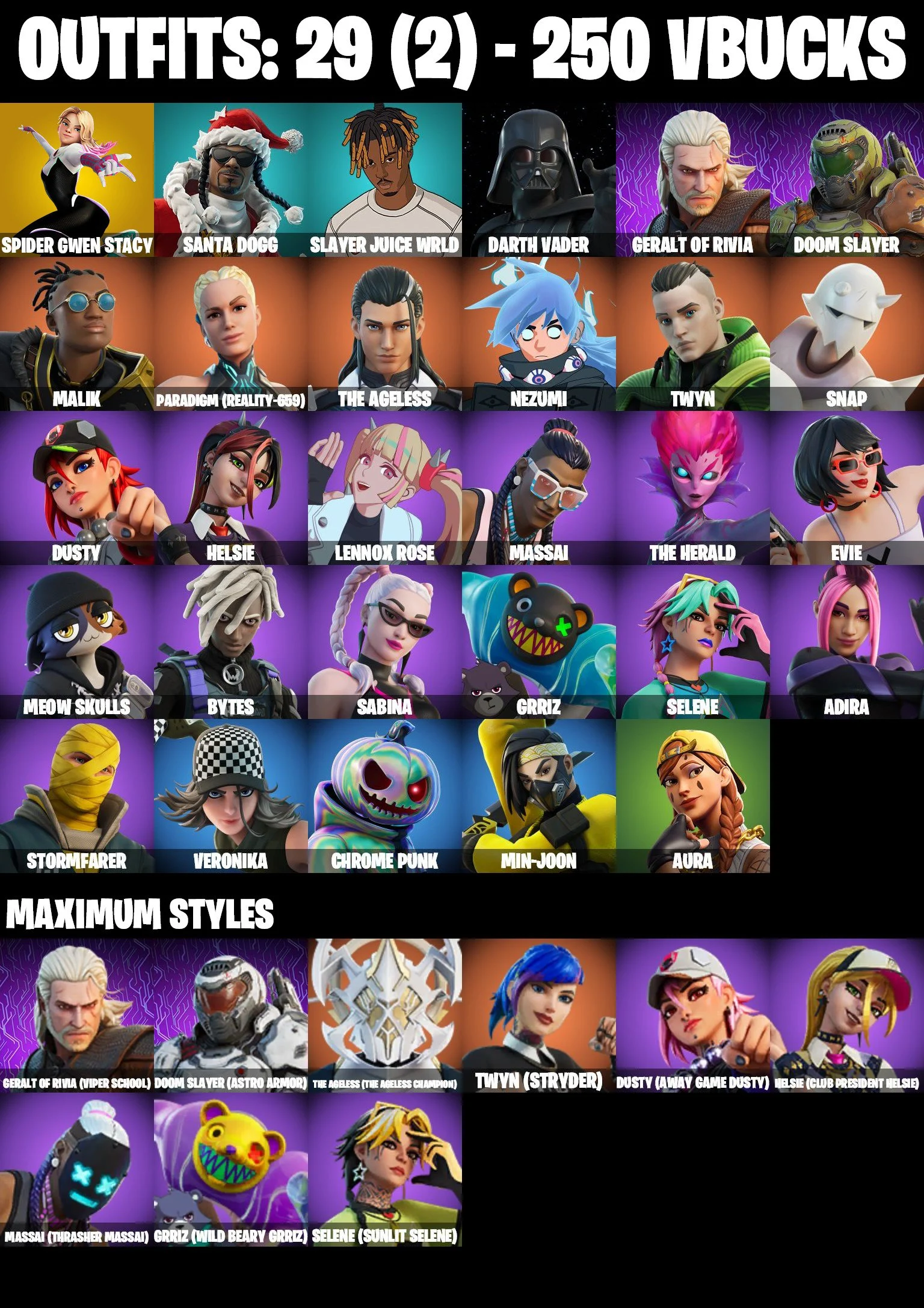 ⭐[PC/PSN/XBOX/NINTENDO/MOBILE] 29 SKINS | SPIDER-GWEN | SANTA DOGG | SLAYER JUICE WRLD | DARTH VADER | GERALT OF RIVIA | DOOM SLAYER | MALIK | PARADIGM (REALITY-659) | THE AGELESS | 250 VBUCKS | FULL E